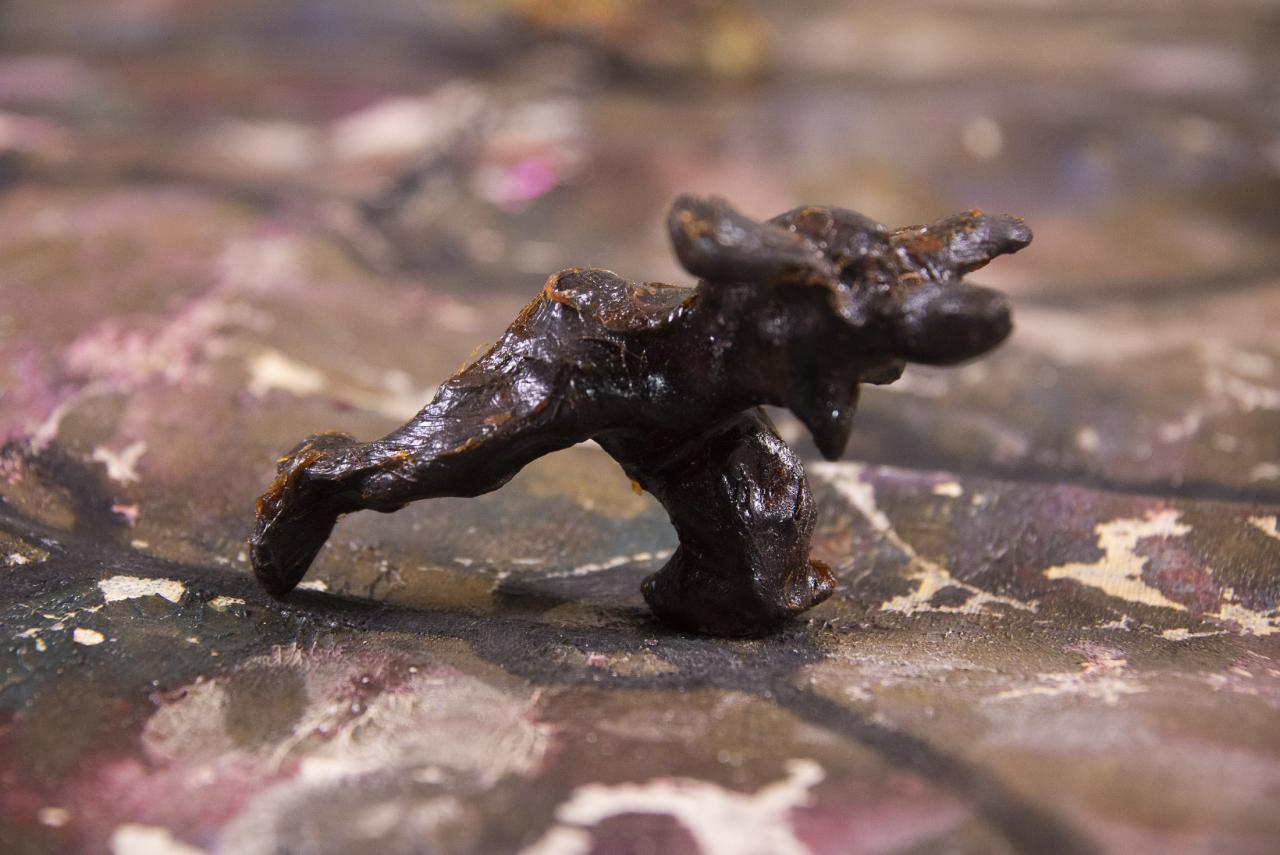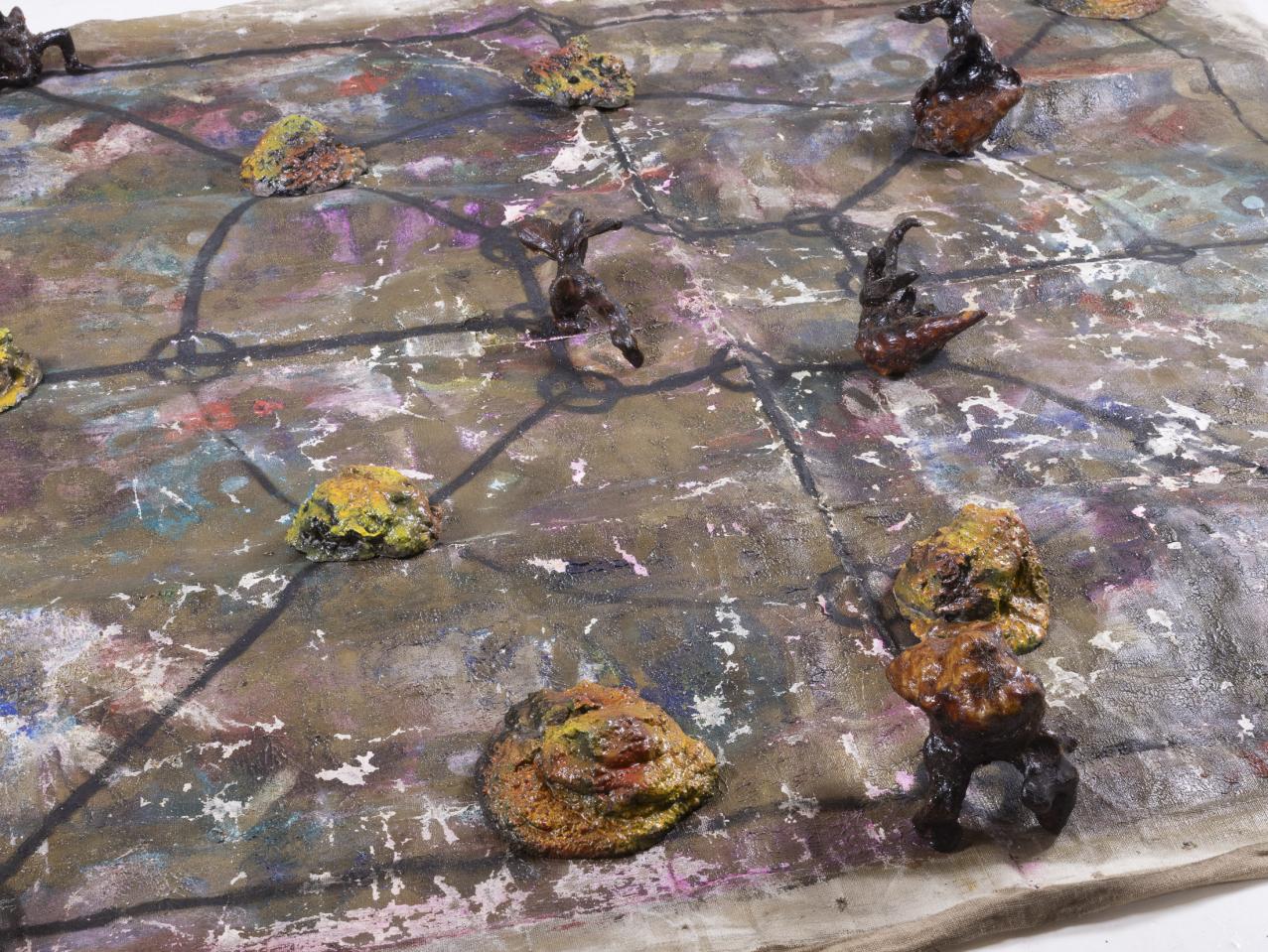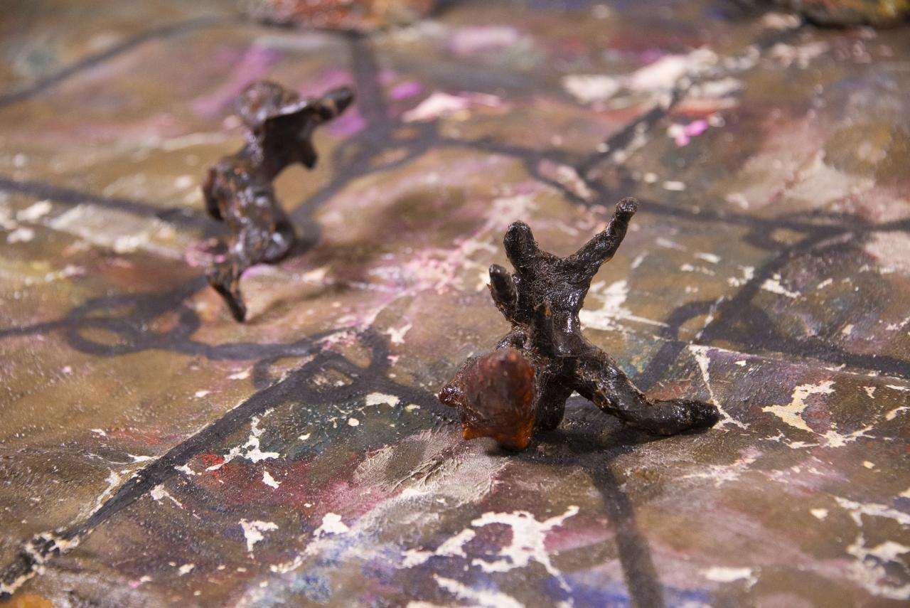11 pions « figurines-coquillages » : modelage en terre crue et coquillage, gangue de résine armée chargée en pigments, dimensions variables.