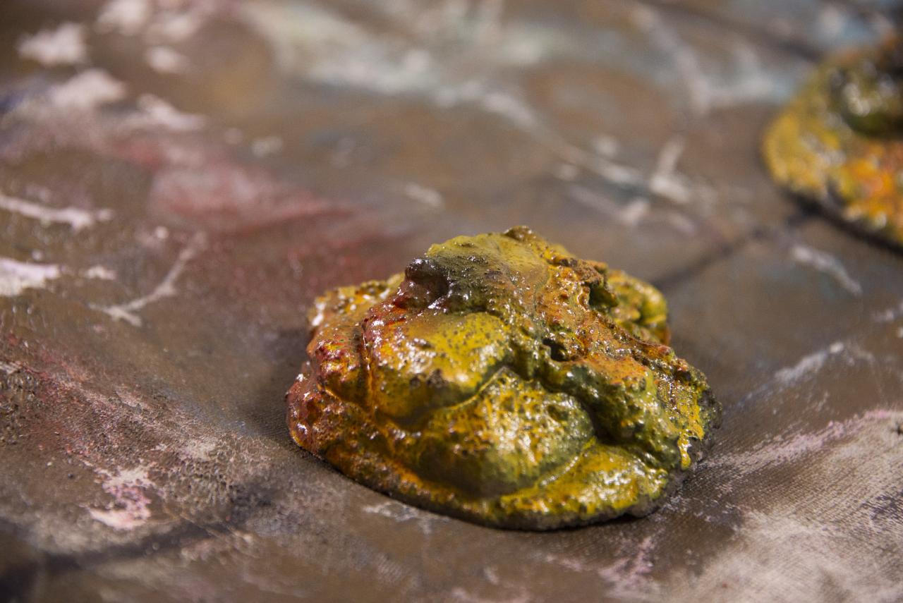 11 pions « merdes-volcans » : ciment peint verni, diamètre 10 cm.