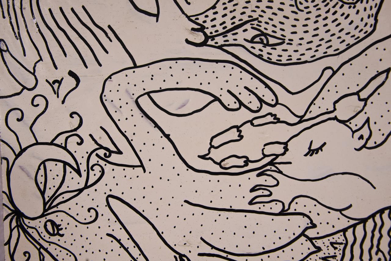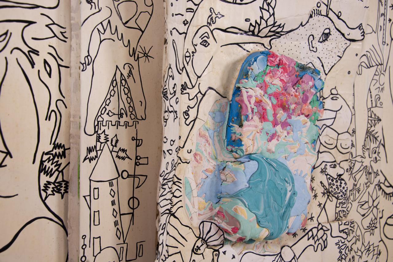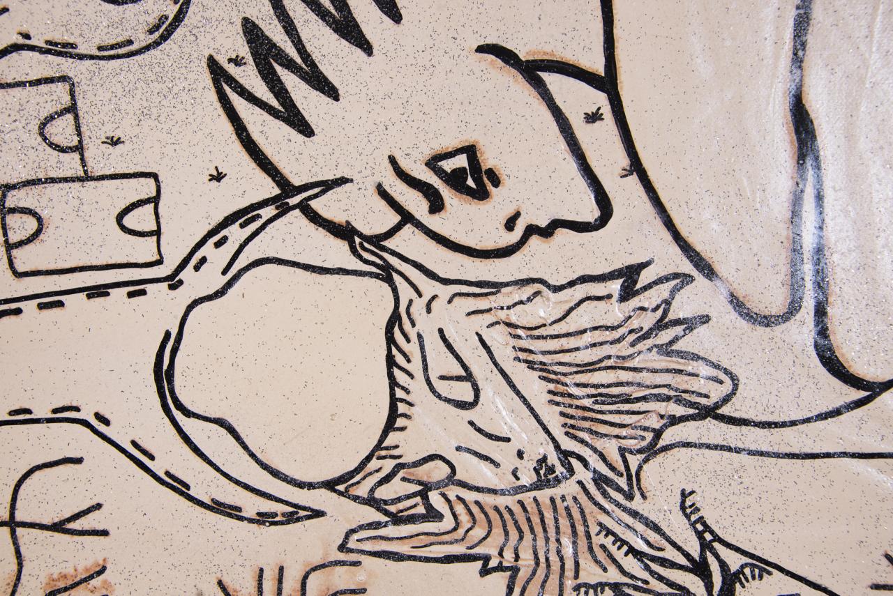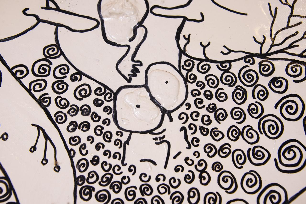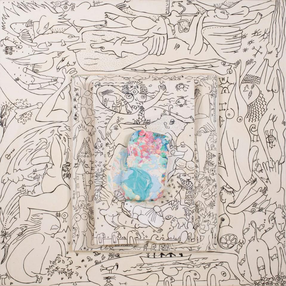 Peinture séchée, stylo feutre et sable sur toile coton sur chassis.