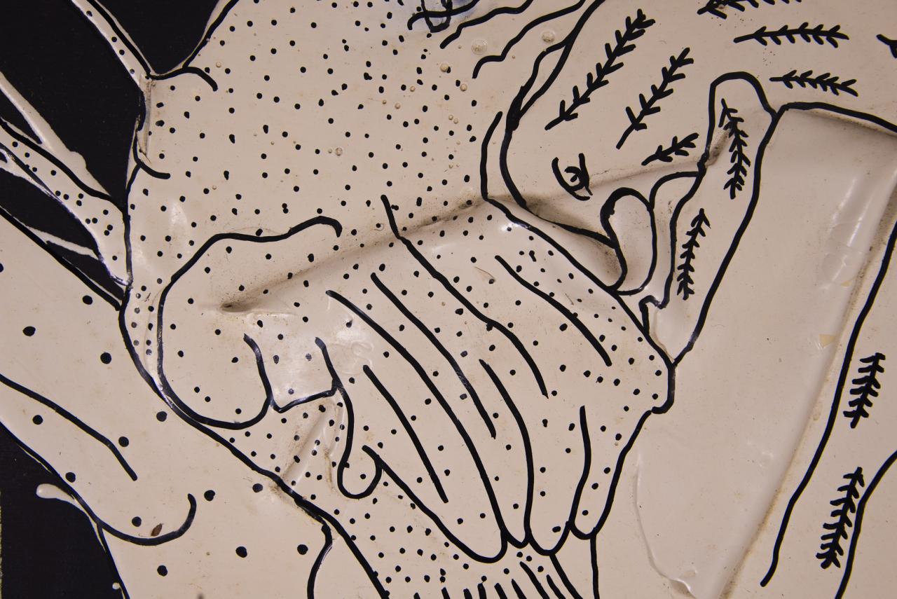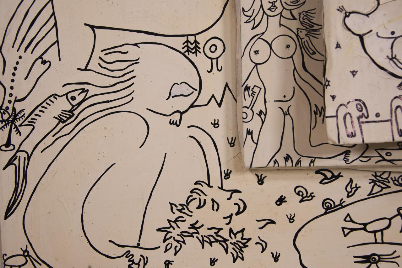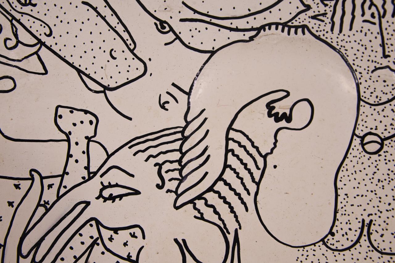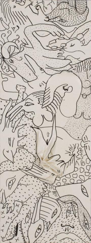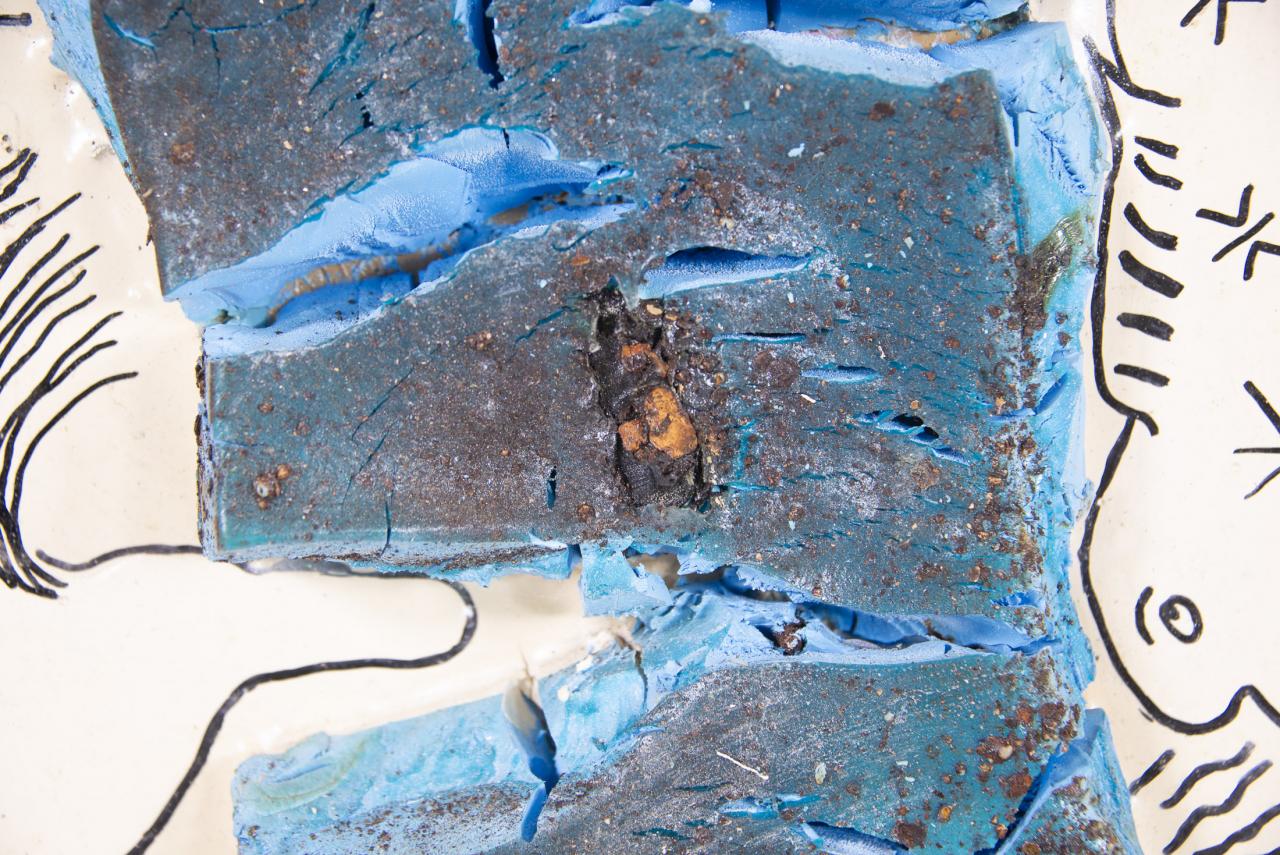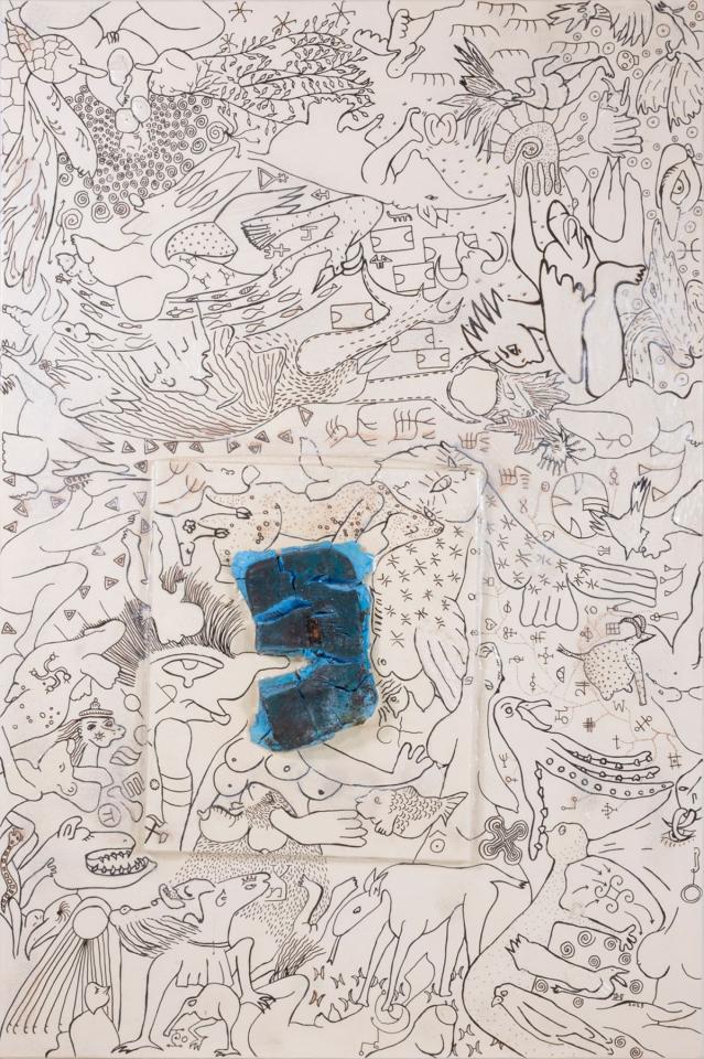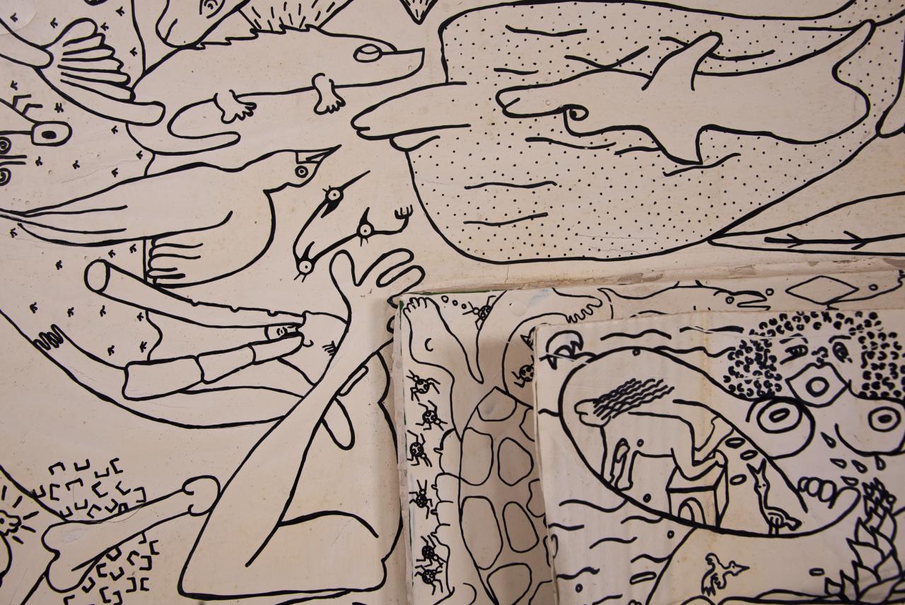 Peinture séchée, stylo feutre et sable sur toile coton sur chassis.