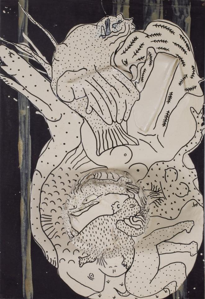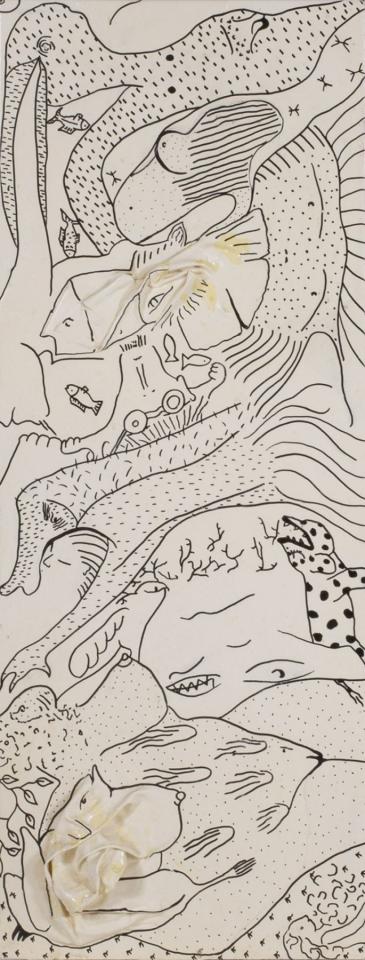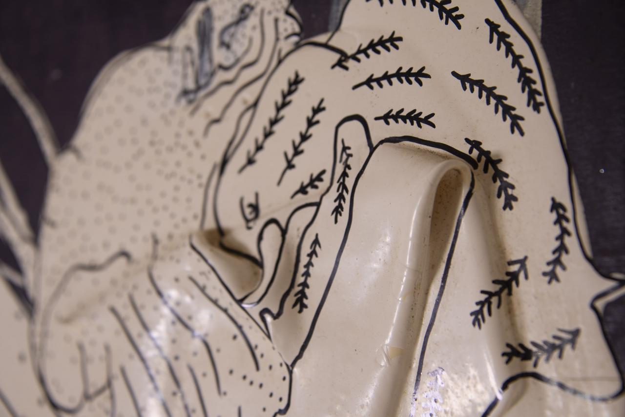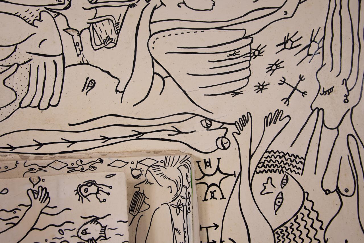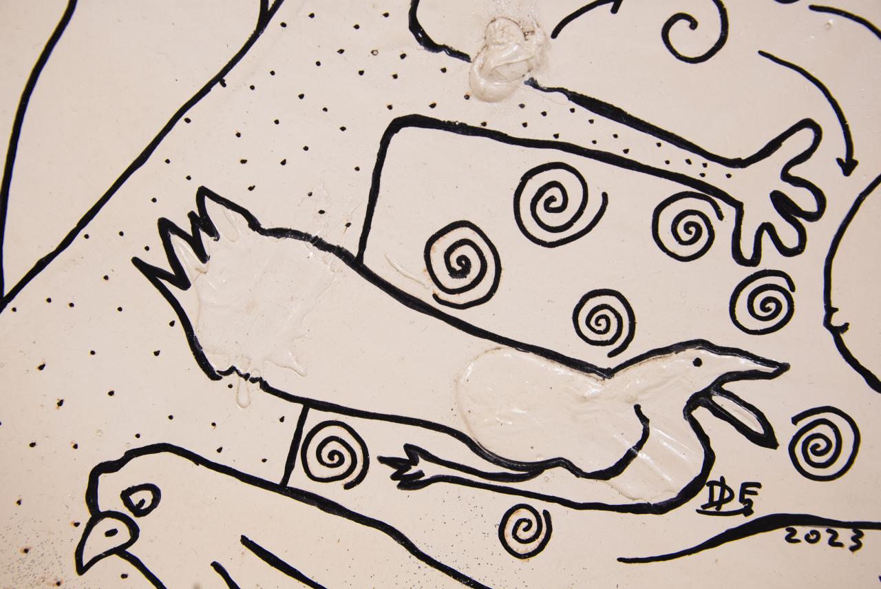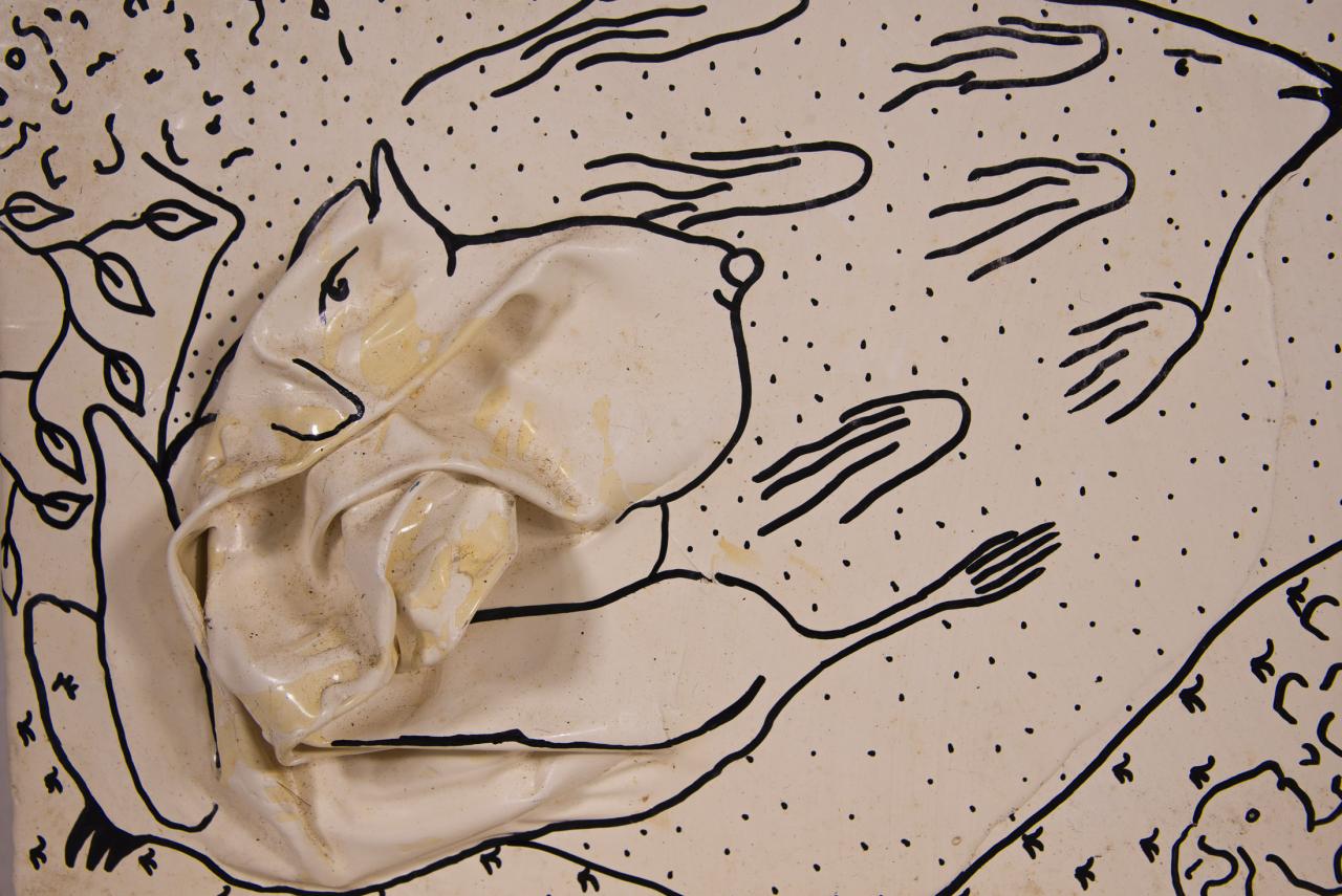 Peinture séchée, stylo feutre et sable sur toile coton sur chassis.