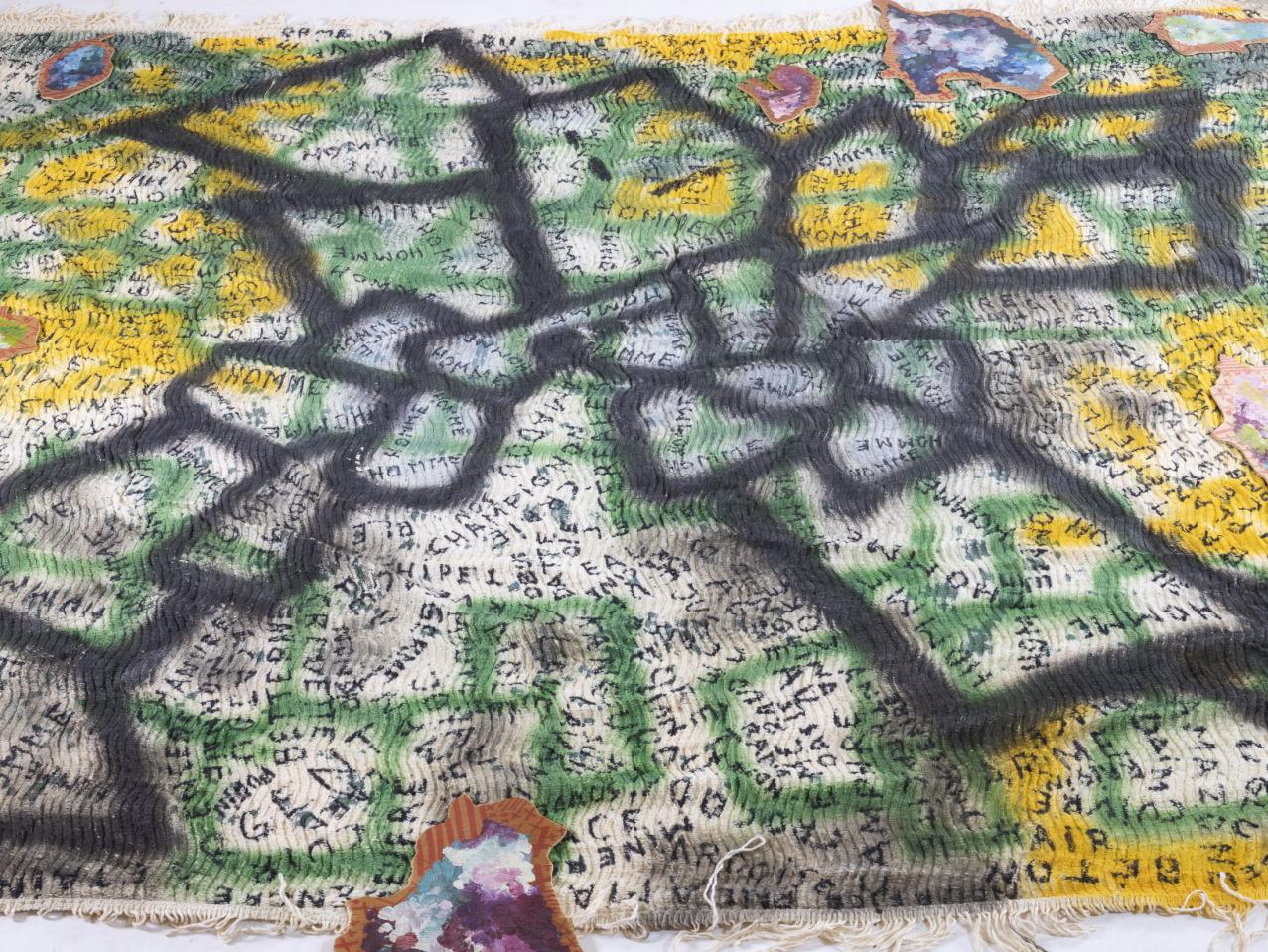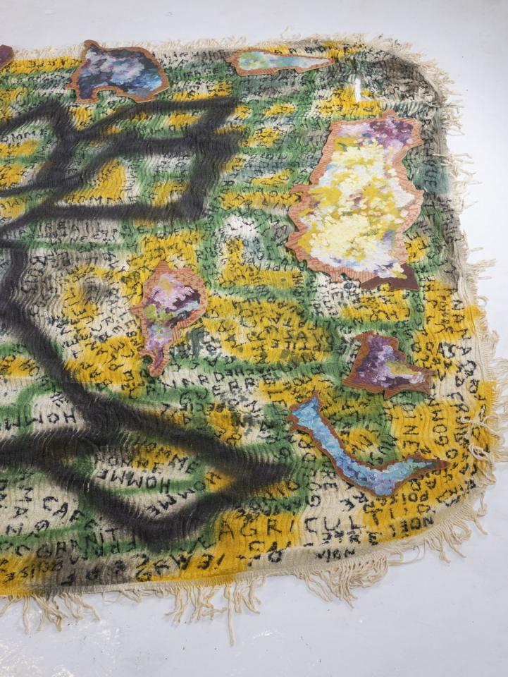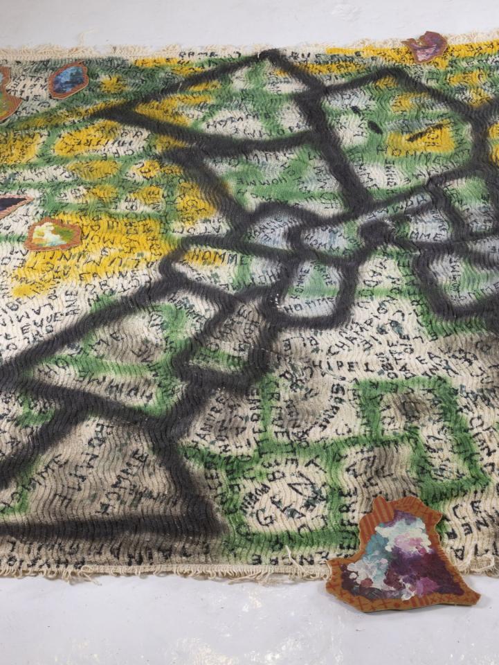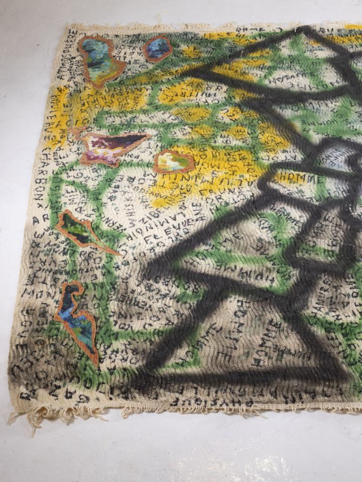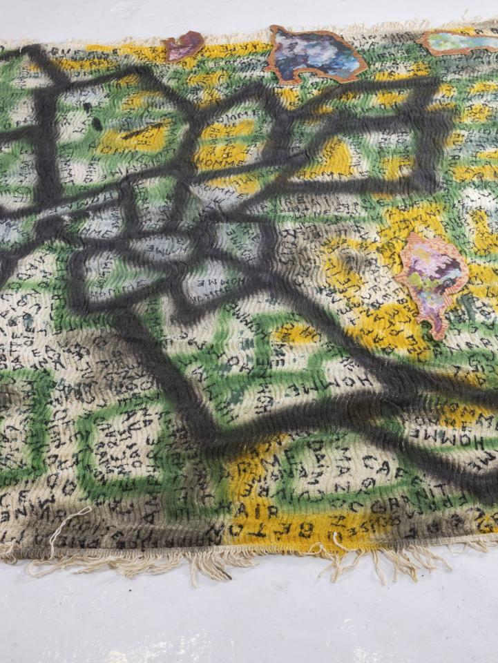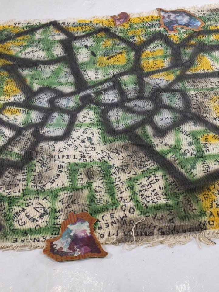 Installation, peinture à la bombe, stylo feutre sur couvre-lit, 230 x 160 cm.