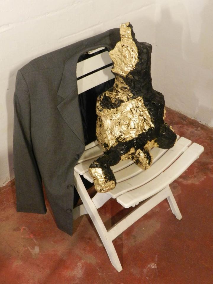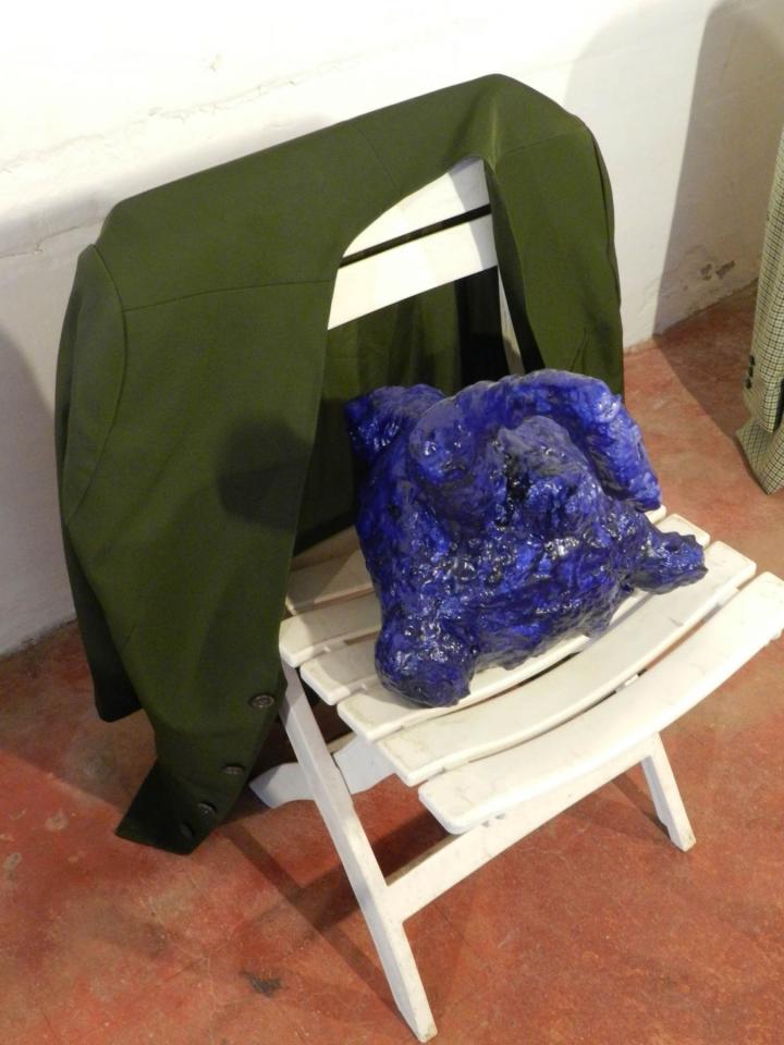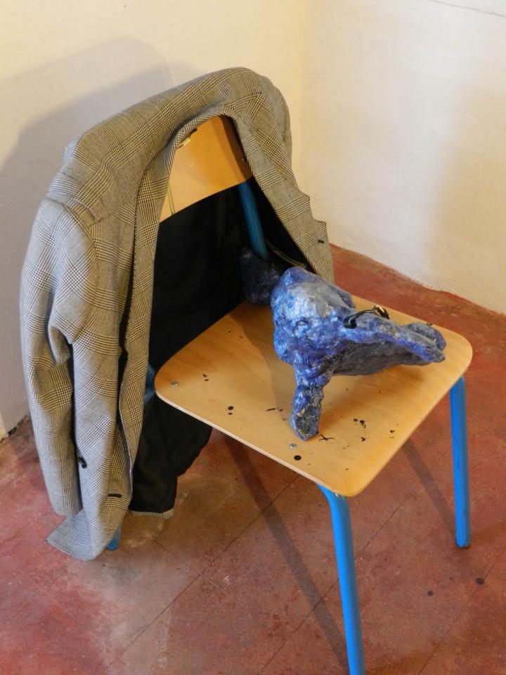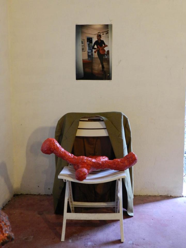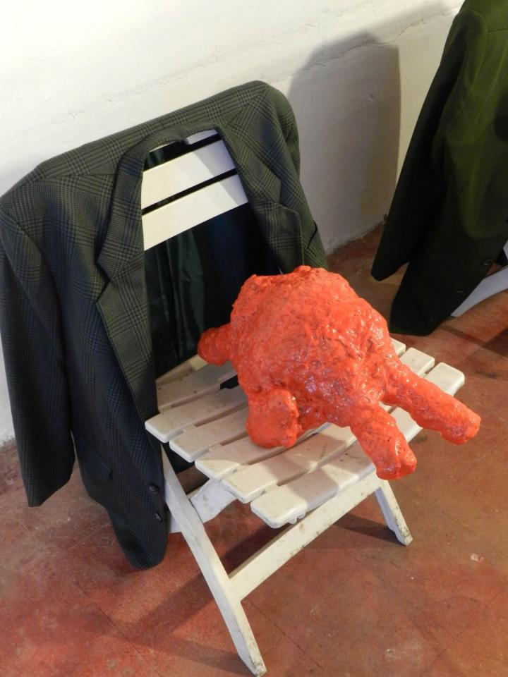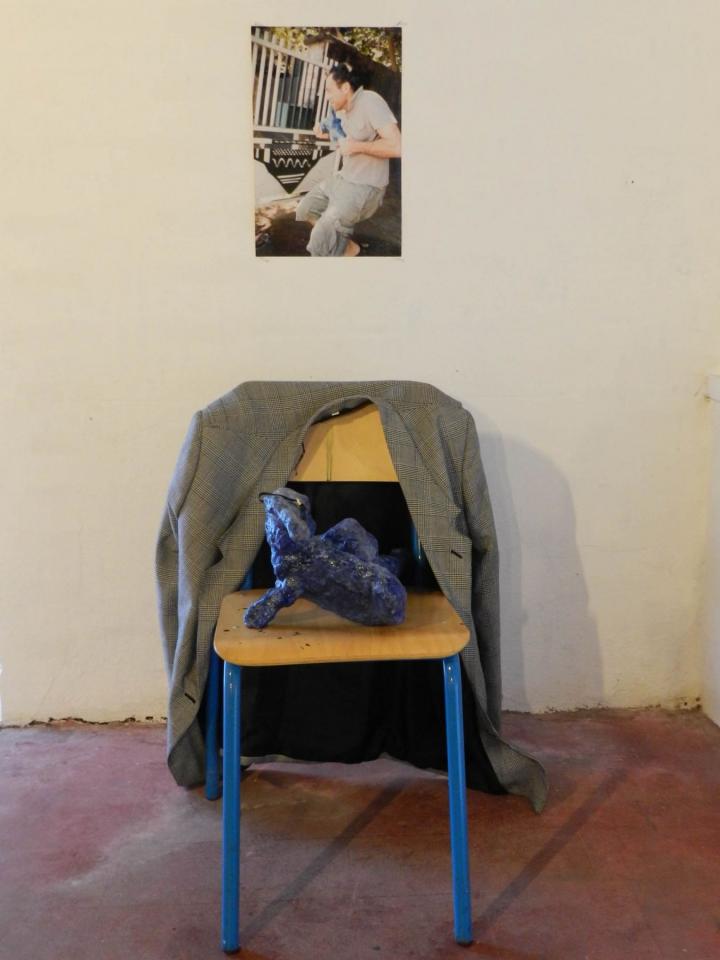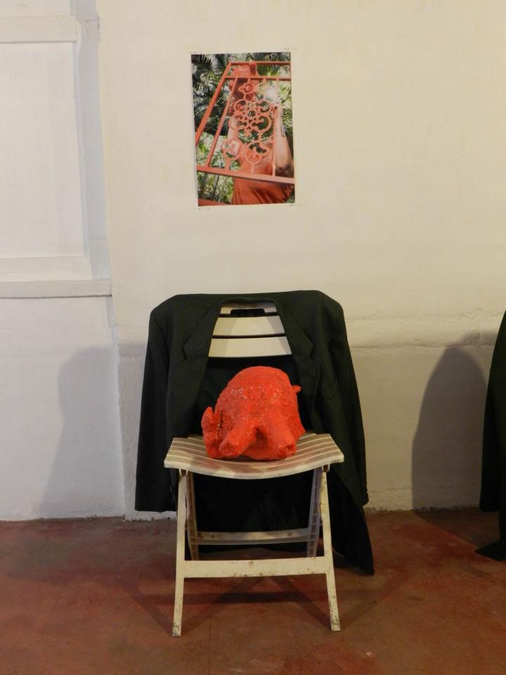Installation, sculptures (…), chaises, vestes, tirages de la série Les Voleurs de trésors.