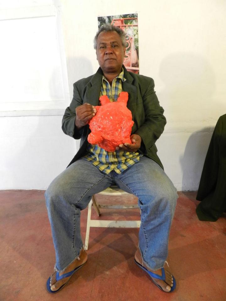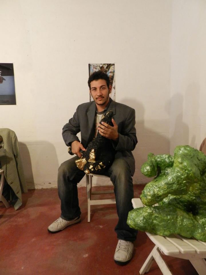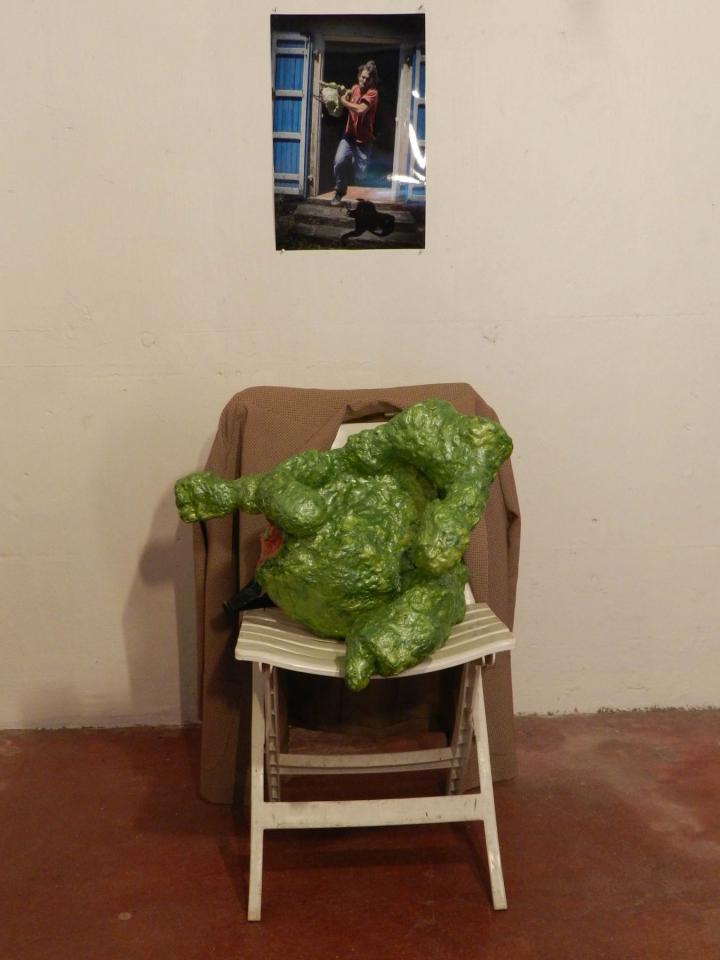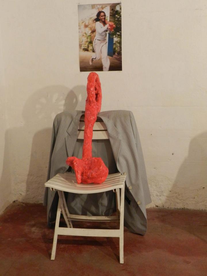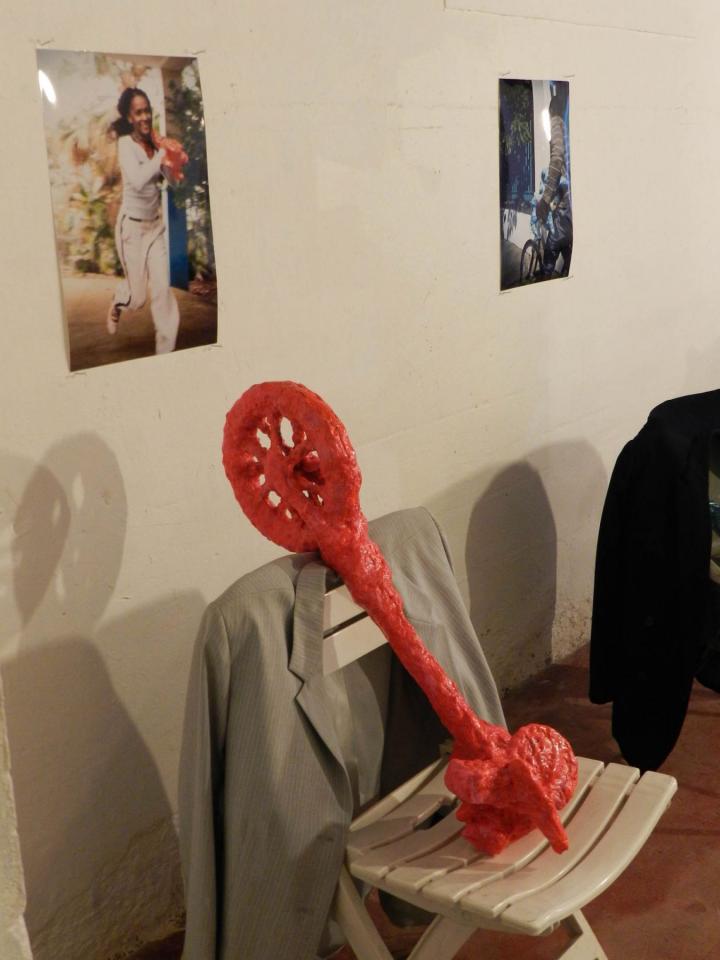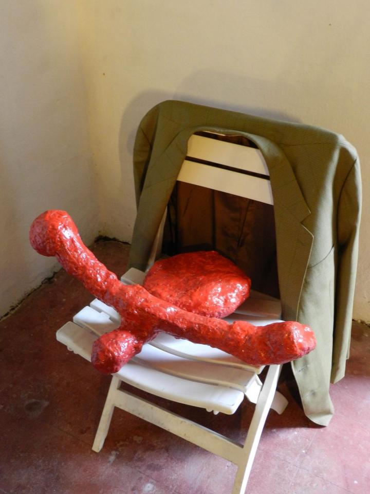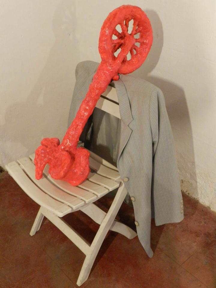 Installation, sculptures (…), chaises, vestes, tirages de la série Les Voleurs de trésors.