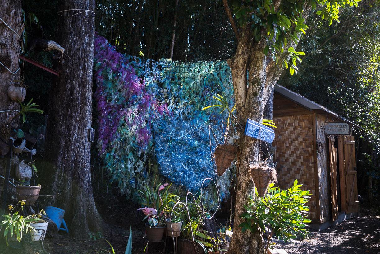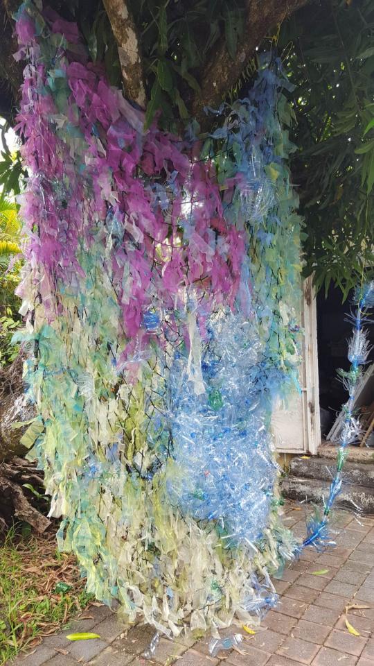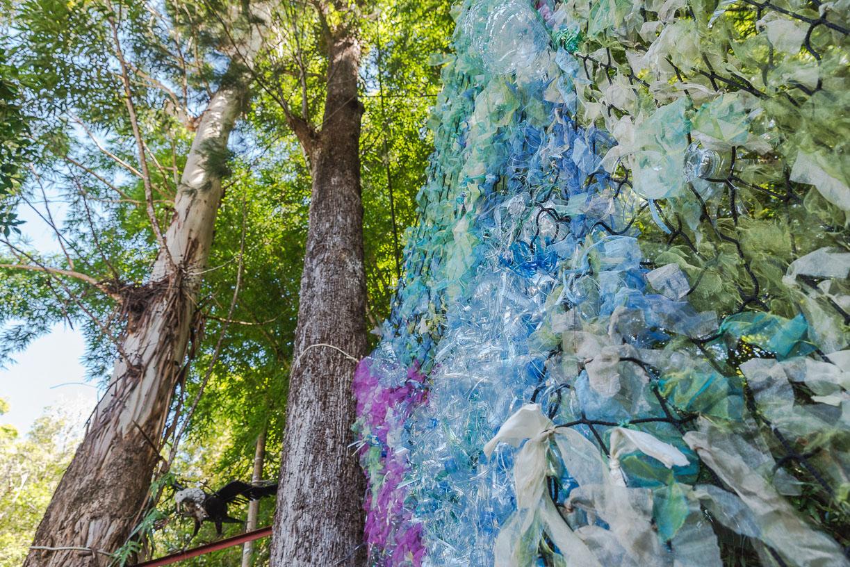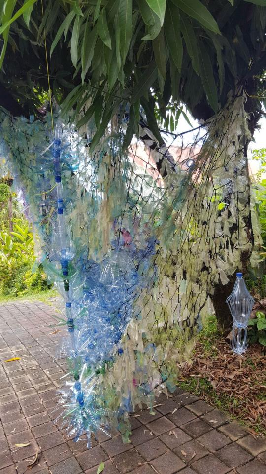 Installation, filet, fil textile, bouteilles plastiques transformées, environ 300 x 500 cm.
