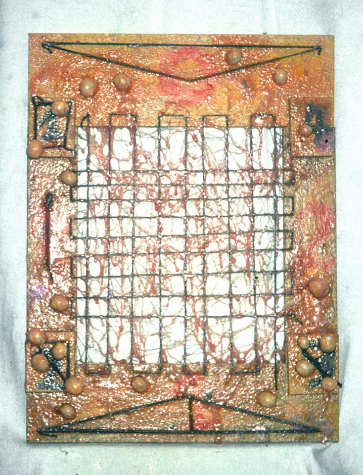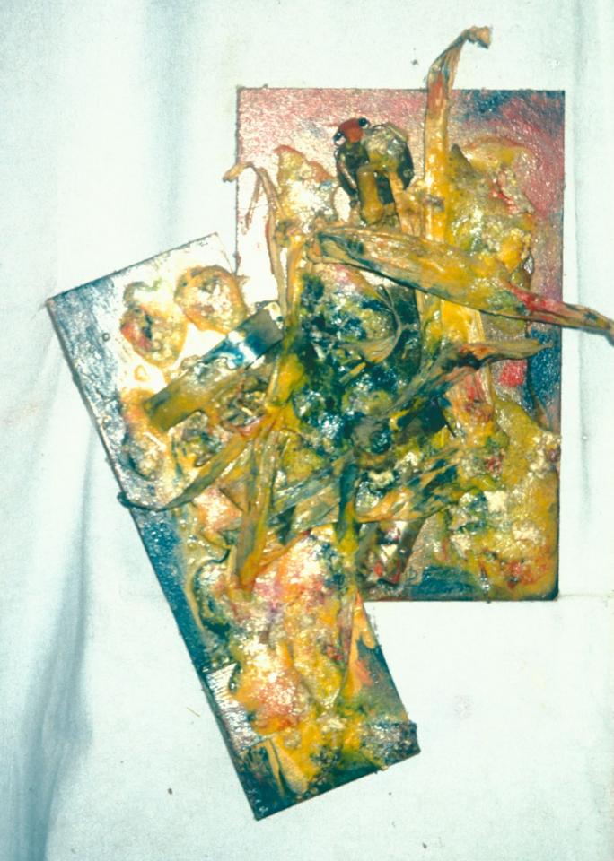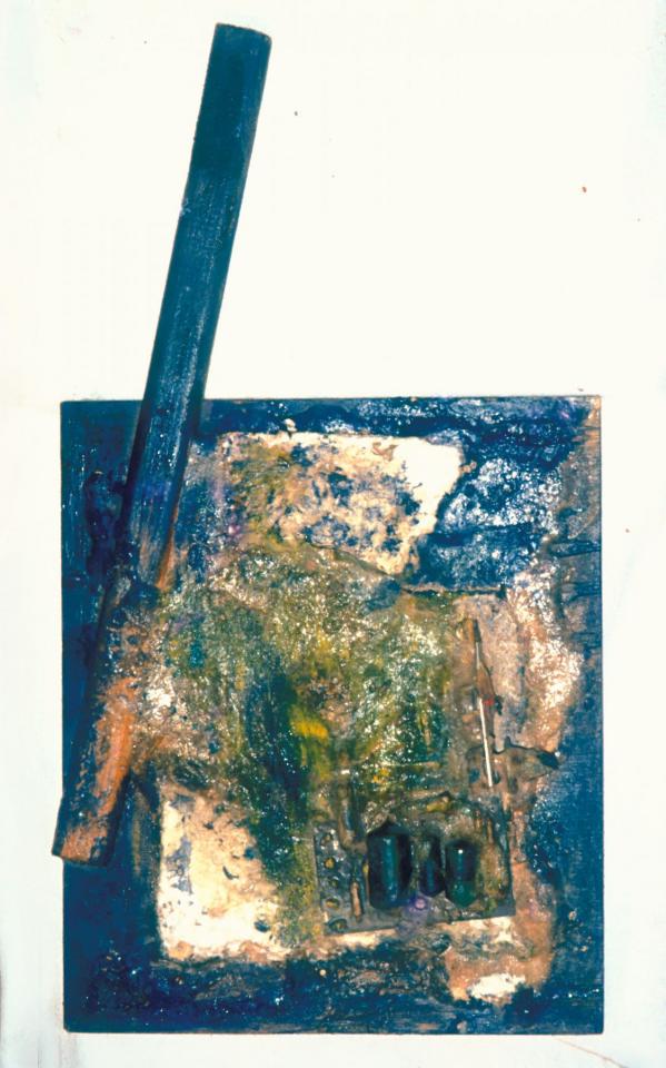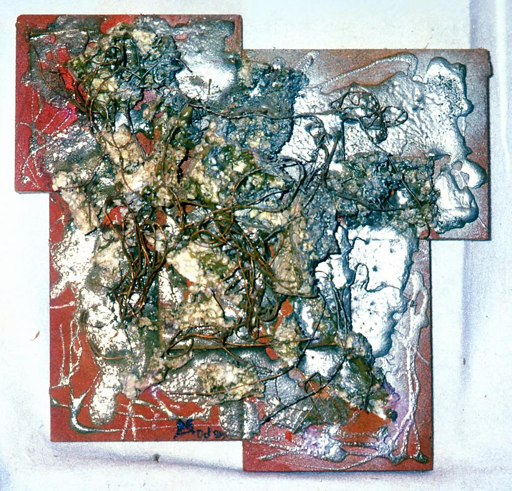 Objets divers (cartons, photographies, composants électroniques, fils de cuivre, antenne, feuilles, bois, coquilles d’escargot, fils divers, câbles), bois peint, plastique et vernis artisanal, peinture à l’huile, entre 50 x 50 cm et 60 x 110 cm.