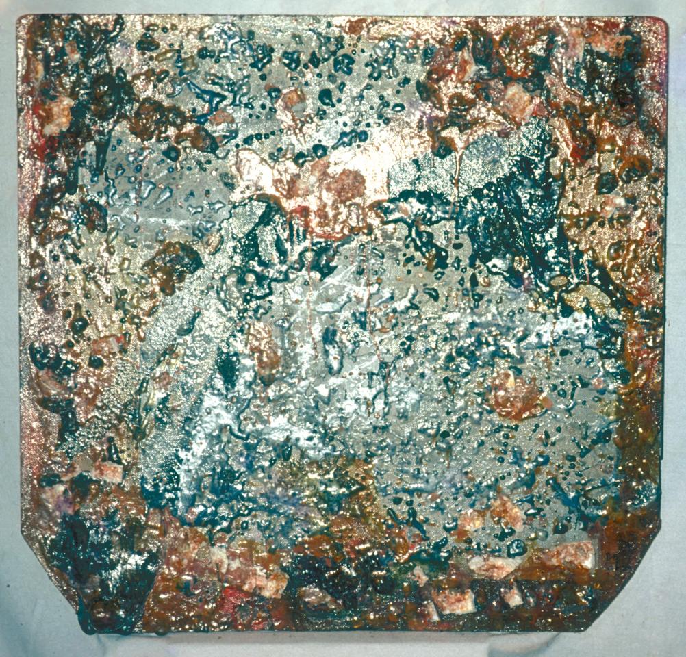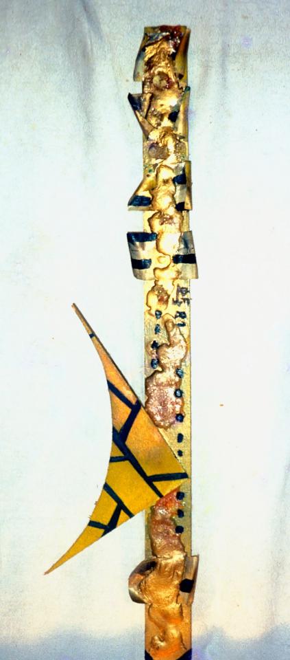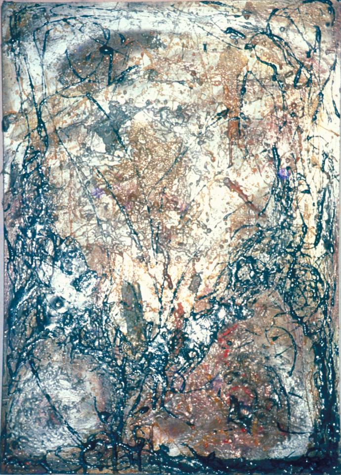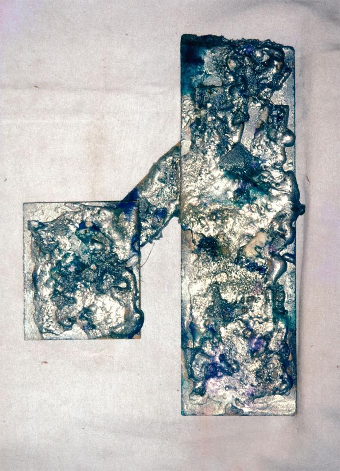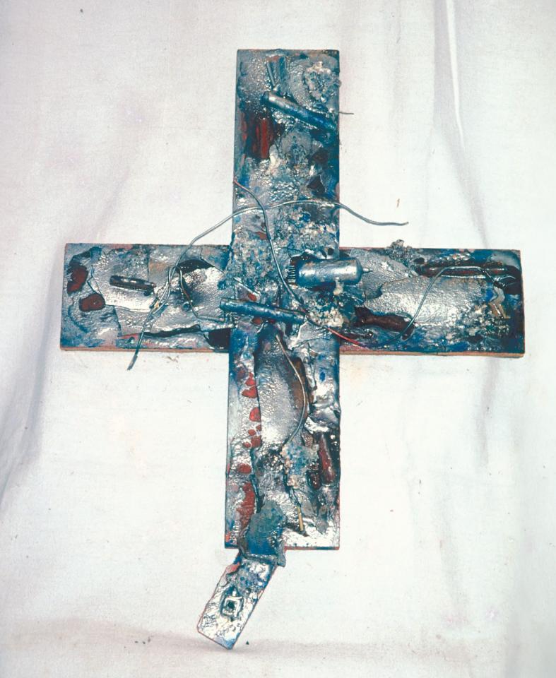 Objets divers (cartons, photographies, composants électroniques, fils de cuivre, antenne, feuilles, bois, coquilles d’escargot, fils divers, câbles), bois peint, plastique et vernis artisanal, peinture à l’huile, entre 50 x 50 cm et 60 x 110 cm.