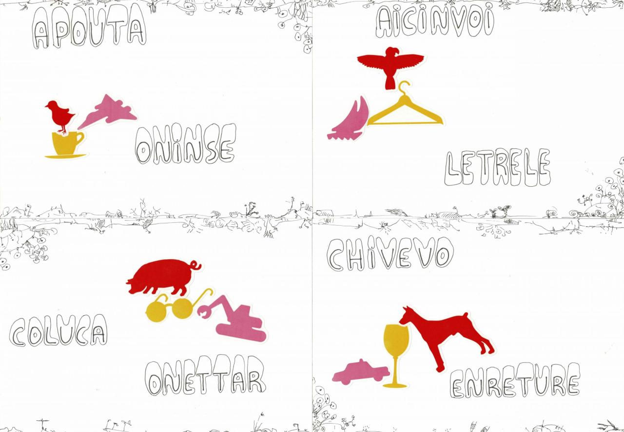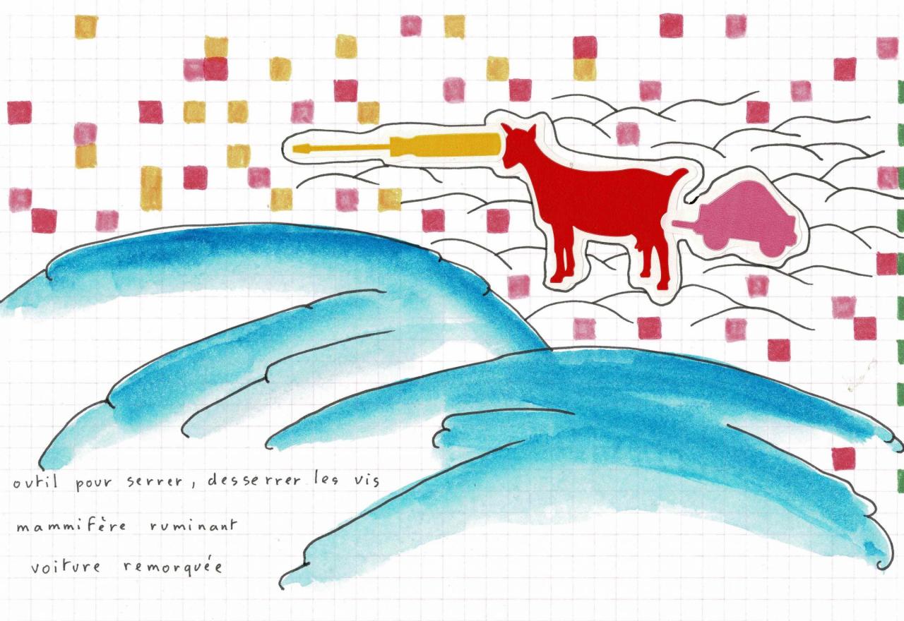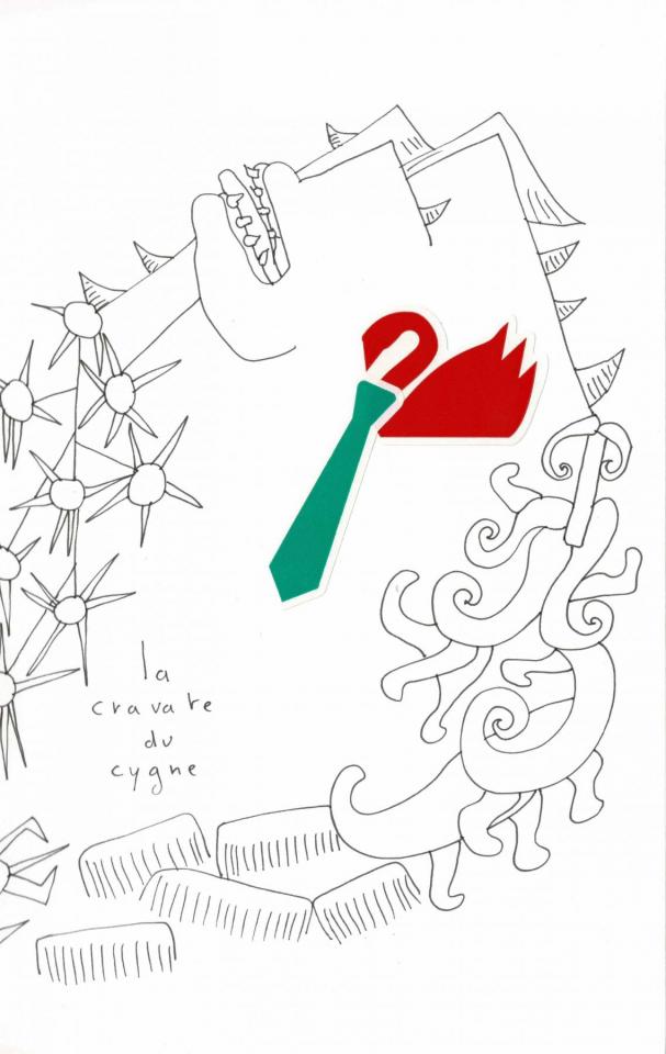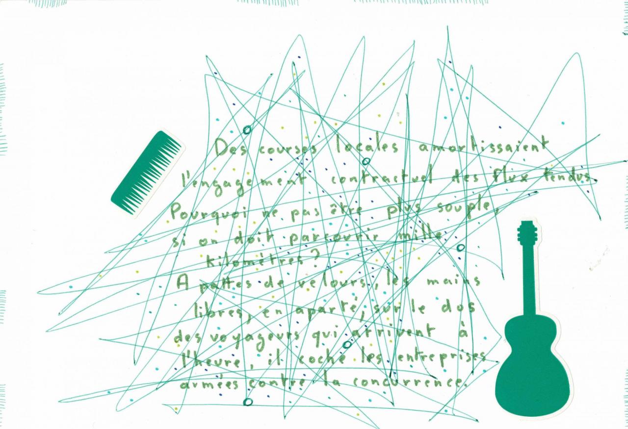 Stylo feutre, stylo bille, gommette sur papier bristol, 21 x 14,8 cm.