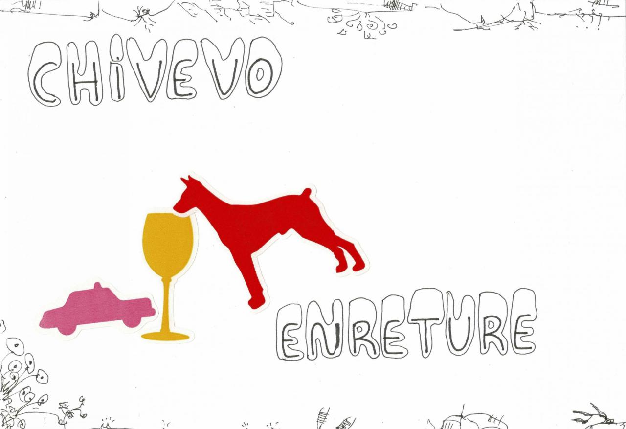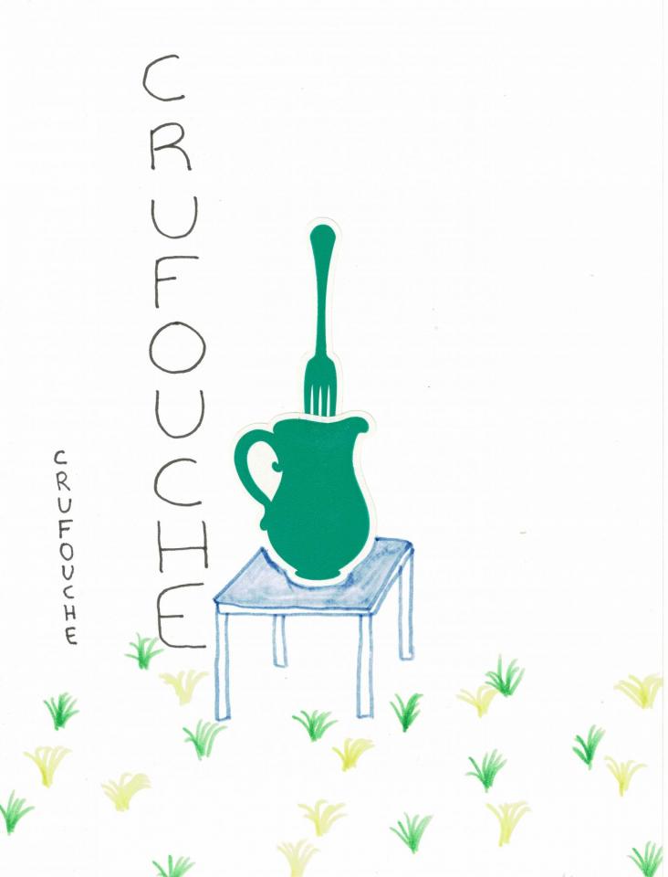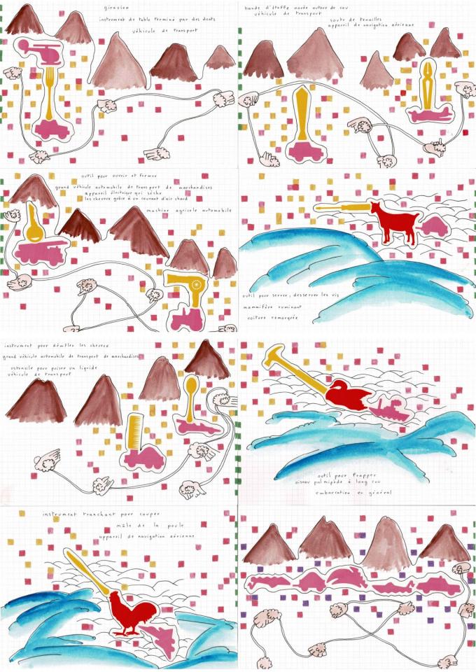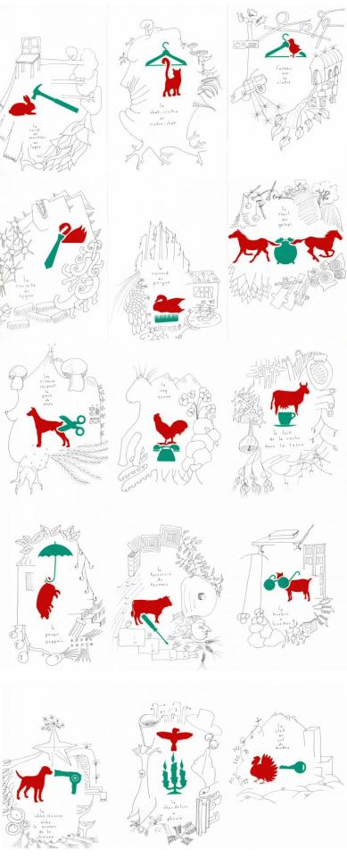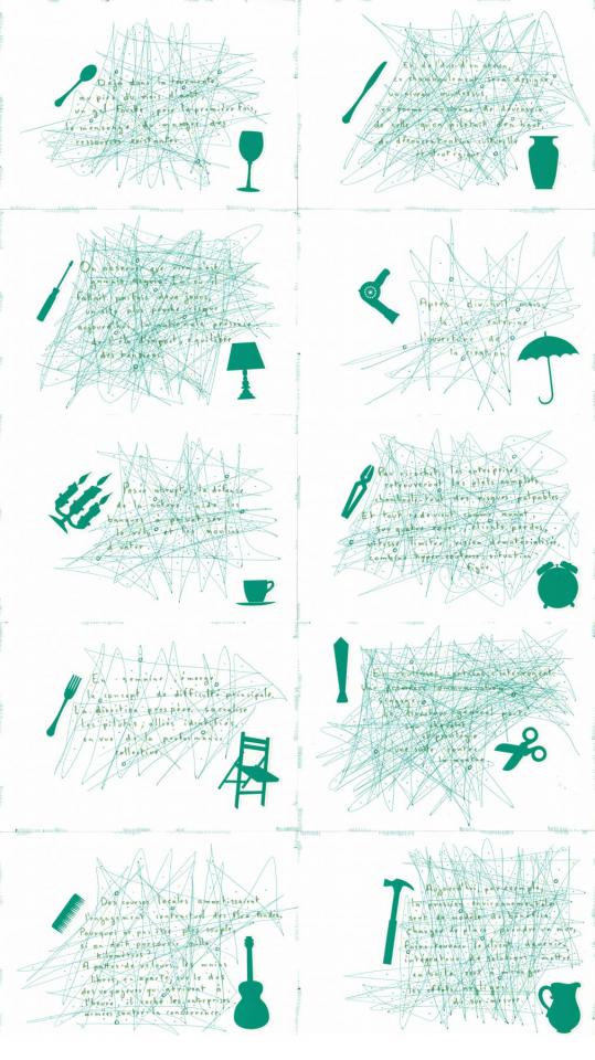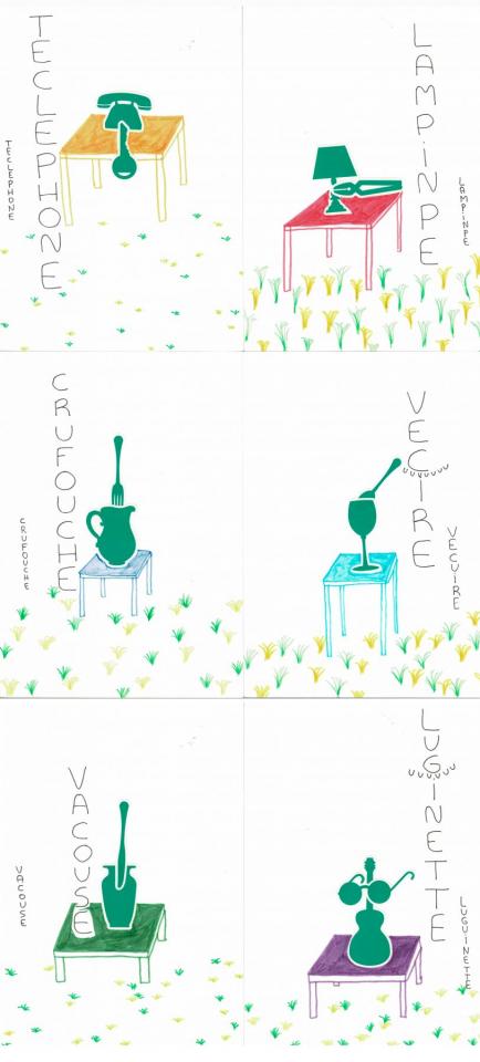 Stylo feutre, stylo bille, gommette sur papier bristol, 21 x 14,8 cm.