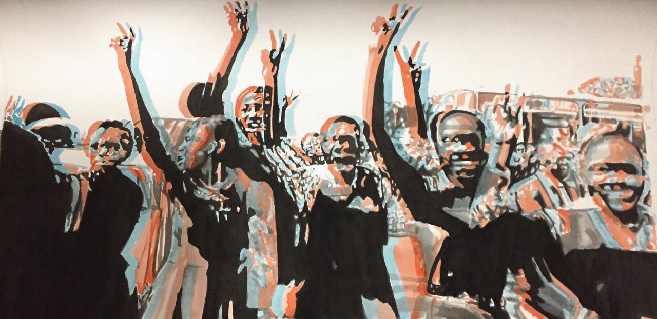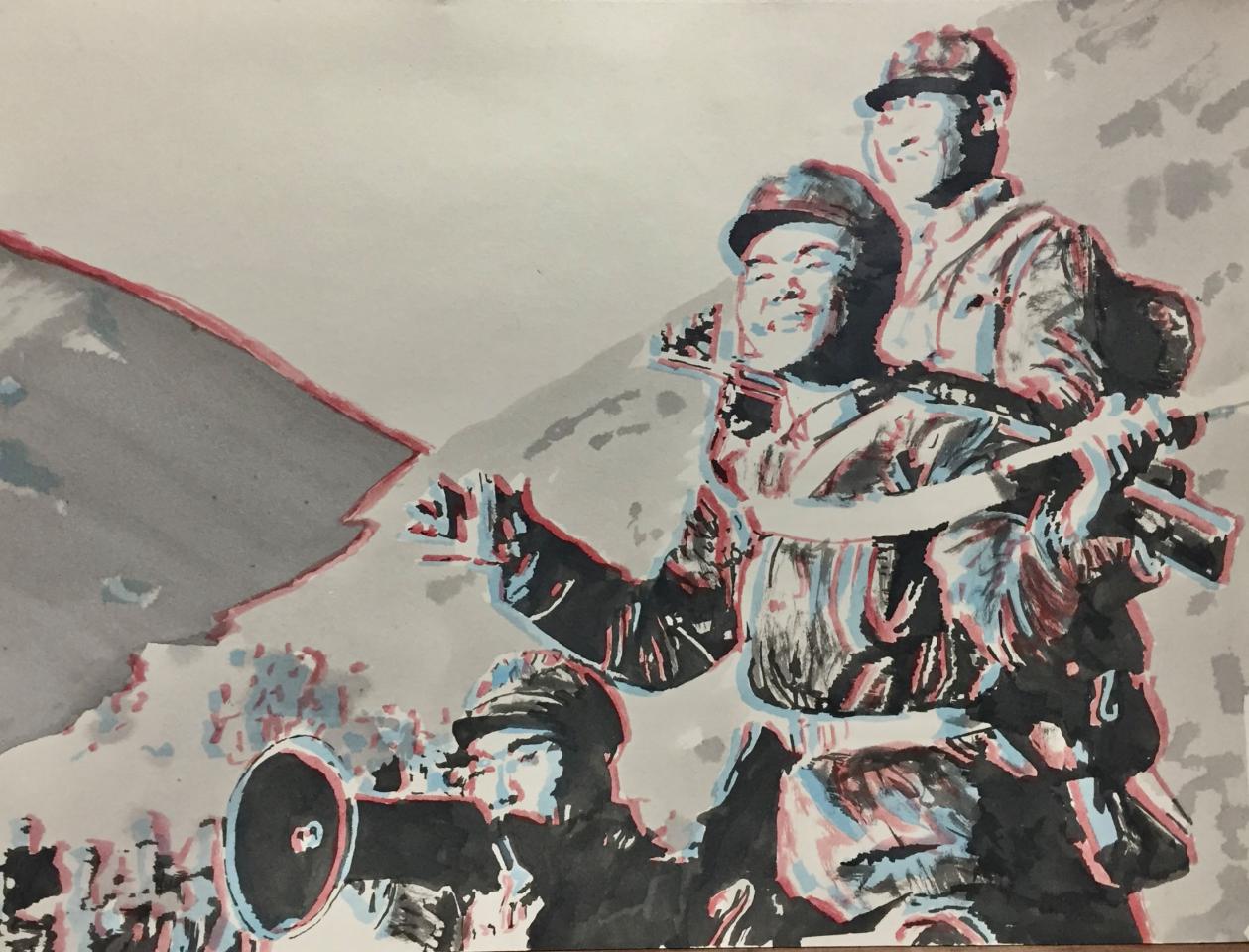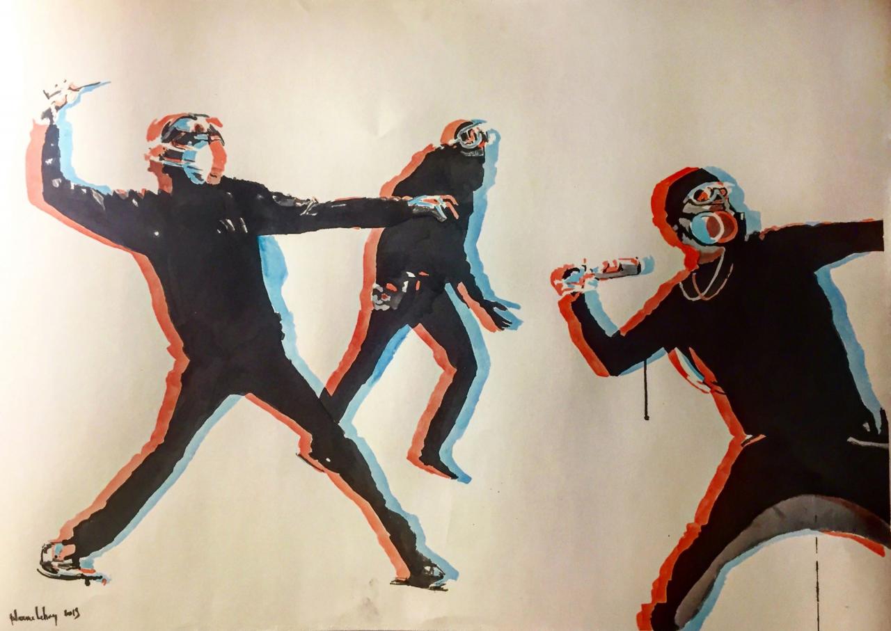 « Ce sont des images glanées sur internet, qui m’interpellent. Reflets d’une époque, elles sont mises en relief par le traitement anaglyphe. Elles construisent un paysage historique continu, marquent un parallèle entre l’histoire passée et l’époque actuelle. »