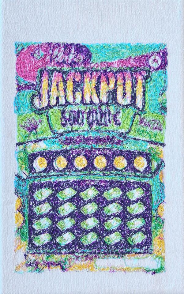 Oui, c’est un slogan ! Mais on est dans l’ironie, dans la critique sociétale, que l’on retrouve aussi dans tes broderies de personnages de cartoon et de tickets à gratter ?