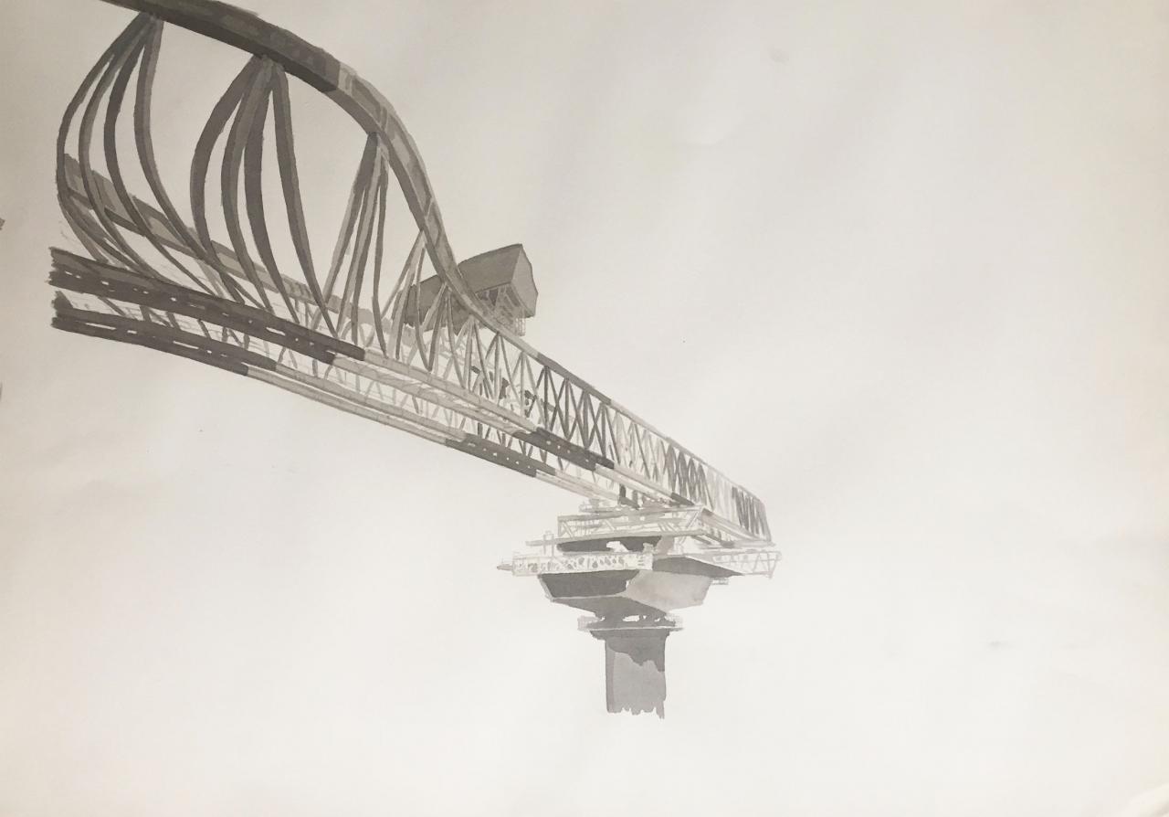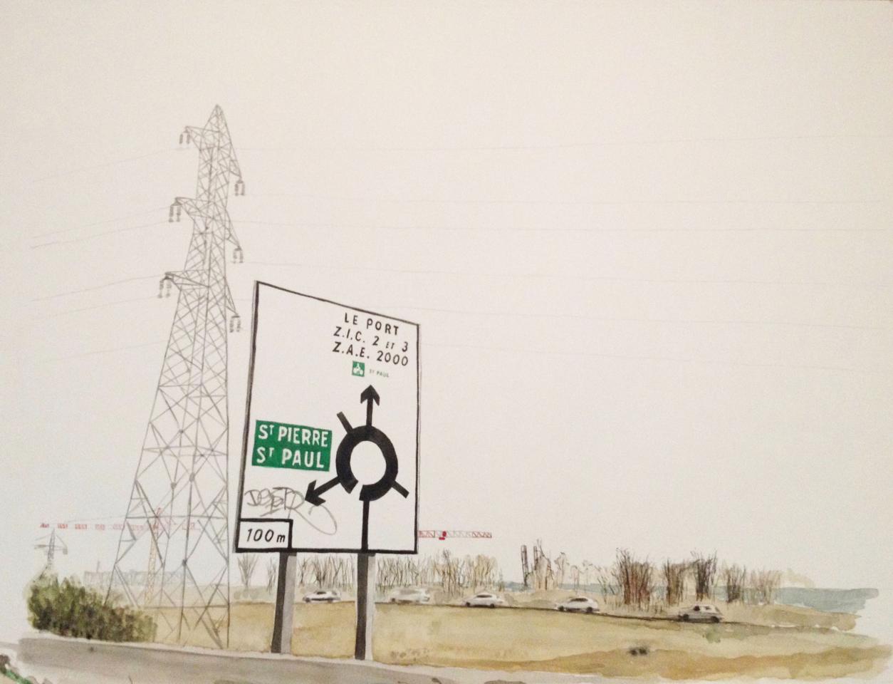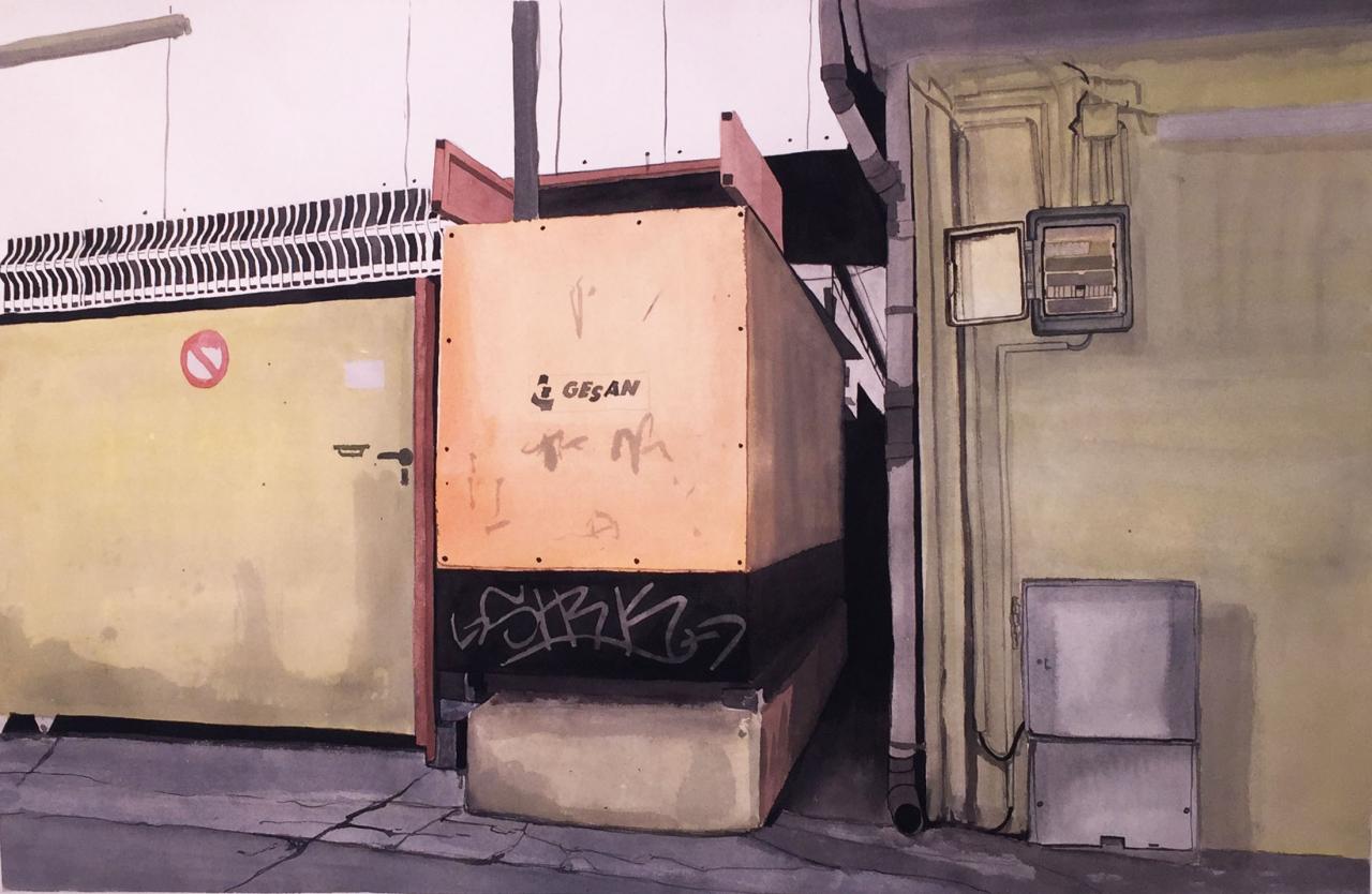 Pourtant dans tes aquarelles, ce ne sont pas ces lieux de vie que tu représentes, mais plutôt des tiers-lieux (non-lieux ?), la présence humaine est rare.