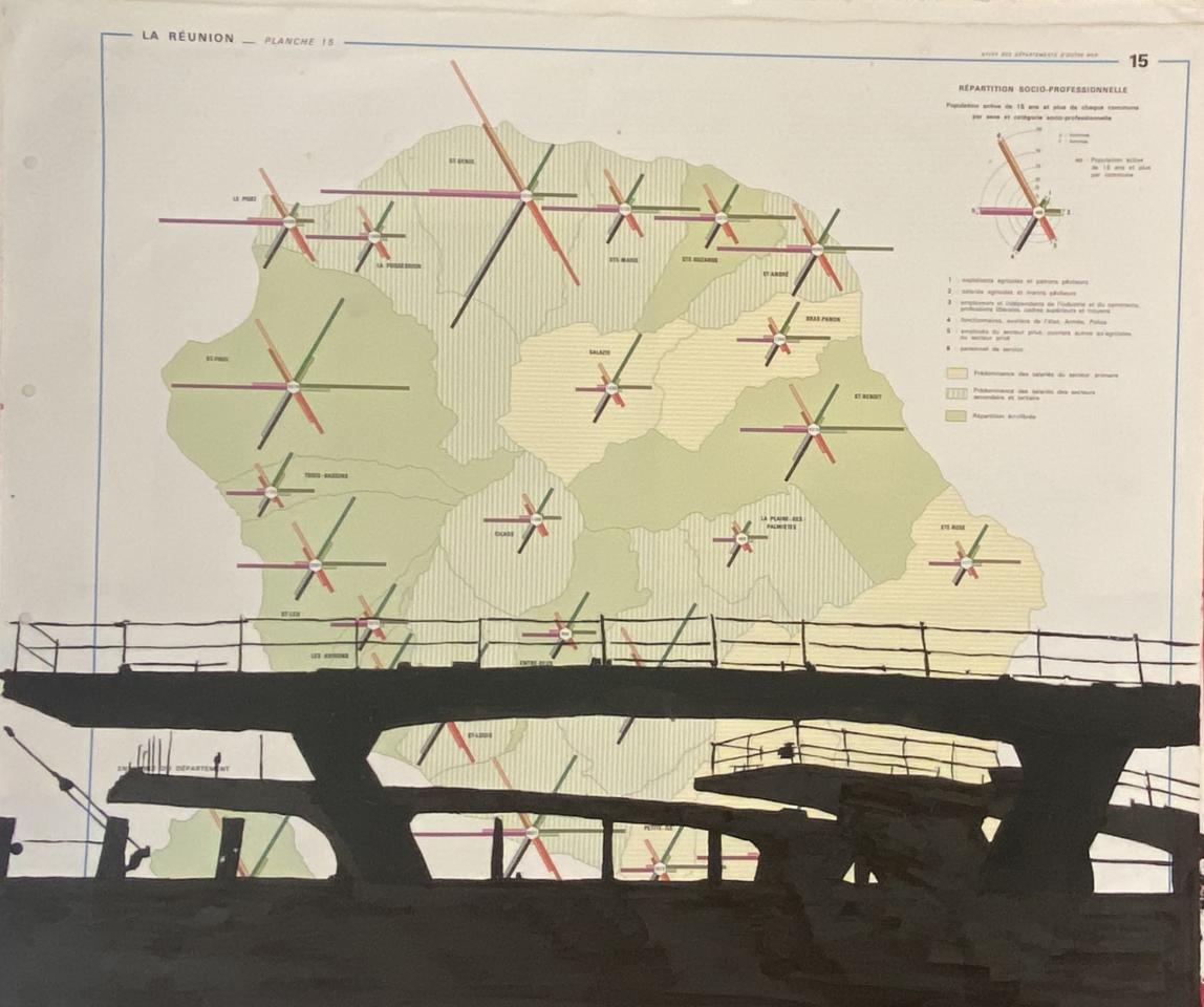 Poétique Territoriale a commencé par des vues. À La Réunion, on est très souvent sur la route, il y a peu de vie de quartier. On est obligé de prendre la voiture à un moment ou à un autre. On passe tous les jours dans ces endroits qui ne sont ni sympathiques ni agréables à regarder. Je suis sensible aux belles vues. Le Maïdo, c’est magnifique, mais je trouve aussi qu’il y a de la poésie dans les transformateurs ! Si je prends les compteurs d’eau par exemple : une équipe est venue, des gens ont travaillé pour les mettre en place, mais on ne voit que le résultat. Je crois que cette attention particulière pour des éléments considérés comme triviaux me vient de l’époque où je bossais pour les salons. Pendant une semaine, une armée de personnes se dépêchent pour préparer l’événement, et dès l’ouverture, iels disparaissent. Il ne reste que l’équipe d’entretien, composée majoritairement de personnes d’origine pakistanaise, littéralement planquées dans les murs, et qui ne sortent que pour nettoyer. J’ai beaucoup travaillé avec ces gens de l’ombre. C’était la même chose quand je bossais dans le cinéma : plusieurs personnes préparaient le show mais elles étaient invisibilisées, on ne les retrouvait qu’au générique de fin.