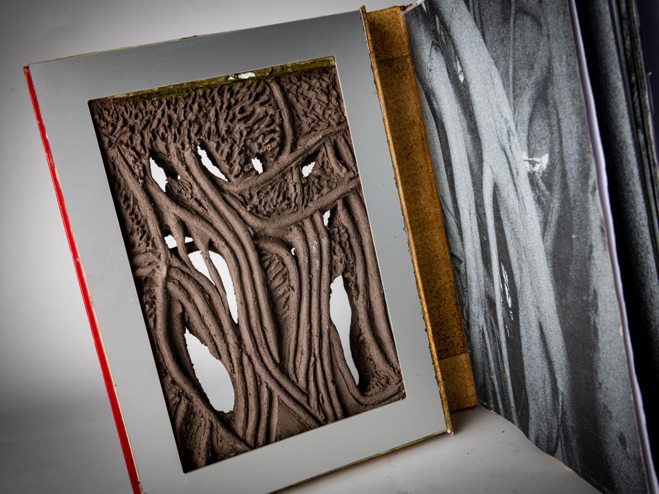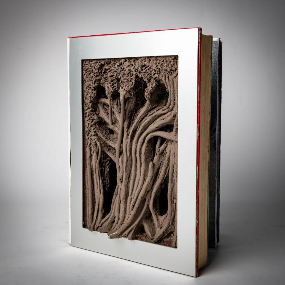 Livre sculpté, papier, photos, terre de grès, aluminium, 34 x 26 x 6 cm.