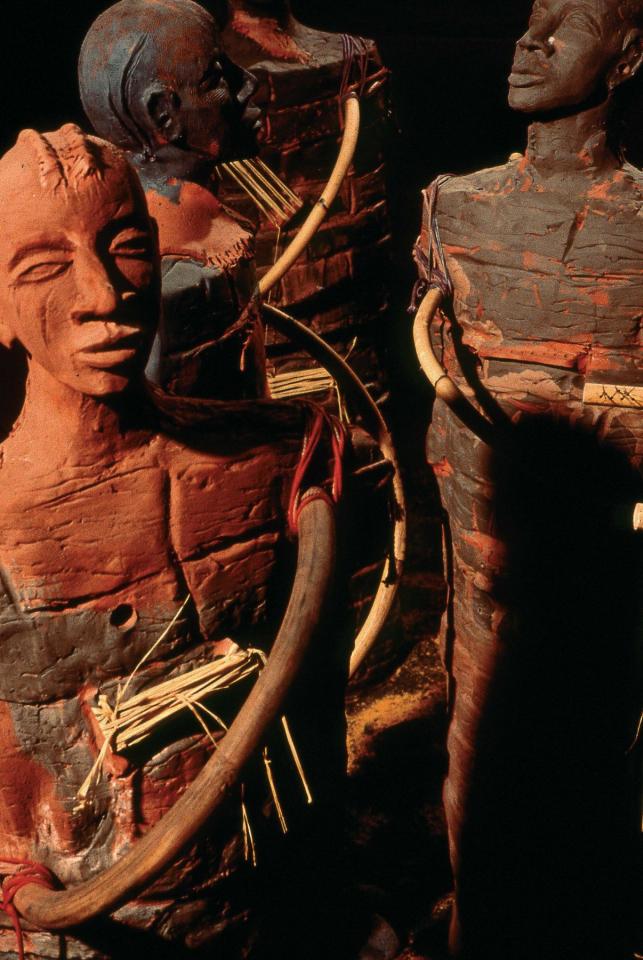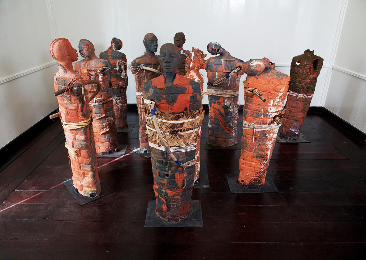 L’objectivité des corps de Beng-Thi se lit à travers plusieurs signes inscrits dans les volumes : socles visibles, couleur et forme des pierres qui forgent les contenants, rappelant les façades des maisons en terre cuite. De quelles maisons s’agit-il, à quelle mémoire font-elles appel, à celle de l’Afrique et de ses édifices ruinés ? L’artiste avoue ne pas l’avoir décidé. Toujours est-il que ses corps s’exposent non comme des organismes, mais comme des métaphores d’édifices. Ils ont été construits, façonnés de l’extérieur et rien en eux ne saurait prévenir leur désolation. Ils se donnent à penser comme des corps-blocs, privés de leur idiosyncrasie. On a aussi l’impression que le corps se métamorphose en ce qu’il n’est pas censé être au départ, un objet marchand à la valeur relative, qui ne dure que le temps de l’échange. Des liens de paille l’enserrent, il n’a ni bras ni pieds, le souffle semble s’en être absenté. Les bouts de bois hurlants expriment en quelque sorte le désespoir du corps, son renoncement à lui-même. L’Histoire a-t-elle sacrifié le corps au point de le faire disparaître ? Un corps qui n’agit pas, faute d’intégrité de principe intérieur, est-il encore un corps ? Beng-Thi s’est forgé, à travers ses lectures, une nouvelle conception du terme colonisation. Pour lui, il s’agit essentiellement d’un « commerce du corps1 ». C’est donc d’un corps objectivé et souvent démembré, qu’il va tout d’abord s’approcher. Trouver ce corps qui n’agit pas est peut-être une manière de rendre justice à des hommes et des femmes sacrifiés par le destin.(…) »