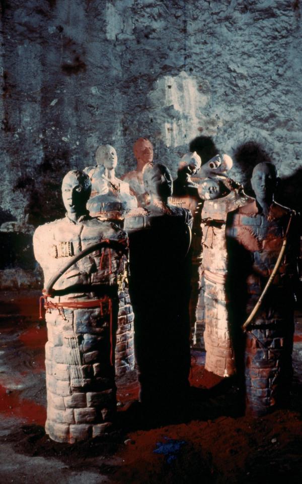 Souvent chez Beng-Thi, le corps est présenté comme ayant subi des outrages. Il a perdu ses attributs, ses repères, son intégrité et parfois même sa qualité de corps, comme dans la série Les bouts de bois hurlants (1993). Les corps de pierre sont enfermés en eux-mêmes, emmurés et sanglés. Les têtes choient. Les flancs se creusent et tombent en ruine. L’organisme s’est mué en enveloppe carcérale. Le corps est ici un objet creux : à l’intérieur de la sculpture il n’y a rien qui pourrait habiter la forme d’âme et en faire un sujet. Le corps apparaît comme un objet au sens négatif du terme, une chose inerte et définie, dénuée d’intériorité. Or, sans un principe interne qui nous meut, pouvons-nous agir ou ne sommes nous qu’agis ? Si se soulever comme le soutient Didi-Huberman, c’est partir d’une situation d’impouvoir, l’action est possible. Mais comment la déployer ?
