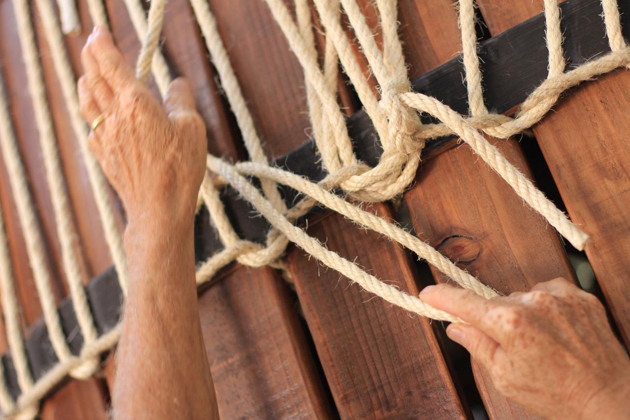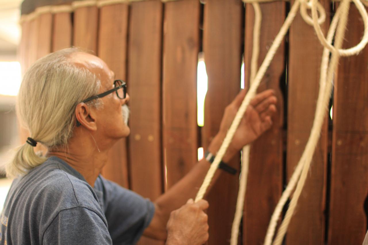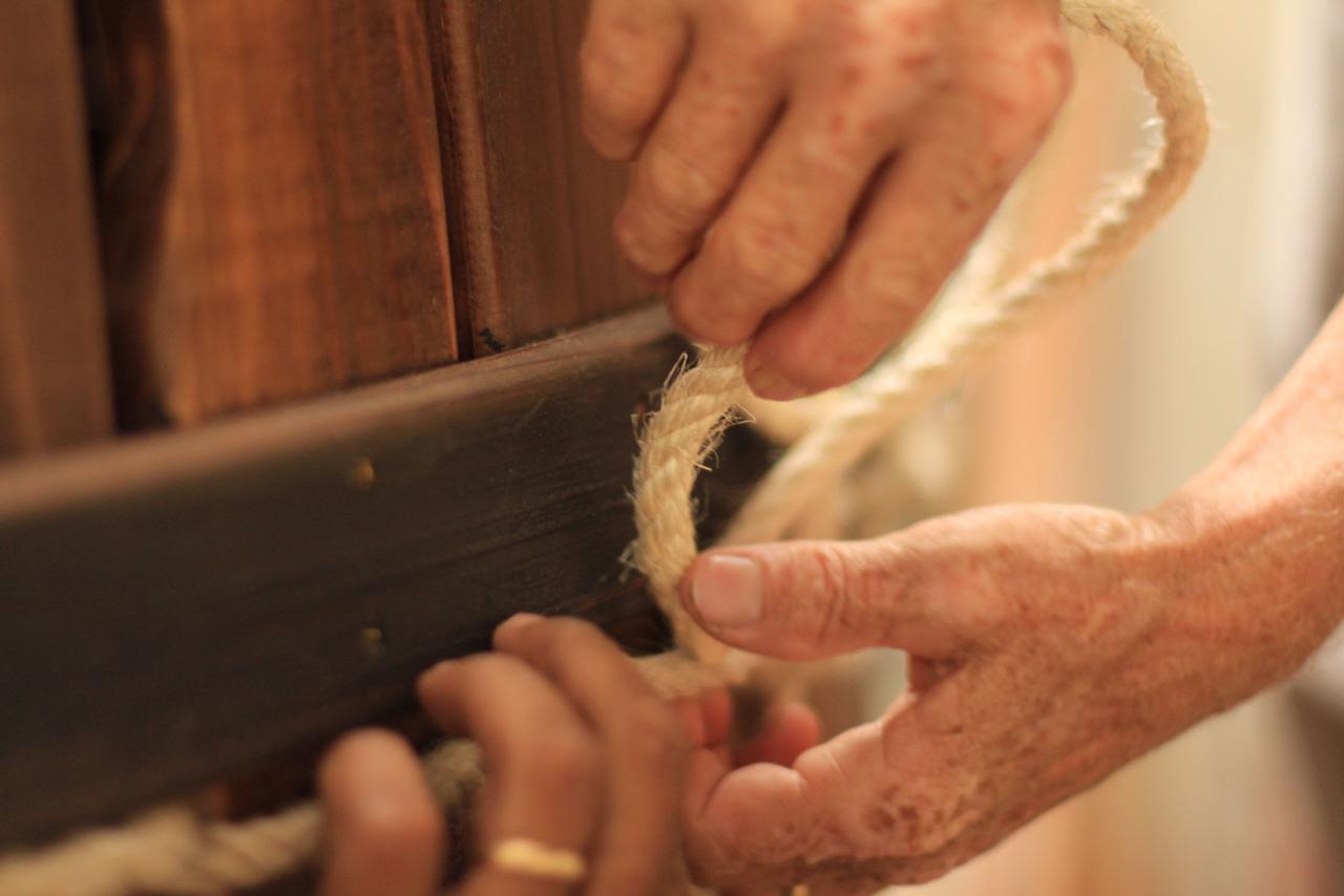 Installation, bois, corde, peau, acier, photographies, son, lumière, 293 x 210 x 170 cm.