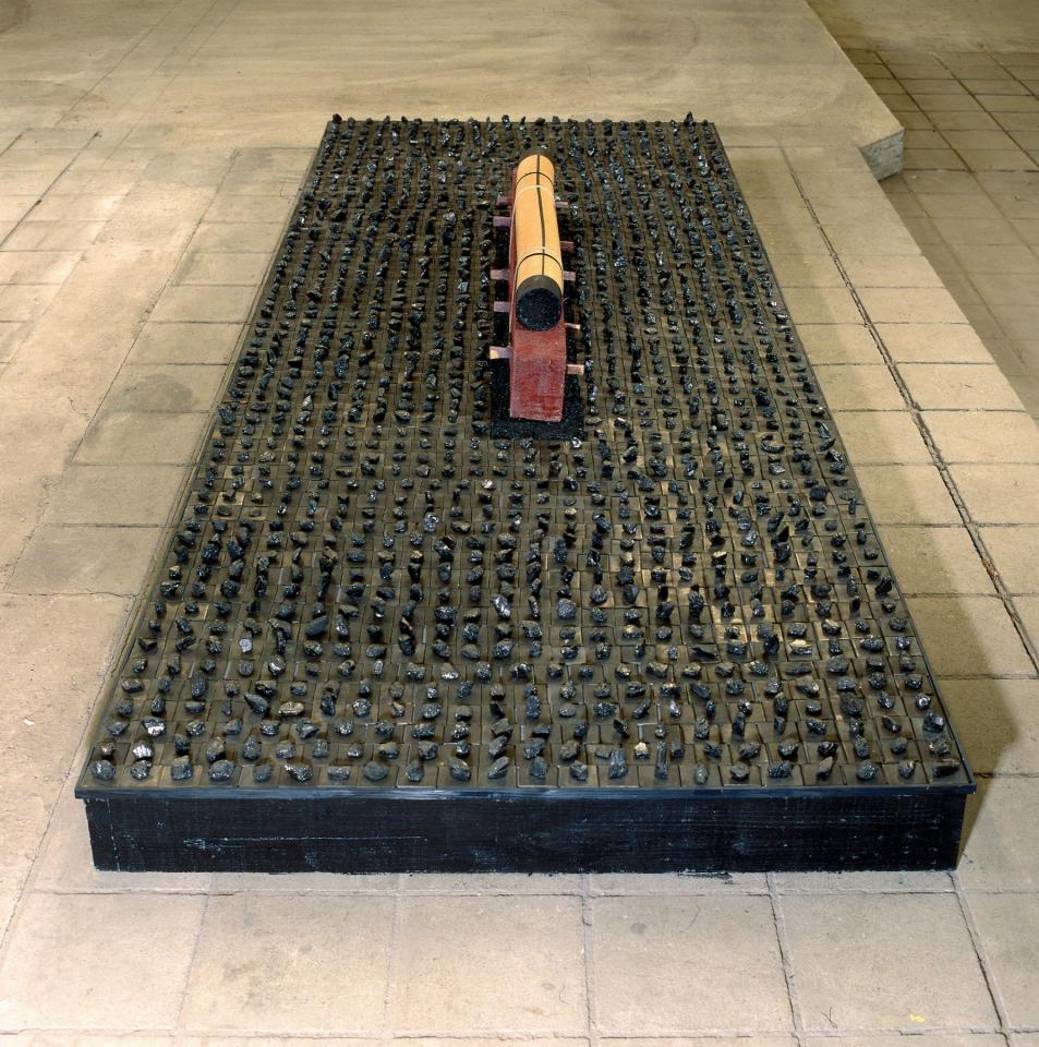 JBT : Les petites pièces extraites de l’intérieur de la mine Marcinelle évoquent ceux qui y ont travaillé et y sont morts, et elles sont placées à côté du charbon, à côté aussi d’une pièce de bambou vide. Comme demeure de l’âme, je crée un espace de vie partagé. Les petites pierres sont aussi là pour se rappeler, comme pour écrire. Savez-vous que dans plusieurs endroits, on écrit avec de petits galets ?