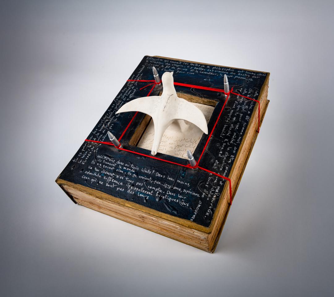 Livre sculpté, porcelaine, papier, bois, fil, 30 x 24 x 14 cm.
