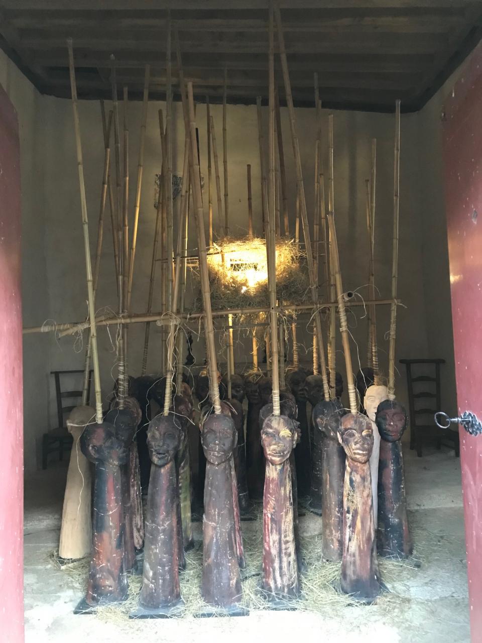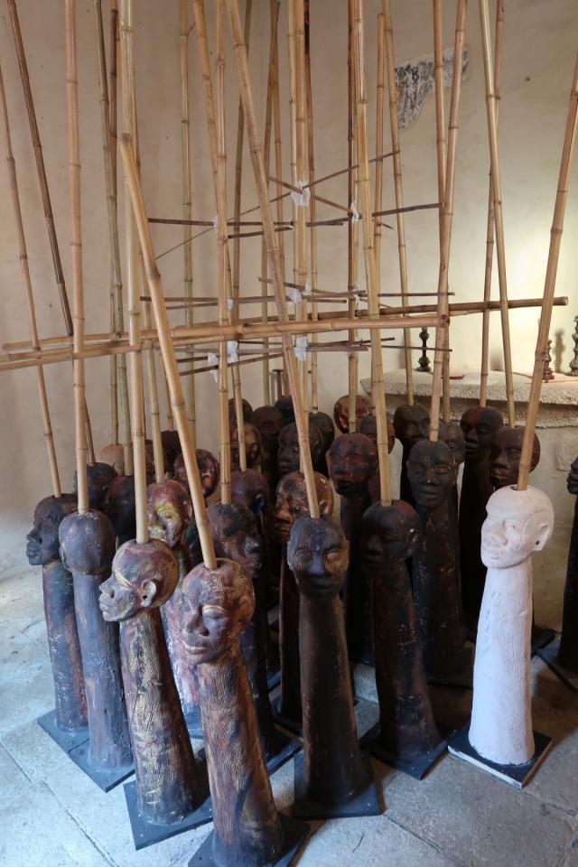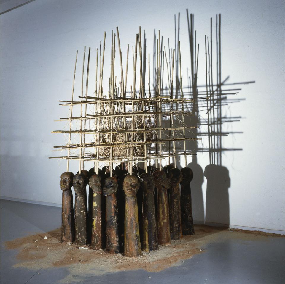 « (…) Pour Beng-Thi, le corps a été soumis de la part du colon à un rapport de force, allant jusqu’à confisquer l’intime, comme au sein des actes sexuels autorisés uniquement pour la reproduction. Si l’intime, cette profonde intériorité qui n’appartient qu’à nous, ces sentiments qui nous lient aux personnes et valeurs qui nous sont les plus proches, est aboli, confisqué, comment envisager la représentation du corps ? Comment sculpter un corps dépossédé de ce qu’il a de plus intime ? Chez Beng-Thi, la terre cuite qui constitue les sculptures de corps élimine la chair, elle la réfute. Elle destine la chair à la ruine qui est aussi perte de l’image corporelle, de l’idée d’un corps animé et singularisé par une personnalité. Dans Les bouts de bois hurlants, le corps est une amphore posée sur un socle, exposé comme sur un marché aux esclaves. Beng-Thi rejoue ainsi la tragédie des existences volées par des modes d’administration iniques. Dans Les bouts de bois hurlants comme au sein de l’installation Territoire d’initiation, le sculpteur accorde de l’importance à l’idée de construction : du corps-demeure qui tombe en ruine jusqu’à l’architecture en fibres végétales en passant par le tombeau artisanal Arrachement Carg. C12, dans lequel le corps se fond, le point de vue évolue. Mais le corps existe toujours comme partie d’une construction globale. Est-ce une manière supplémentaire de l’objectiver et de l’inscrire, comme un produit, dans l’ordre des fabrications humaines ? Sans doute. Le corps esclave serait devenu une invention, un fantasme de colon, un outil pour fabriquer le monde, également. Il est le médium d’une action qui ne lui appartient pas. Chez Beng-Thi, les dimensions du corps sont aussi morcelées : ici, des têtes à même le sol, rêveuses ; là, des visages qui restent bien plantés sur un corps qui pourtant n’en est pas un (tronc vertical ou construction en ruine), jamais la possibilité d’un ancrage de l’imaginaire et de la raison dans la motricité du corps, ne semble vraiment possible. En outre chez Beng-Thi, le corps peut être contenu par des liens (Les bouts de bois hurlants), comme si la société de l’époque et même celle d’aujourd’hui se méfiaient des potentiels de soulèvement des individus. (…) »