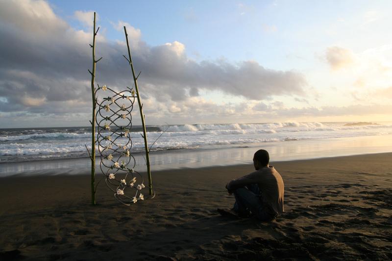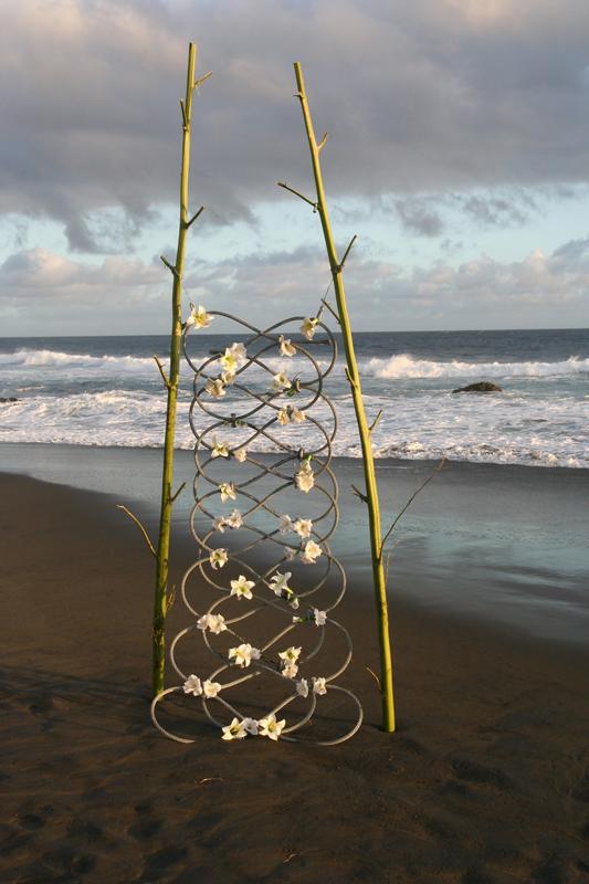 Installation éphémère, bambou, filet de protection en acier, fleurs.