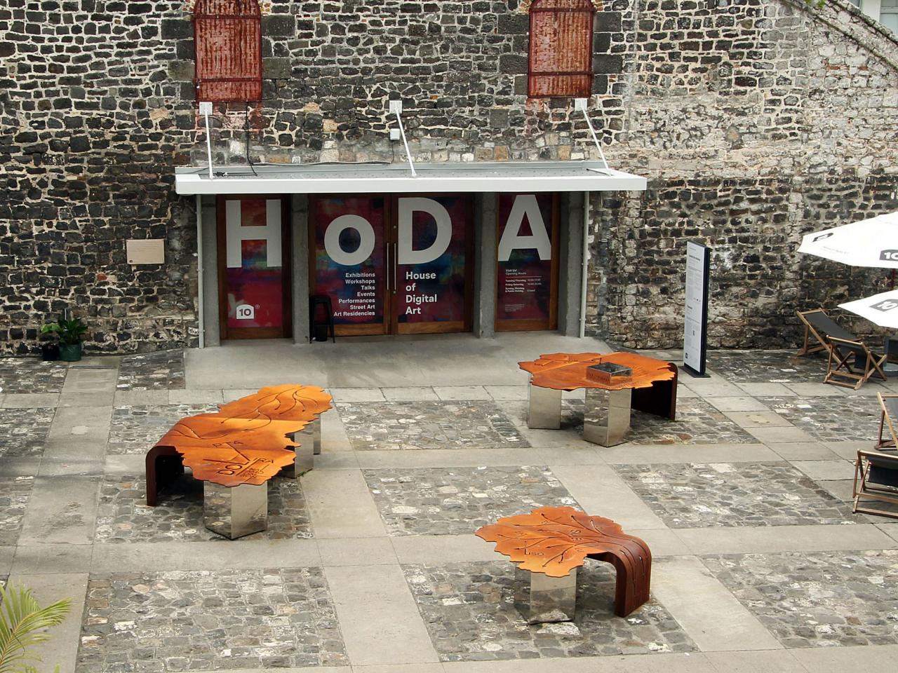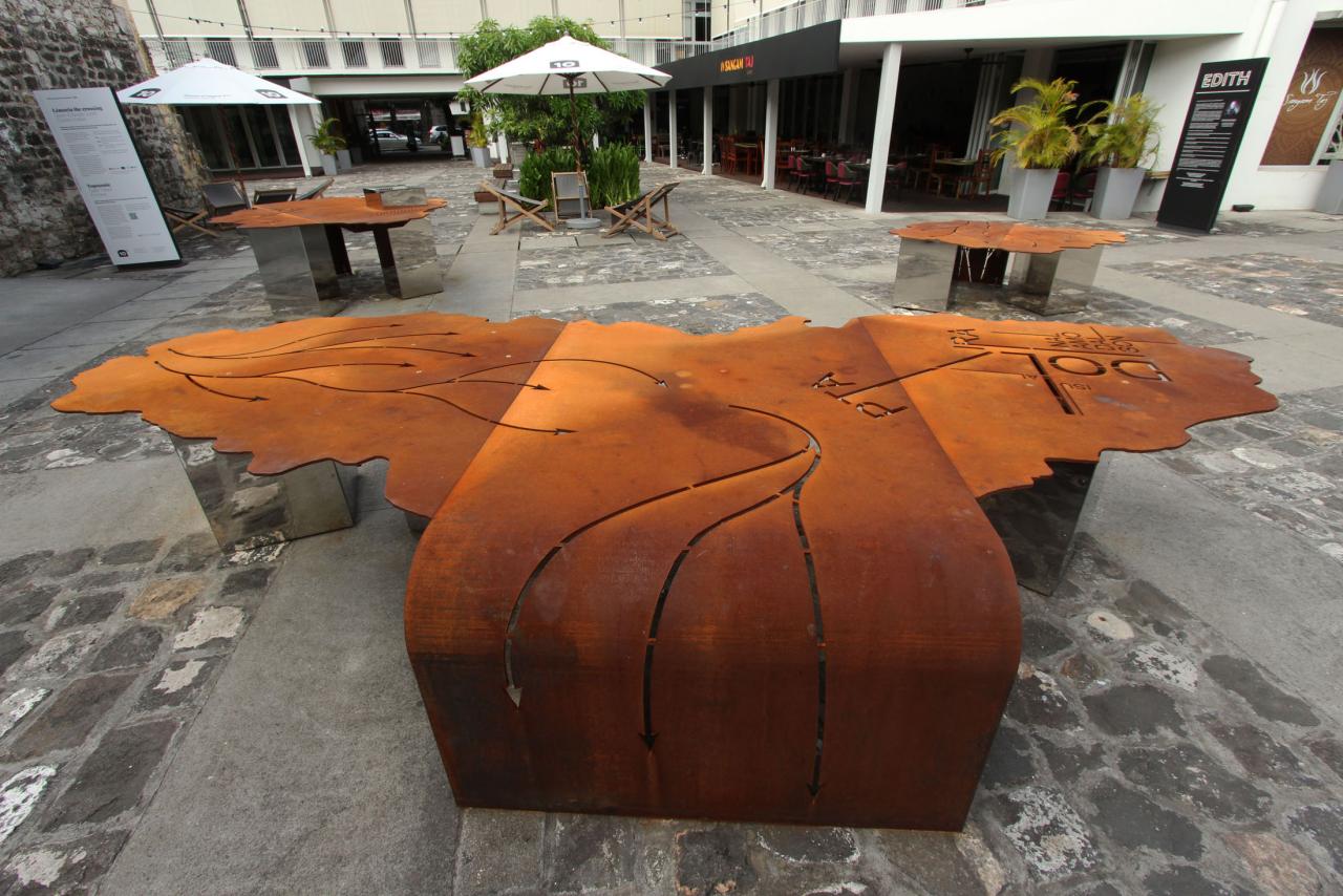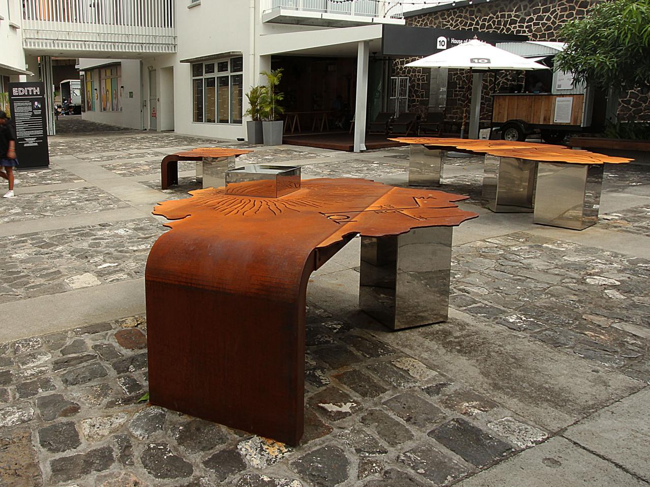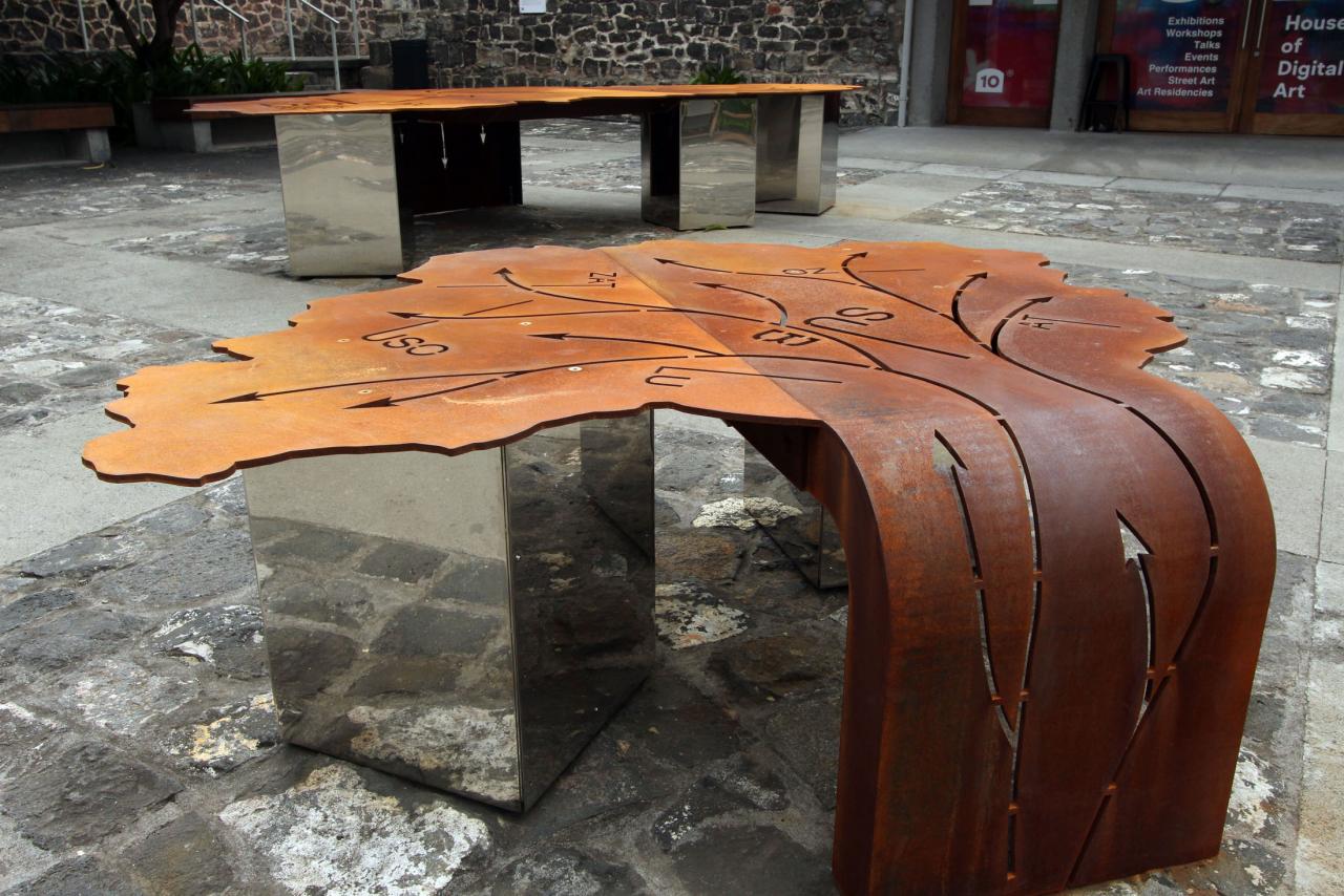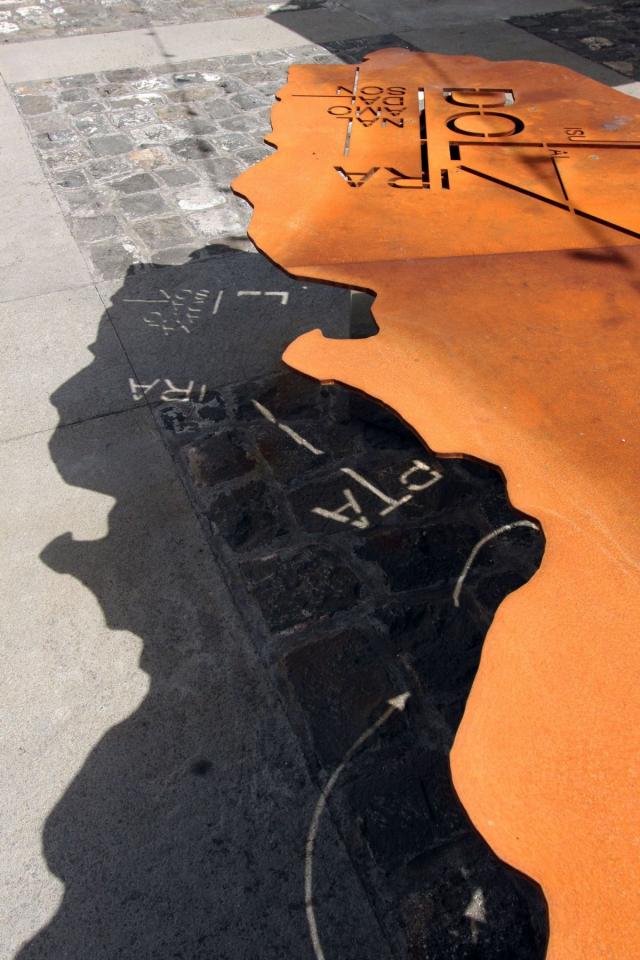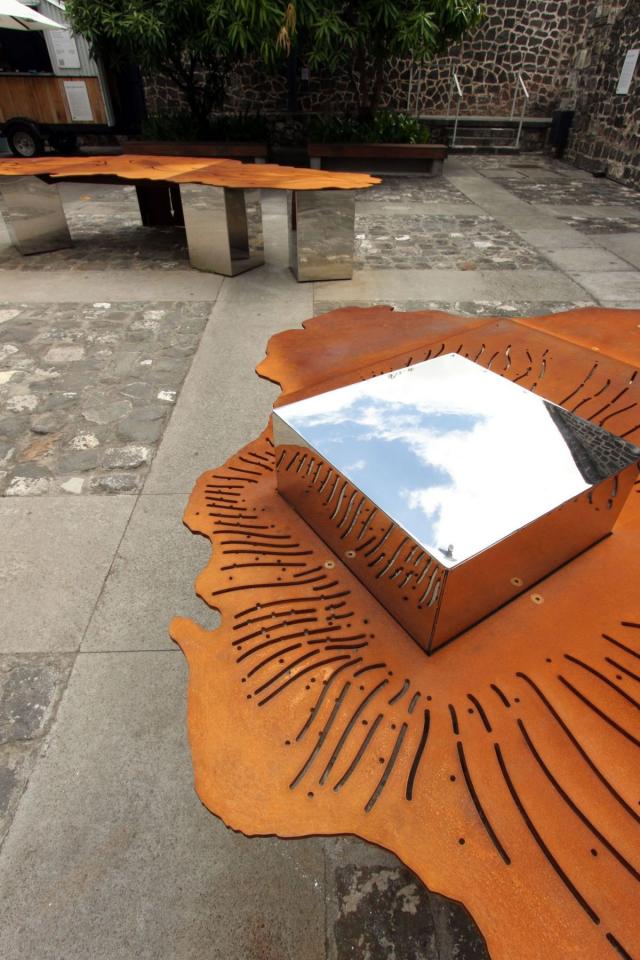 Les onomatopées ainsi récoltées sont découpées dans la tôle des trois îles, et regroupées par symboliques comme dans le livre, PTA SUB et TOT allégories à la sacralisation de la pierre, à la vénération paréidolique des montagnes. Au public de s’en emparer pour générer une nouvelle carte poétique. »