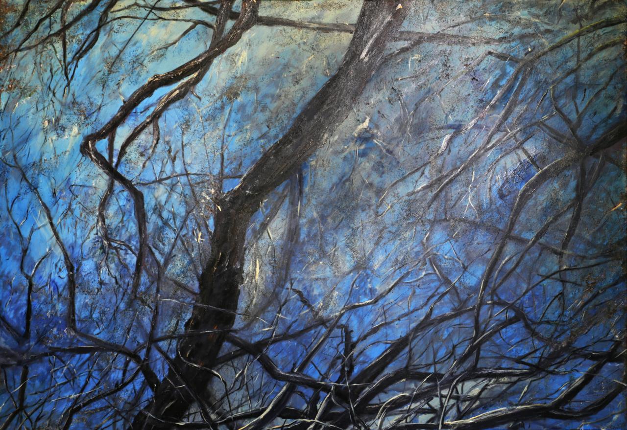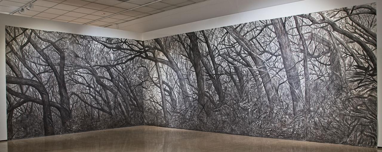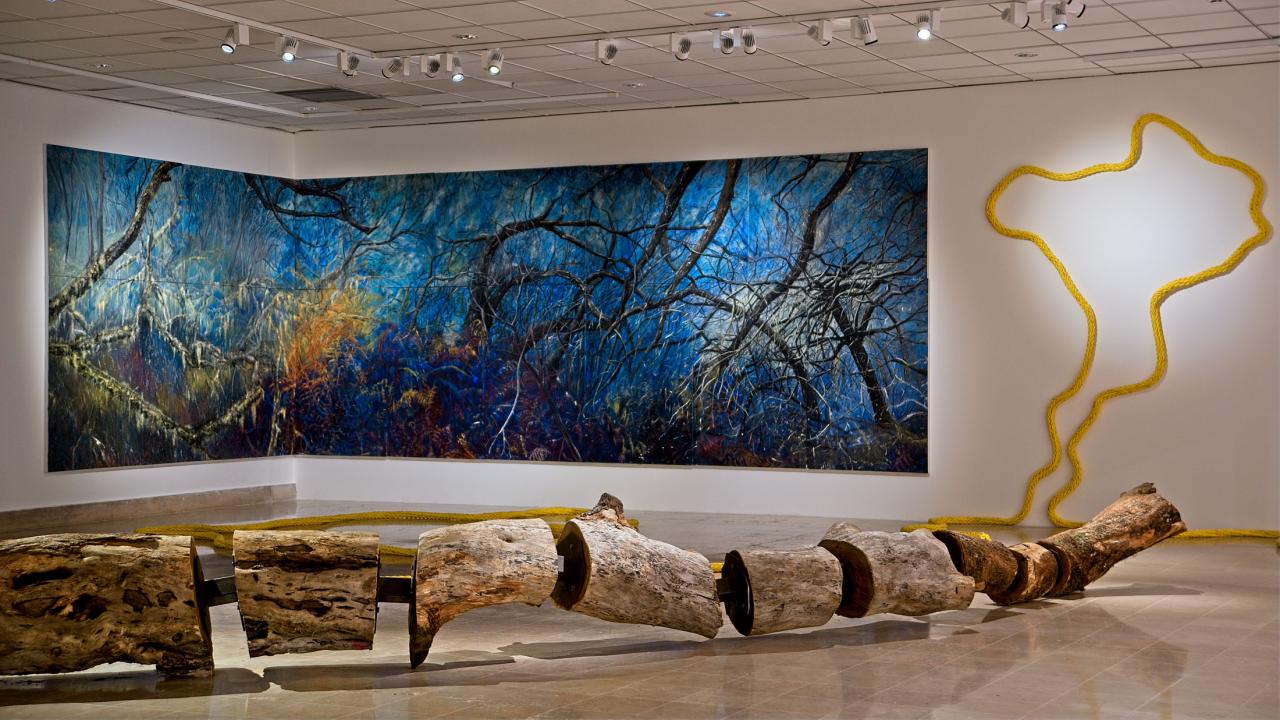 Piédbwa, l’arbre manifeste rassemble et présente des œuvres monumentales qui transfigurent un espace muséal blanc en un territoire arboré à arpenter. Elle attire l’attention sur le tableau final, Crépuscule des Dieux, représentant un scénario apocalyptique, de fin du monde. En amont, sont dévoilées les étapes préparatoires du processus de création avec : Forêt d’hiver, œuvre constituée d’arbres morts ou figurés, d’un côté, et Arbres carbones, dessin au charbon, de l’autre.