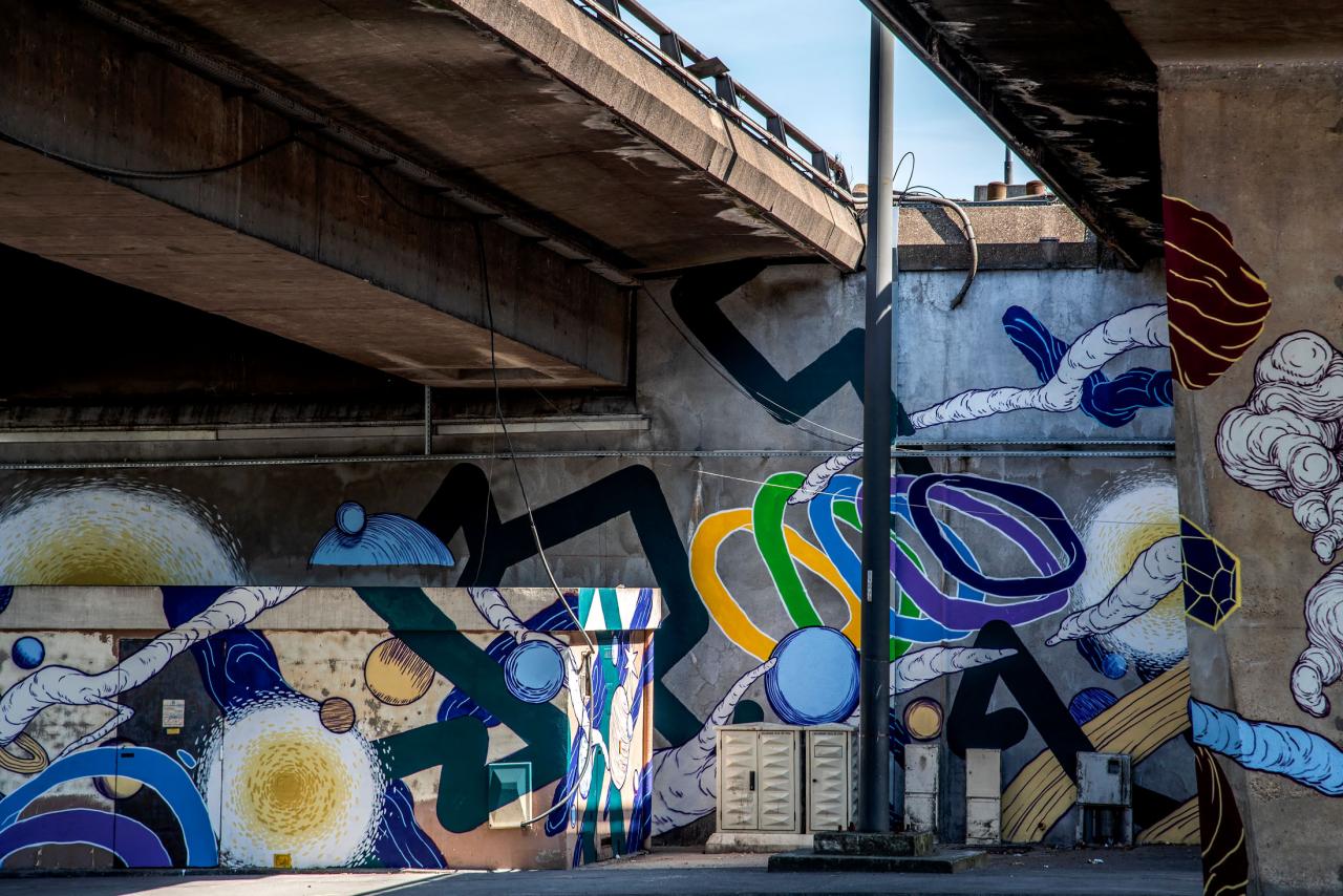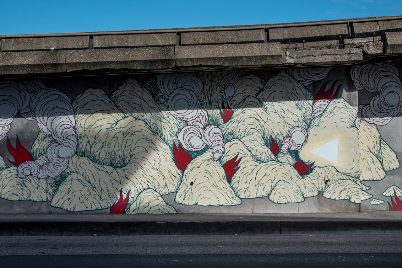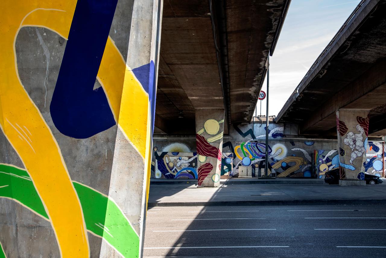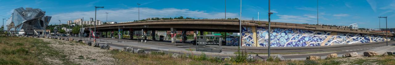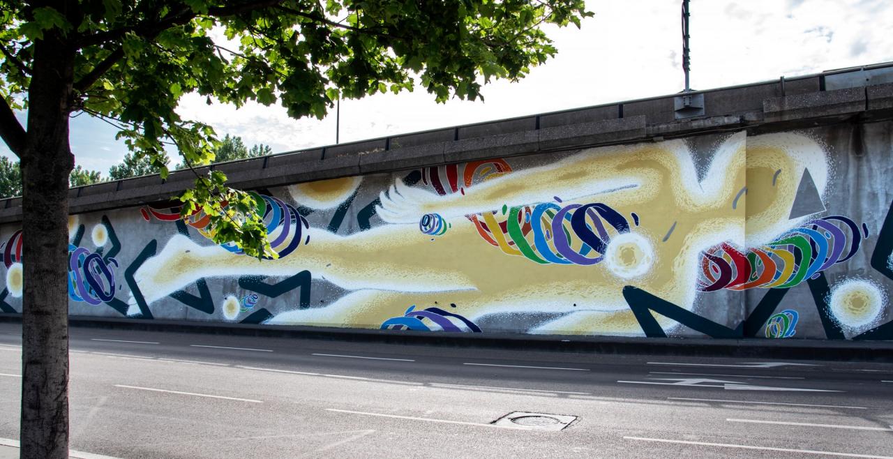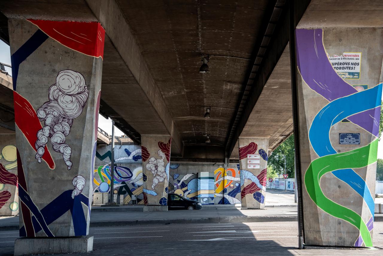 Technique mixte (aérosol et acrylique), 1 800 m². Autopont de Lyon, autoroute du Soleil.