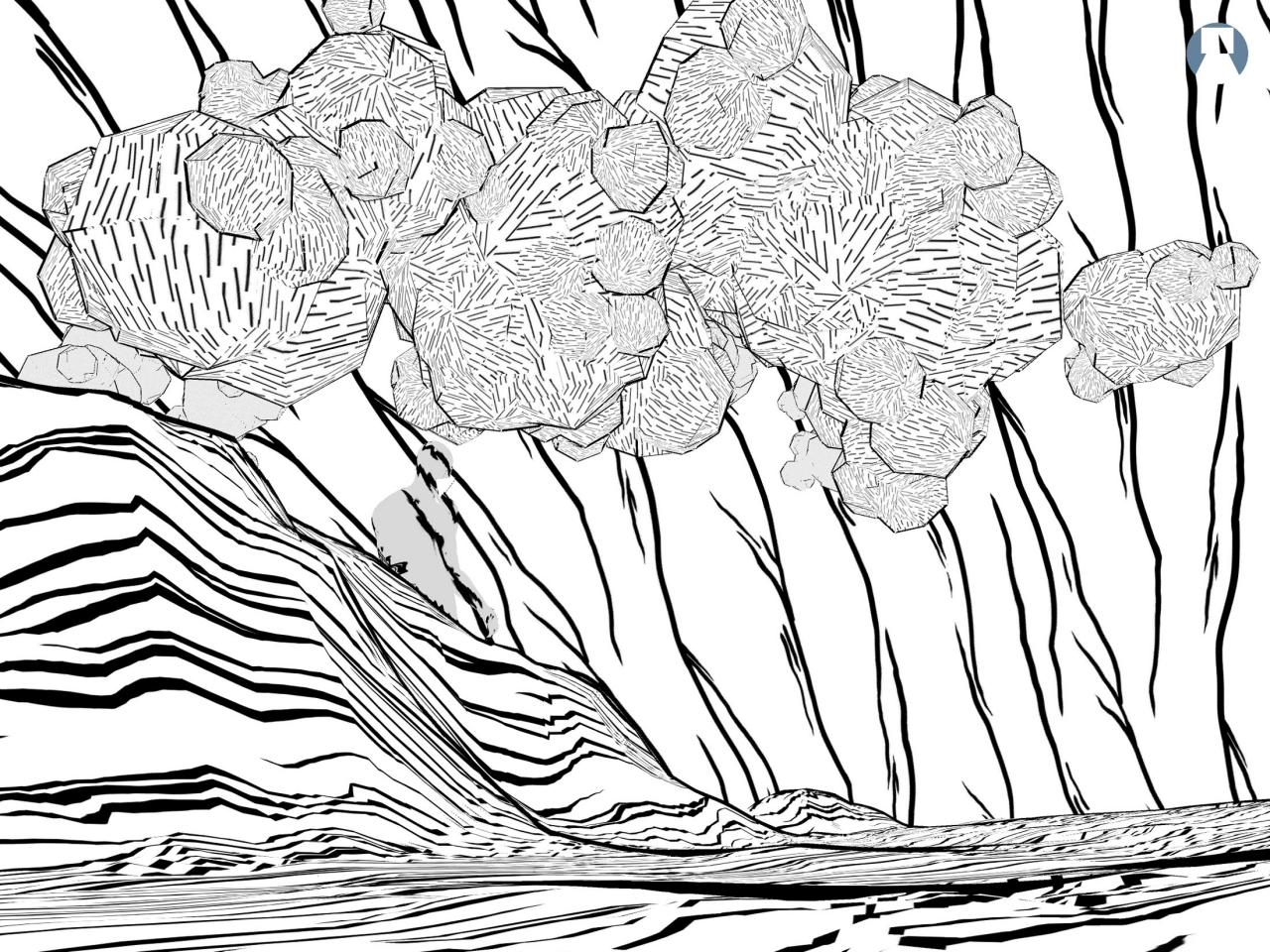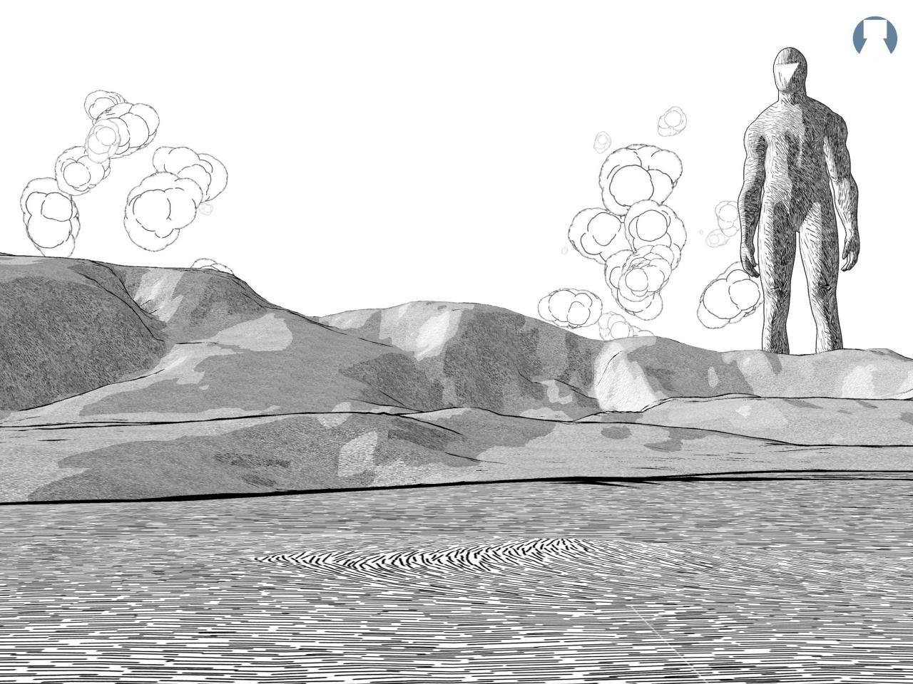Comme un souvenir préhistorique de l’île, on contemple le paysage nu et les montagnes inhabitées parcourus par des géants, des étoiles, et autres matières. Tous ces éléments projettent une mythologie rêvée de notre territoire.
