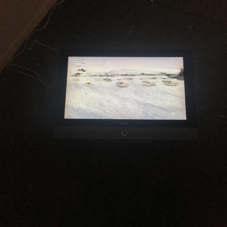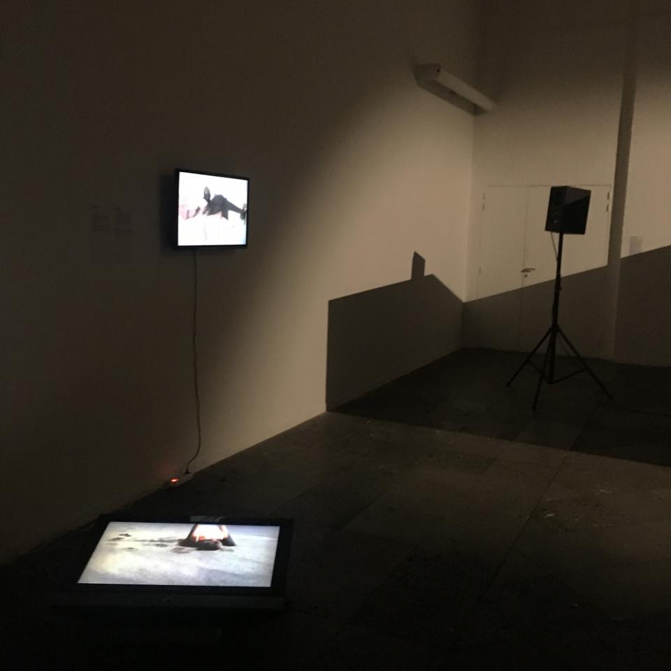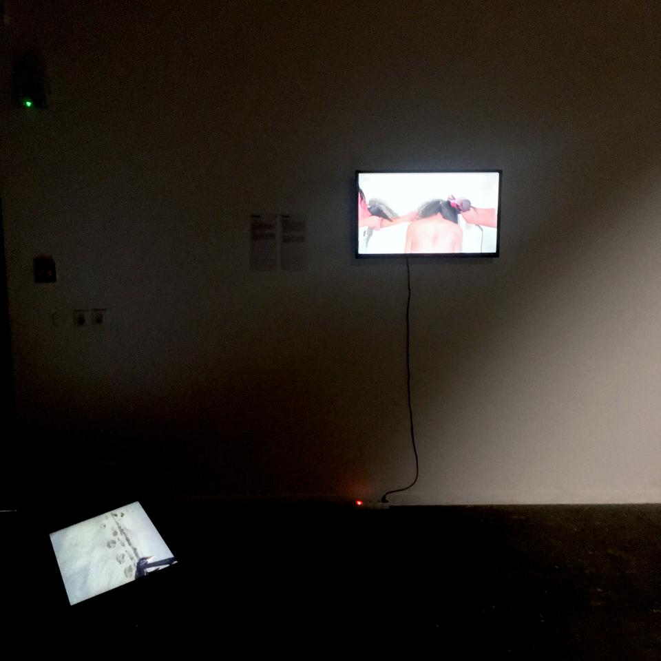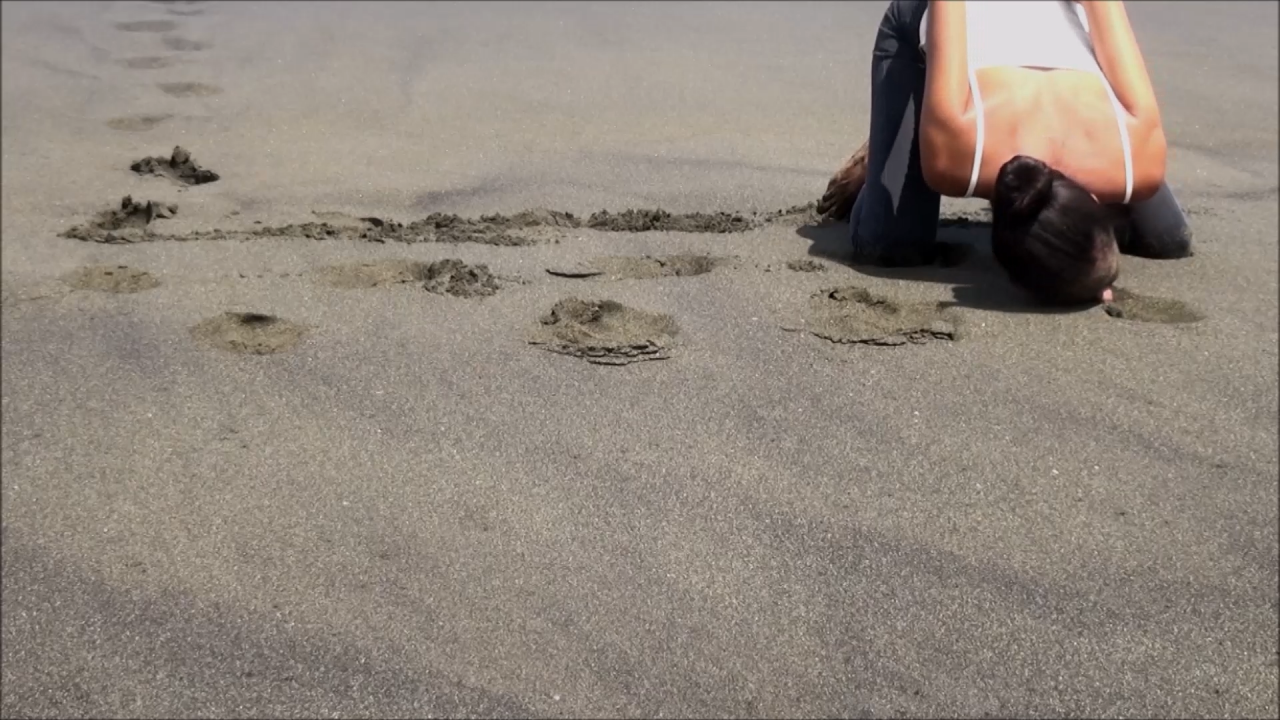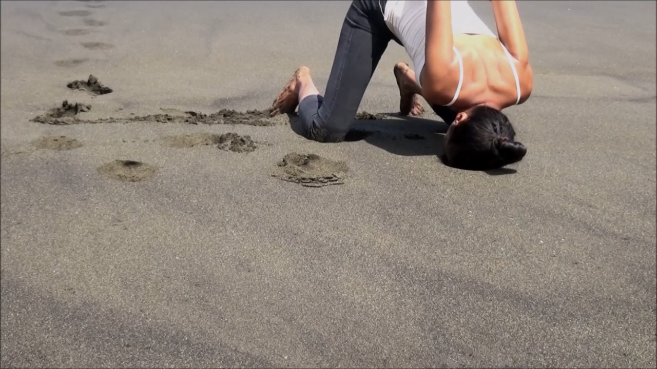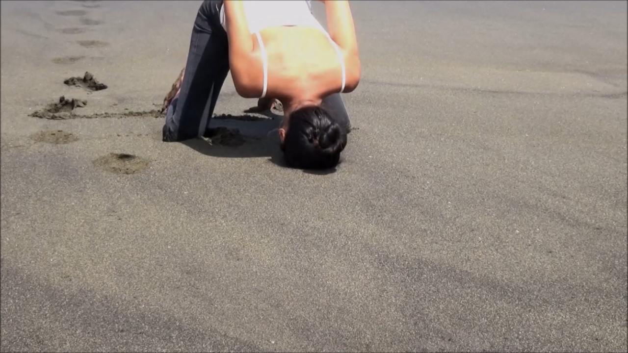 Cette vidéo a été réalisée sur une plage de sable noir de l’île de La Réunion, ici seul le corps s’exprime, il le fait par un langage poignant : les bras sont liés et la tête frappe le sol pour tenter de s’enfoncer fermement. Une trajectoire apparaît dans la répétition du mouvement. Le corps ne semble pas pouvoir communiquer autrement, en prise avec la folie.