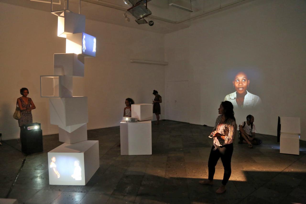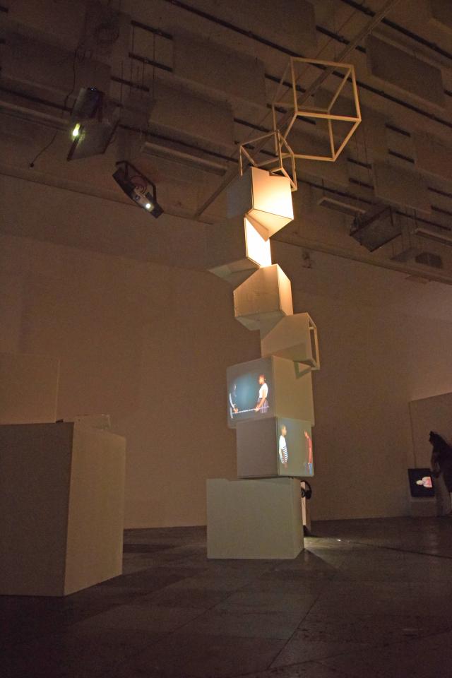 Installation vidéo, projection de la série de vidéos La Kour des Kerels sur cubes blancs de dimensions variables, projection murale et sur plasma.