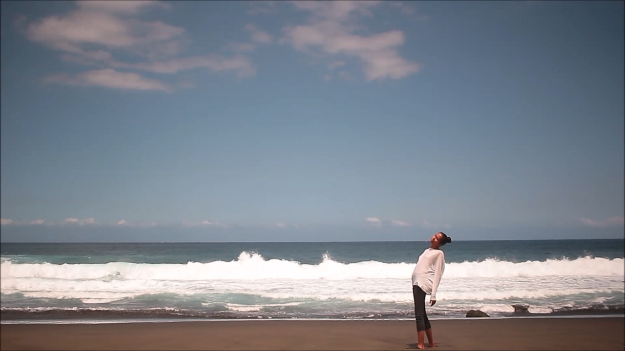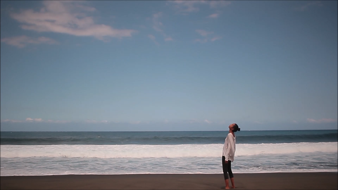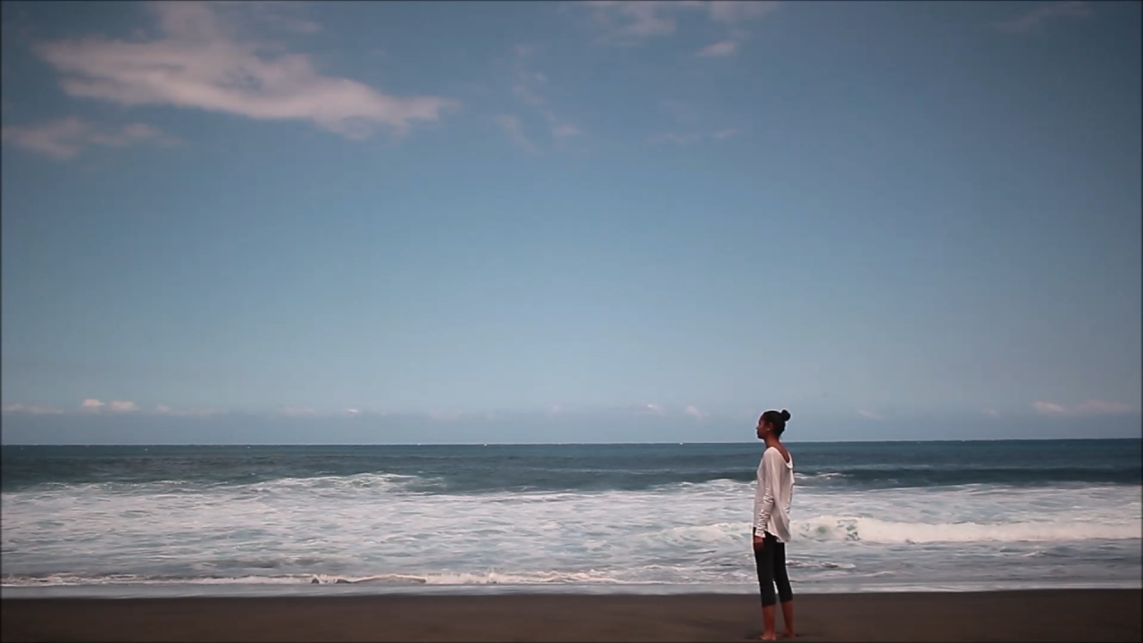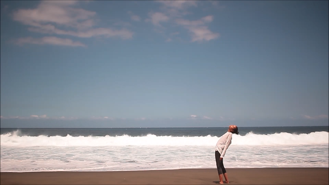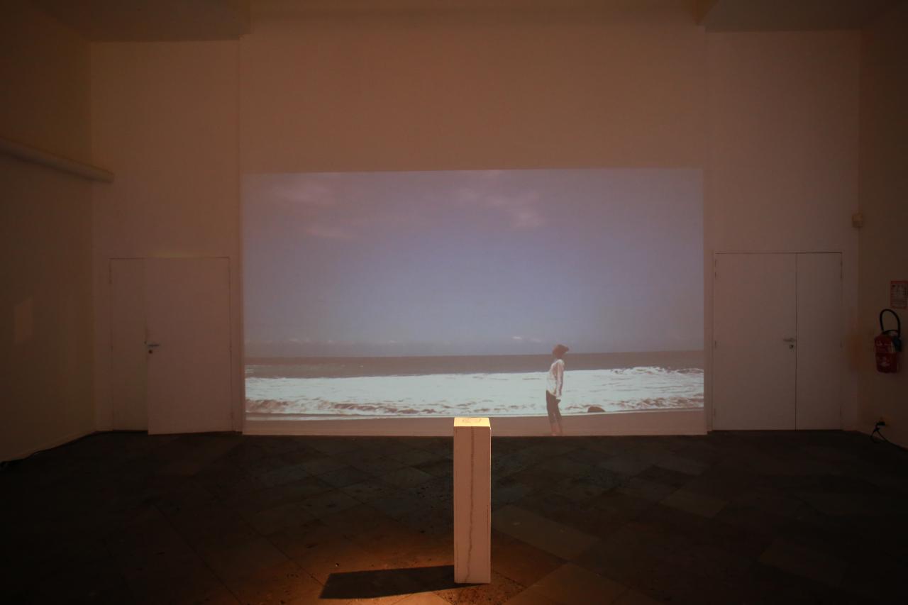 Ici l’espace que j’ai choisi est le bord de mer, qui symbolise des zones de départ et d’arrivée des voyageurs de tous les océans. Nous voyons dans un paysage horizontal une forme verticale. Un personnage est debout, les deux pieds bien ancrés dans le sable. Cette forme verticale se courbe de plus en plus parce qu’elle est confrontée de face aux rafales du vent. Ainsi pendant une durée de quarante-sept minutes et trente-sept secondes le corps tente de maintenir son équilibre.