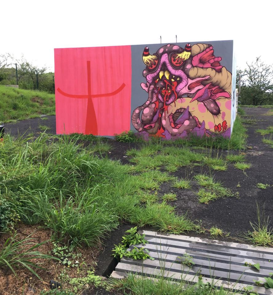 Peinture murale, acrylique et bombe aérosol sur mur, 200 x 240 cm.