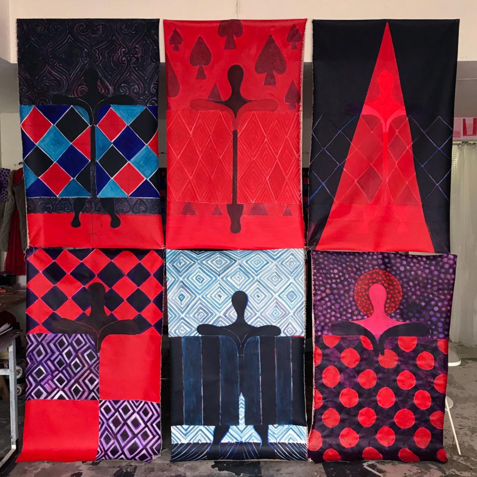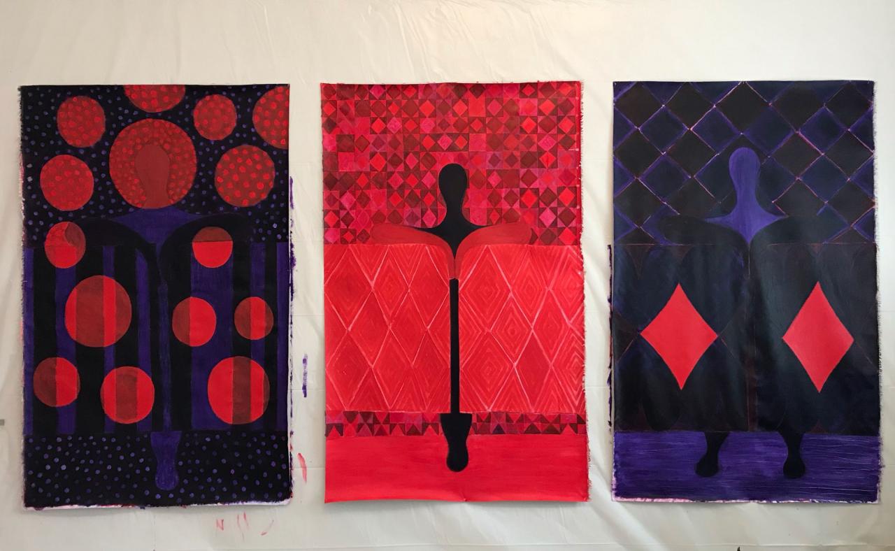 9 toiles. Acrylique, huile et pigments sur toile, 150 x 90 cm.