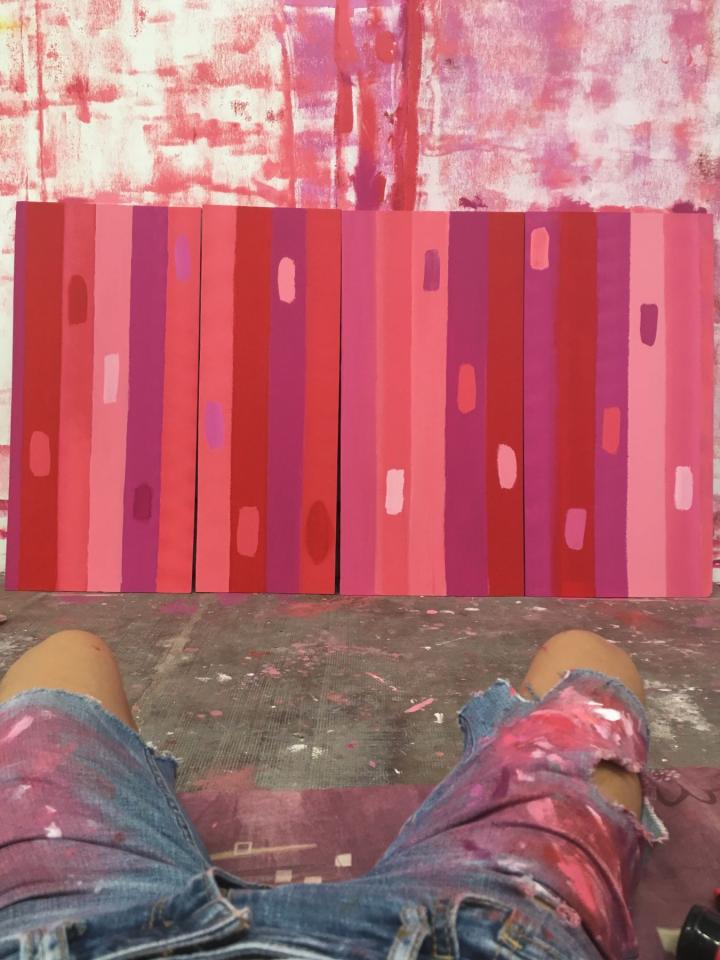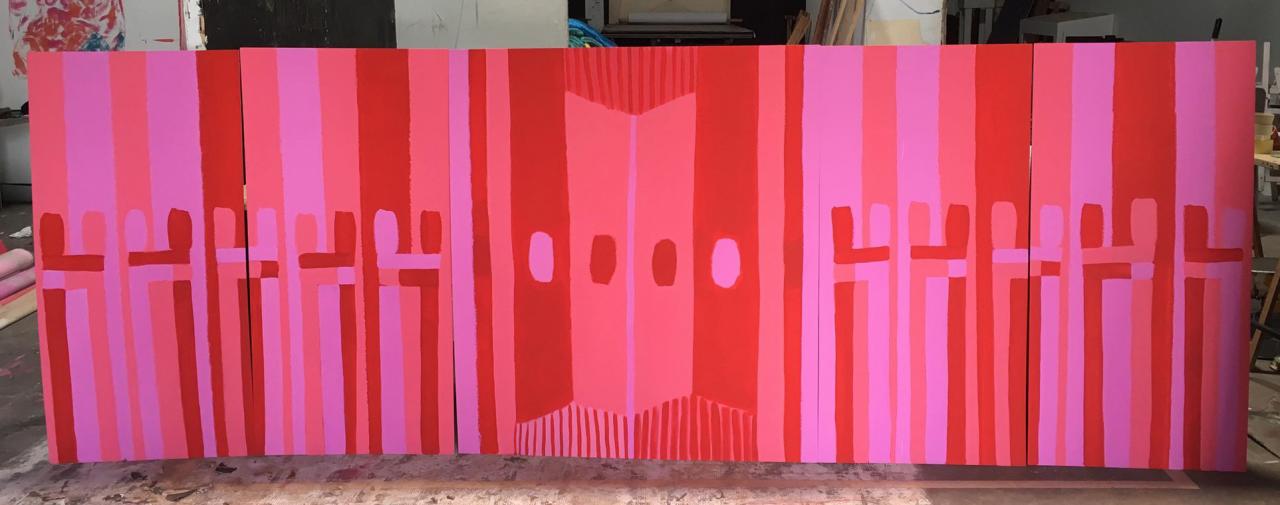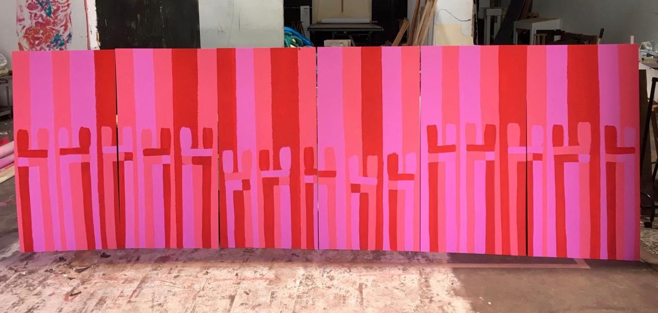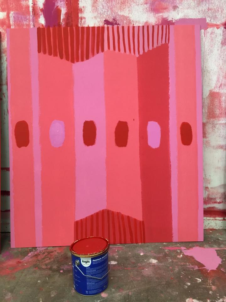 Genoux, bisous, cailloux Genoux, bisous, cailloux, 2020Peintures, acrylique sur contreplaqué bois,dimensions variables selon l’assemblage des panneaux de bois, largeur variable, hauteur 150 cm.Vues d’atelier La Friche, Le Port, La Réunion.