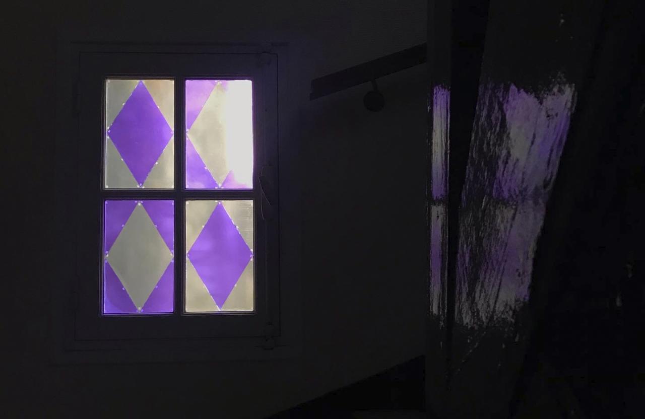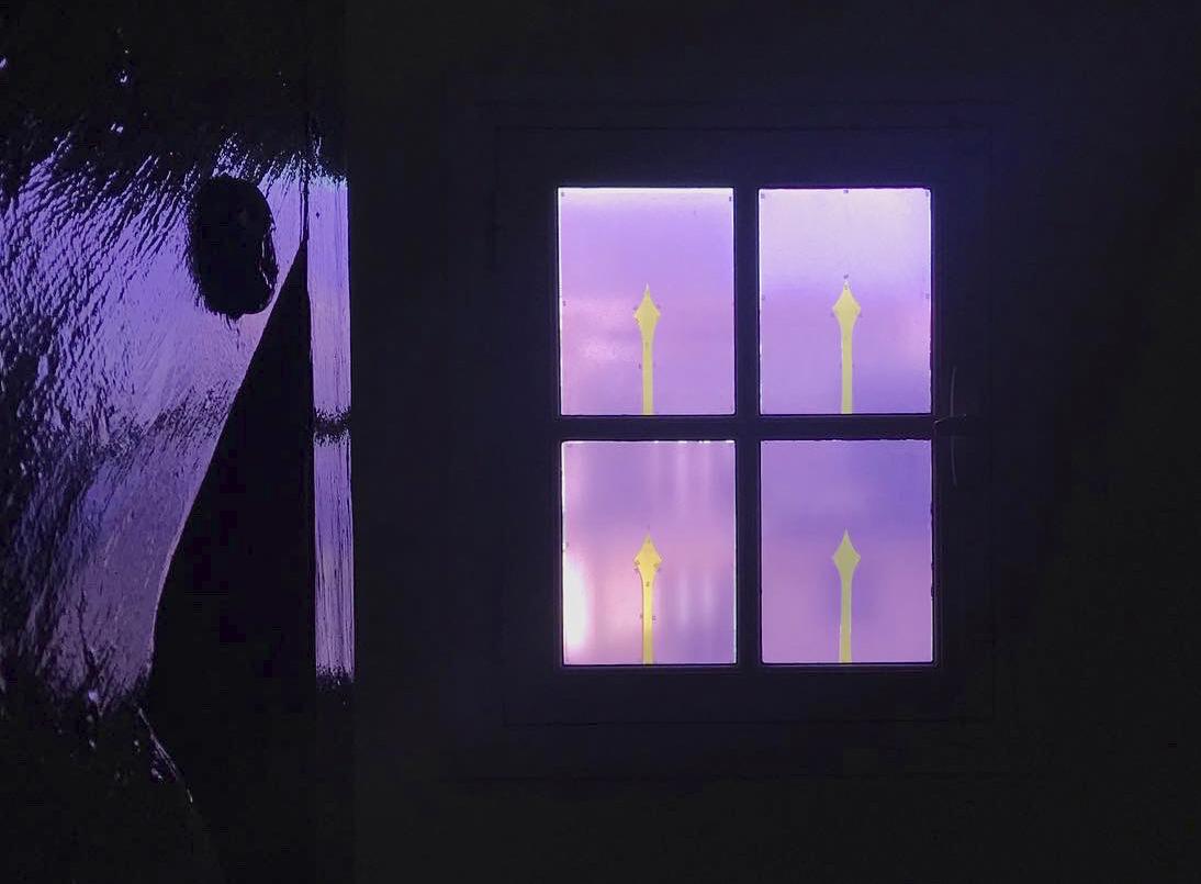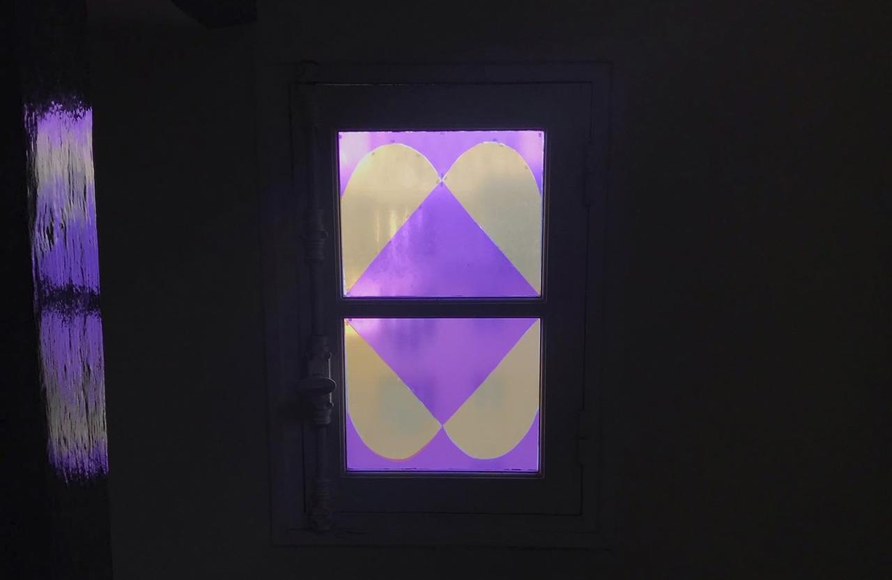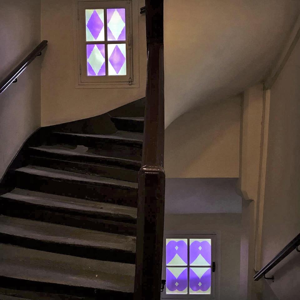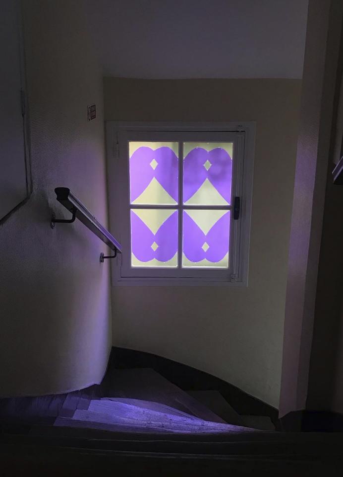 Hallway to Heaven Hallway to Heaven, 2022-2023Papier fleuriste coupé et collé sur verre, dimensions variables.Cité internationale des arts, Paris.