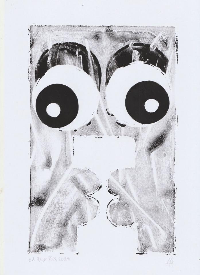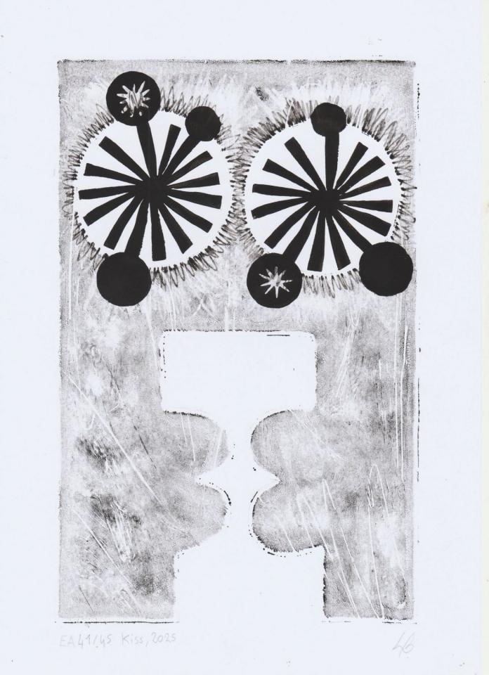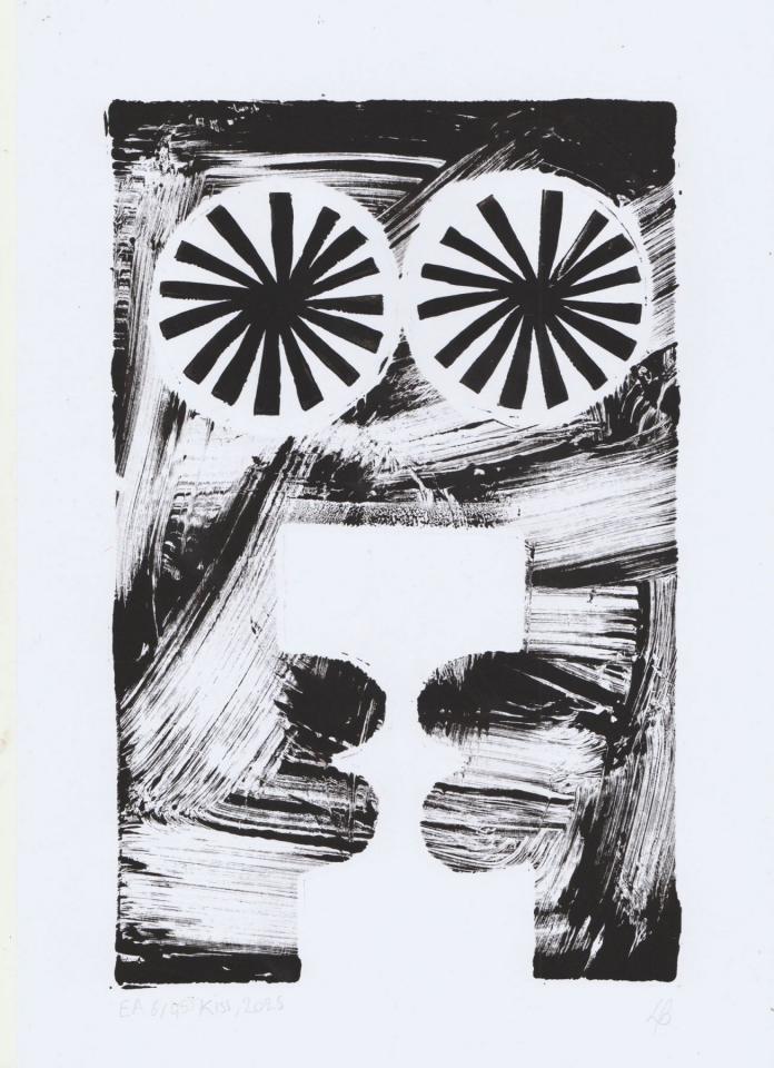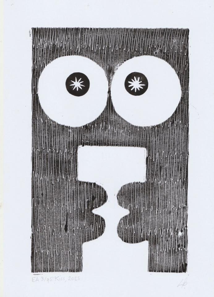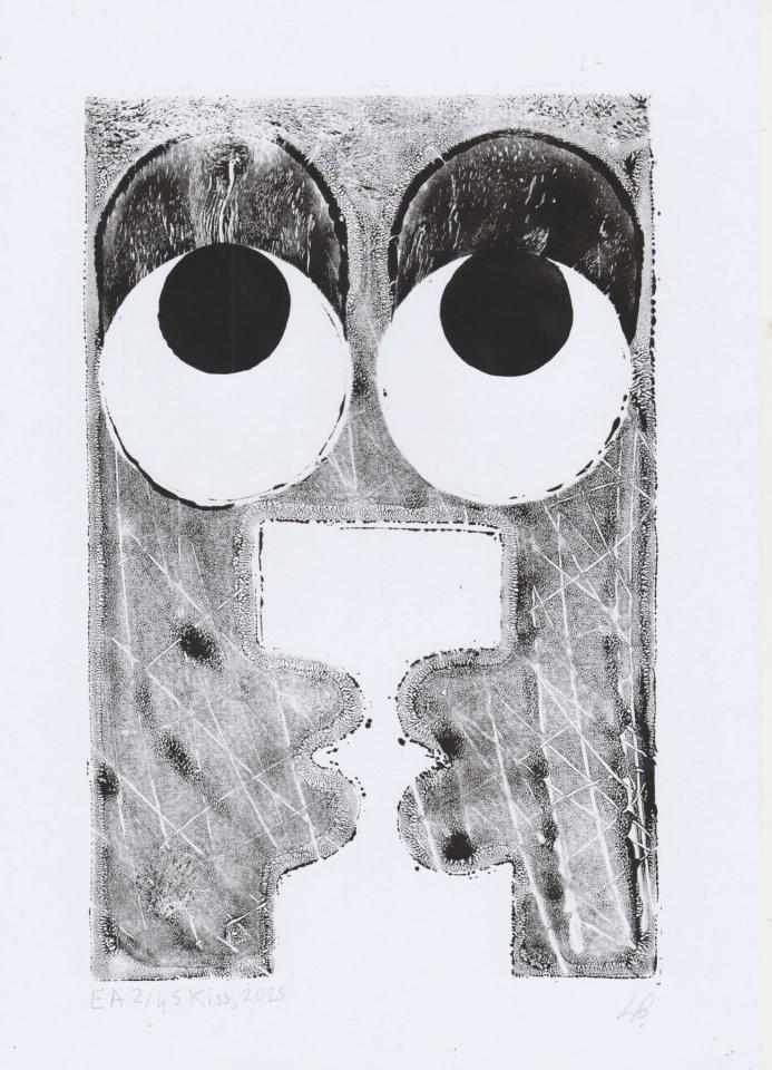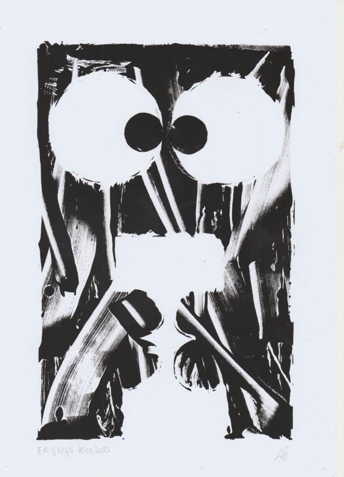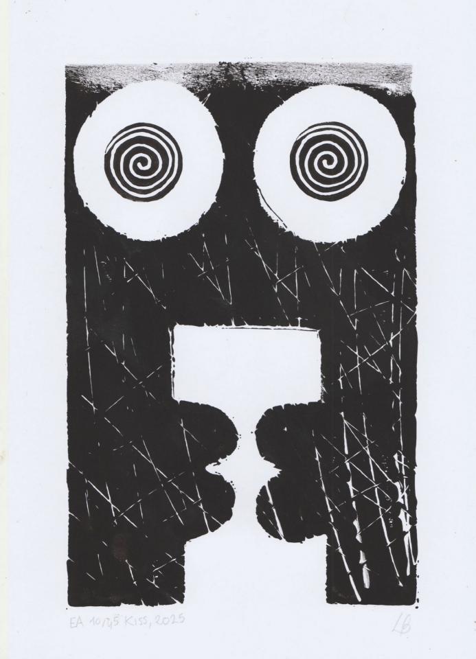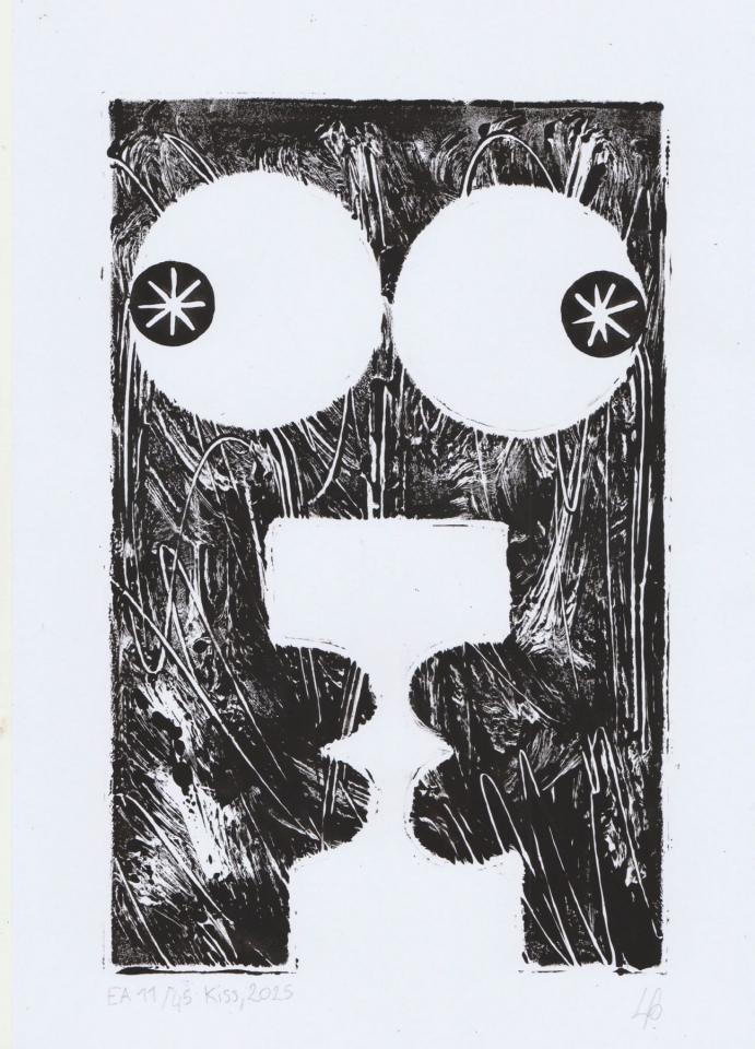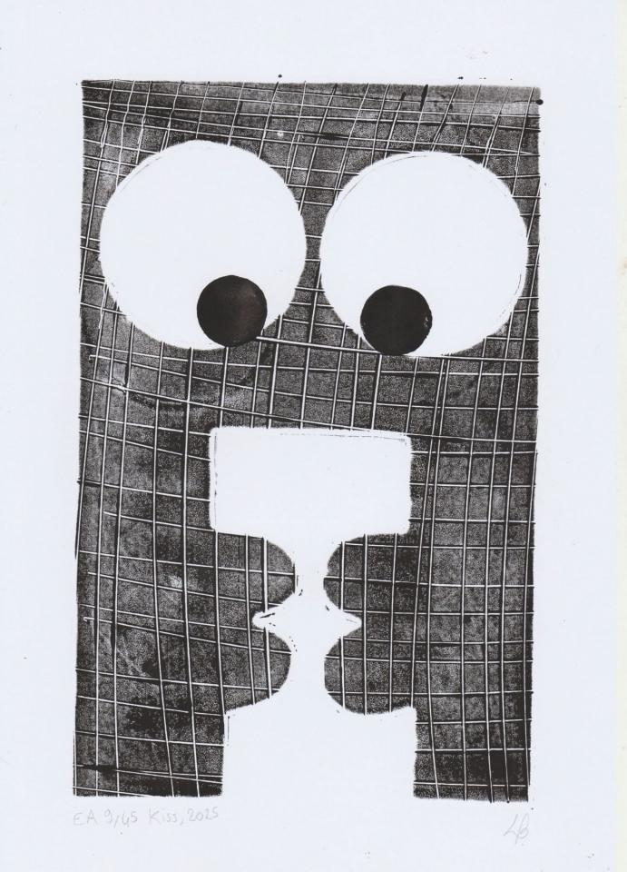 Kiss, 2025Monotypes et linogravures, encre sur papier, 21 x 29,7 cm.