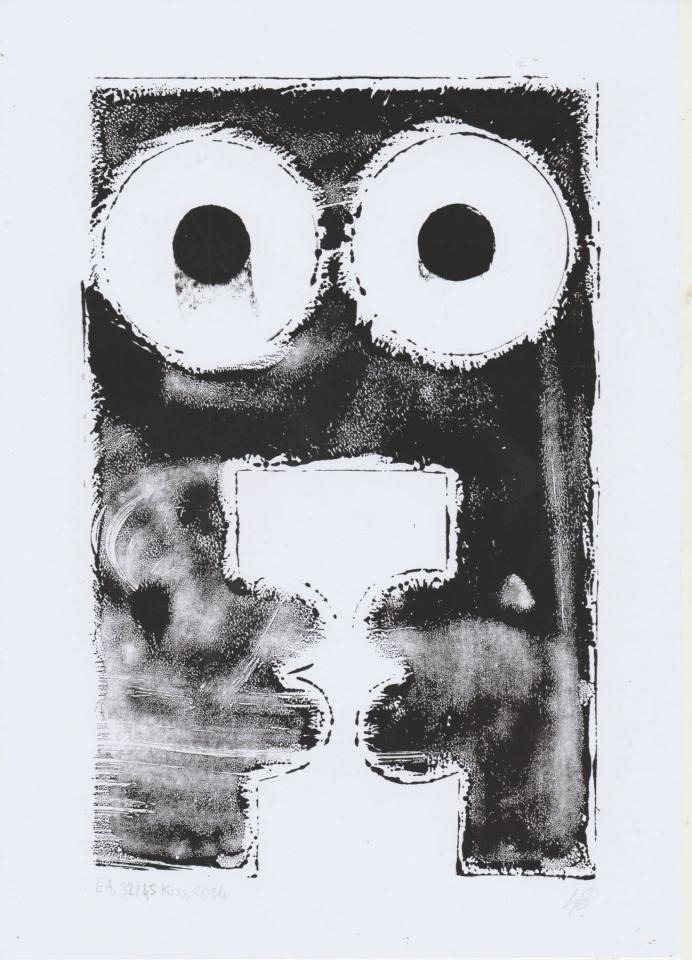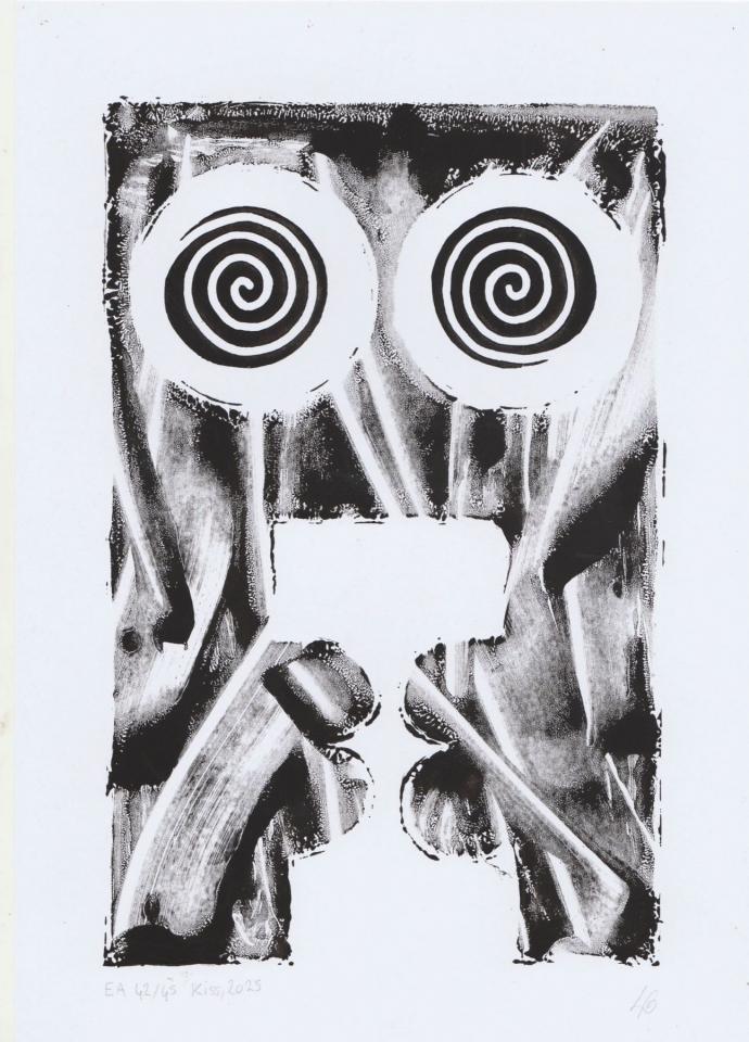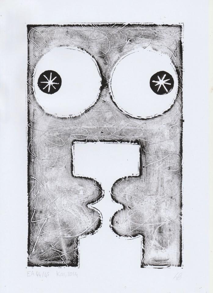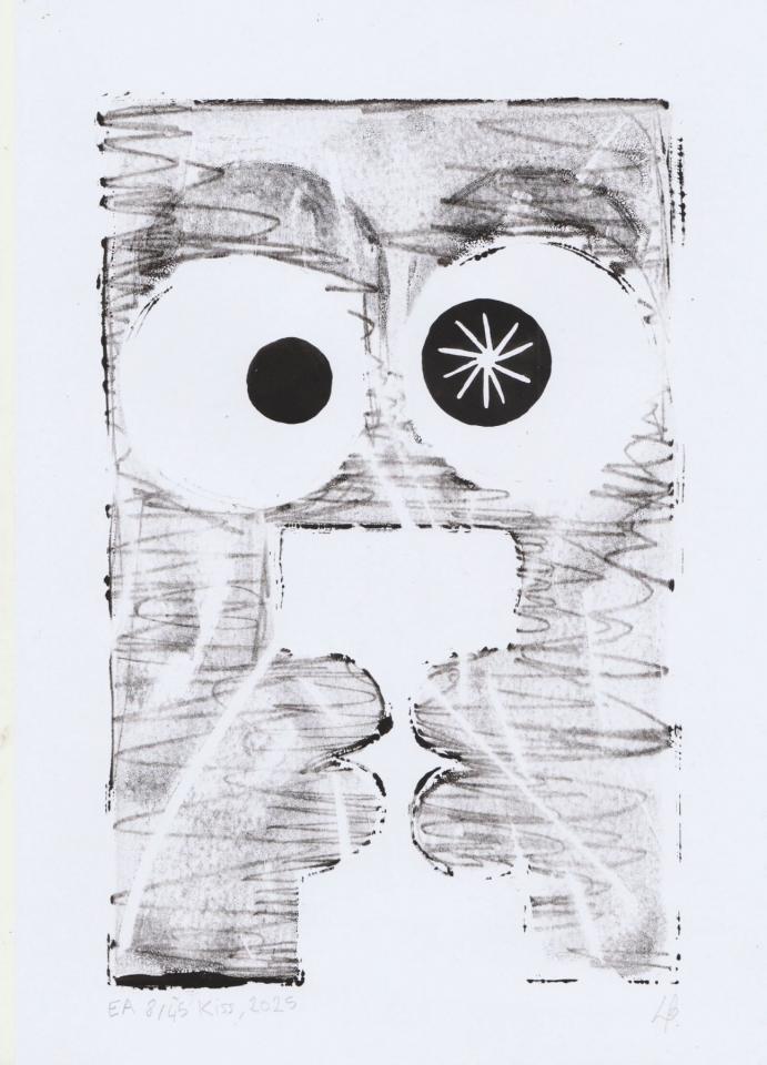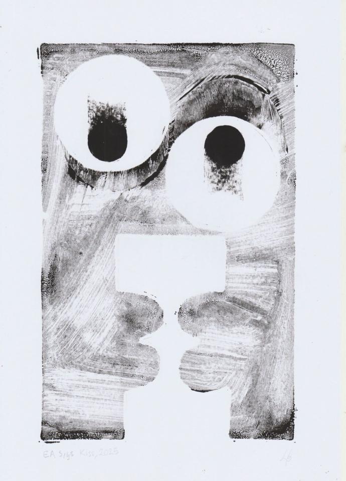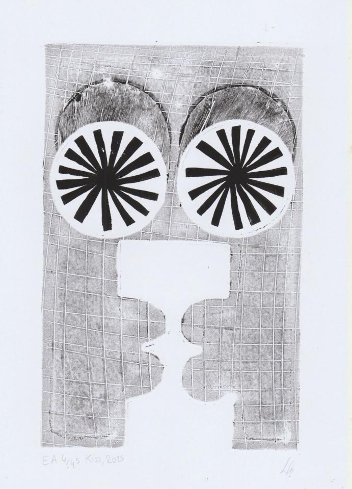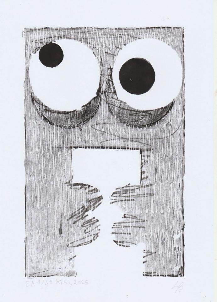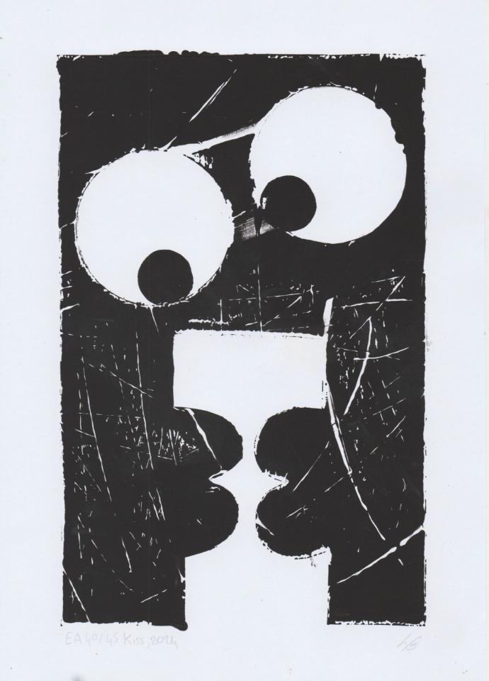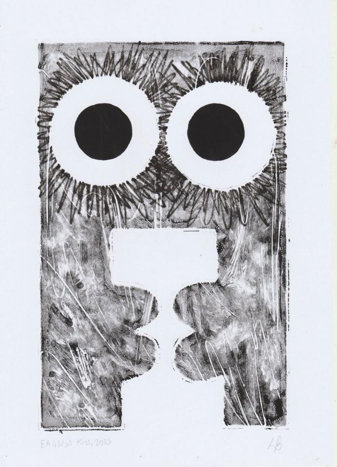 Kiss, 2025Monotypes et linogravures, encre sur papier, 21 x 29,7 cm.