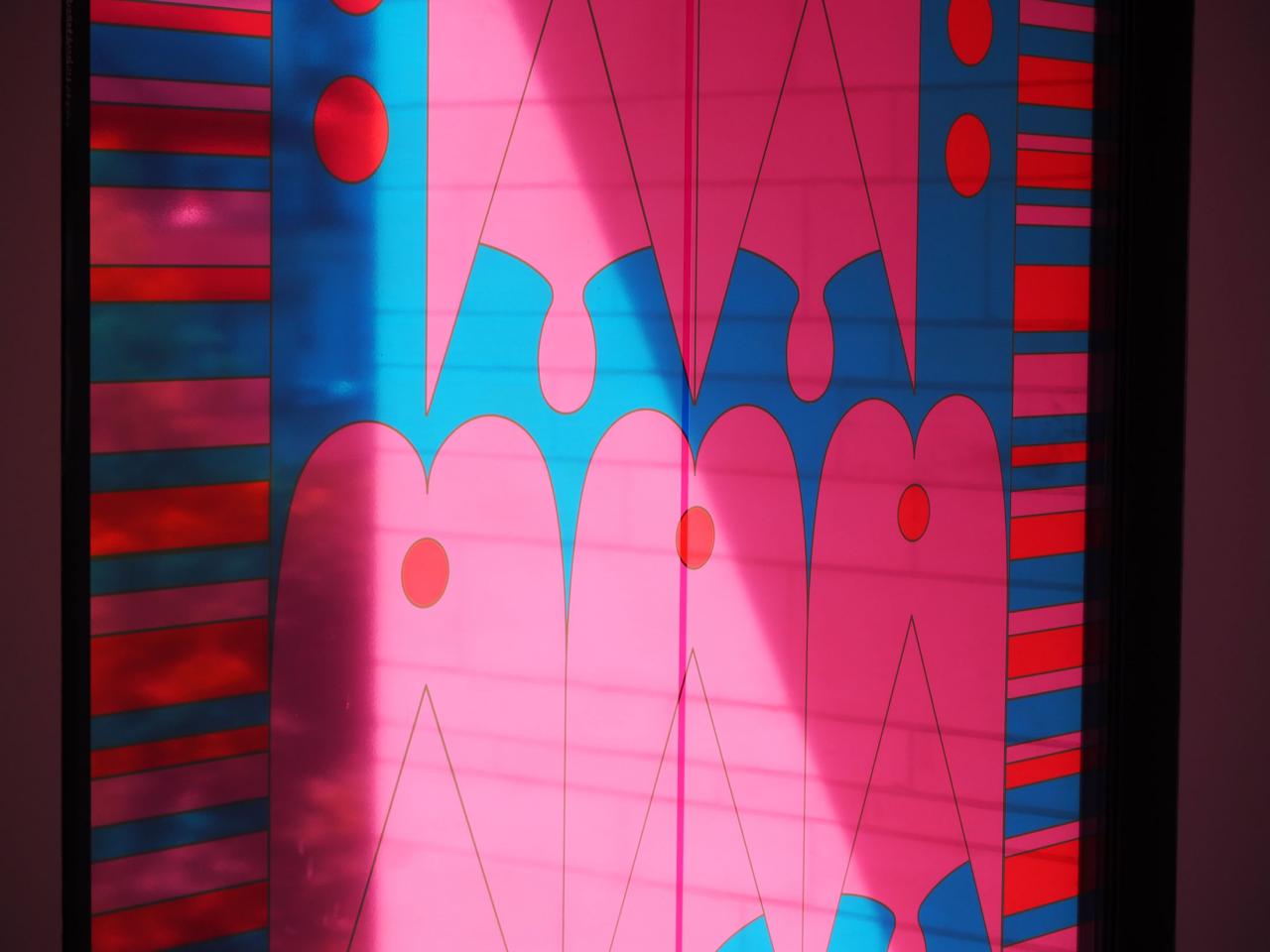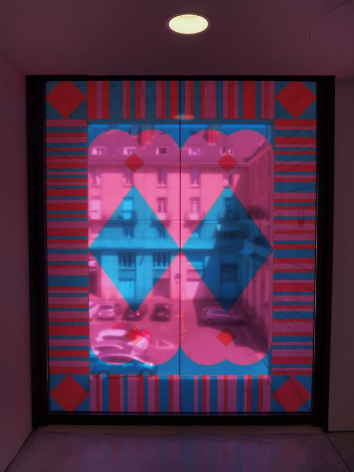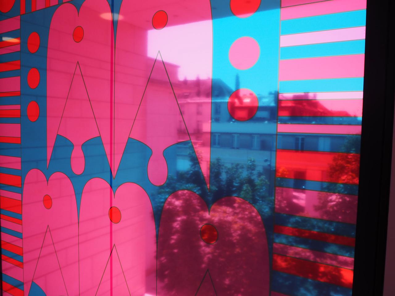 Vitrophanie collée sur verre, 240 x 213 cm.