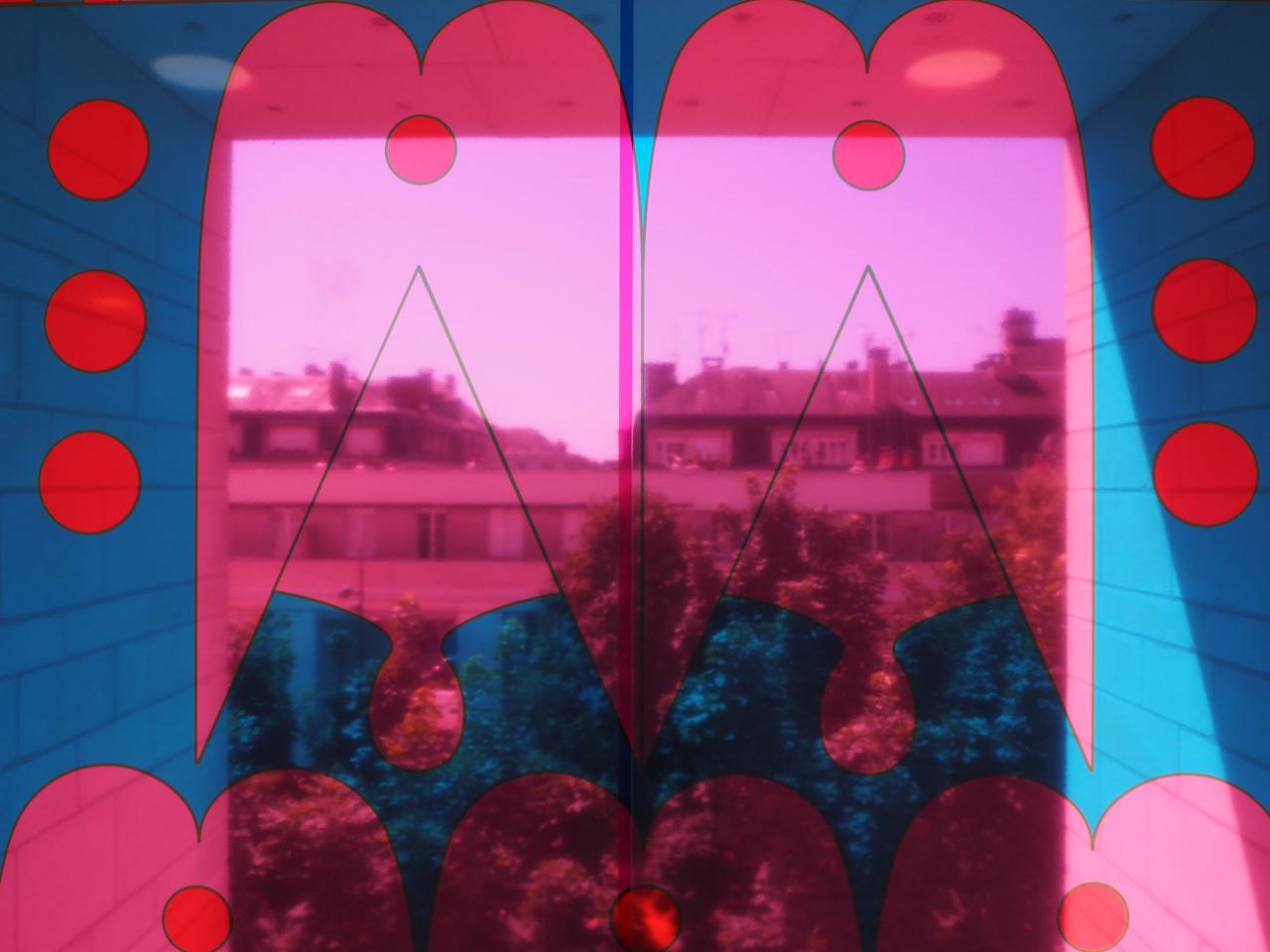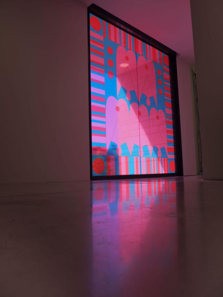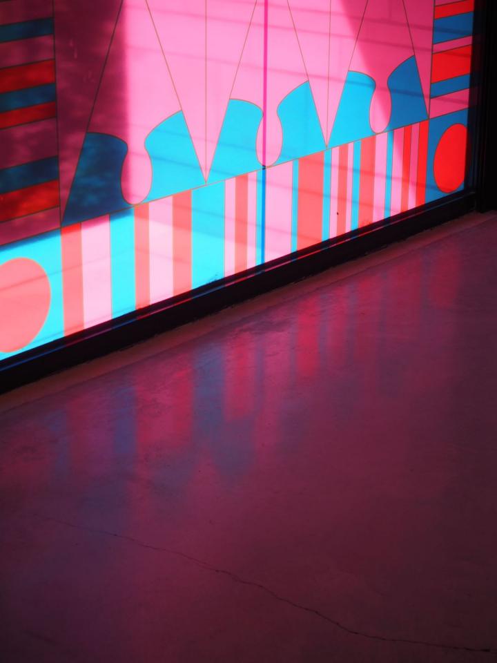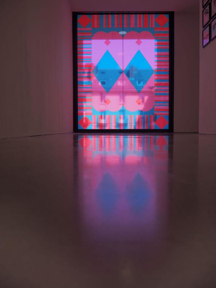 Vitrophanie collée sur verre, 240 x 213 cm.