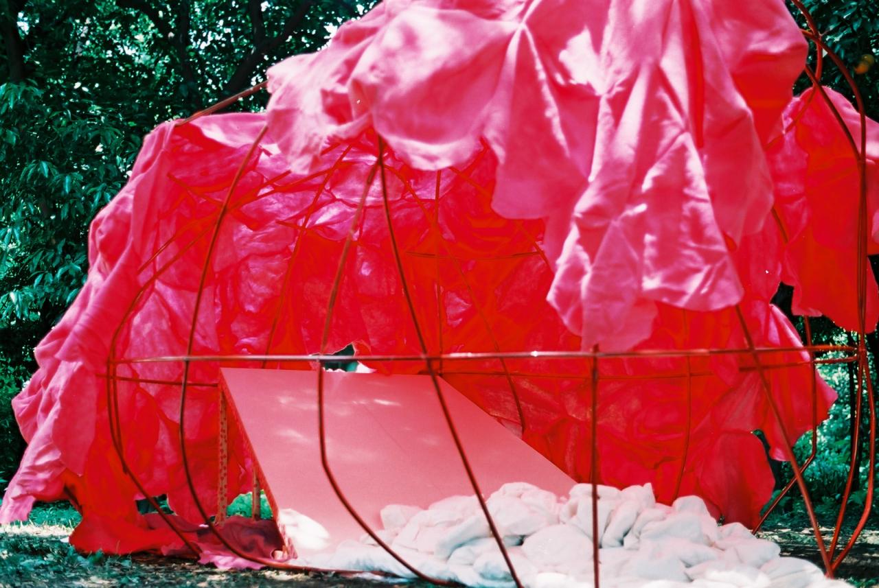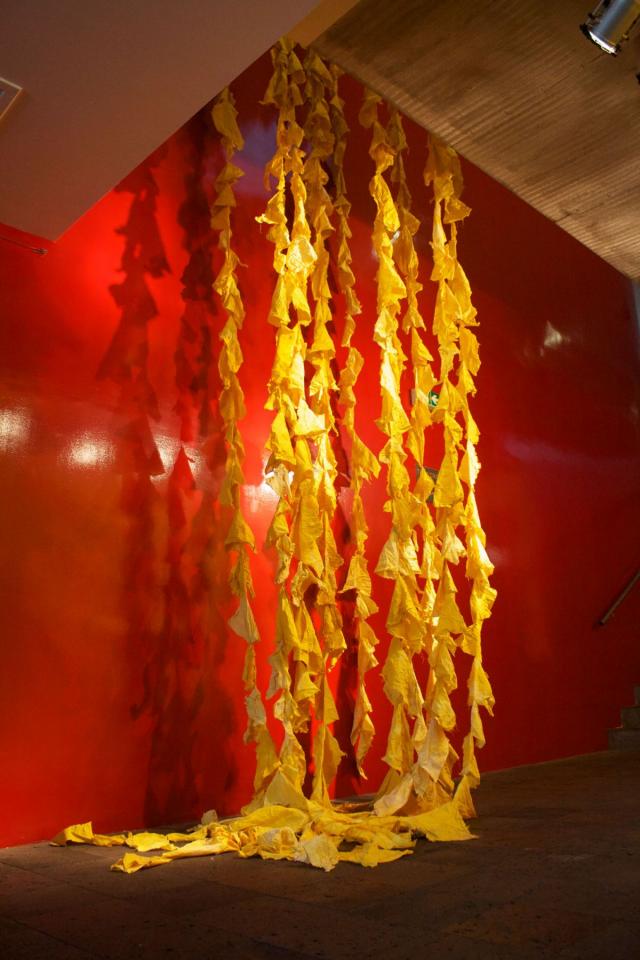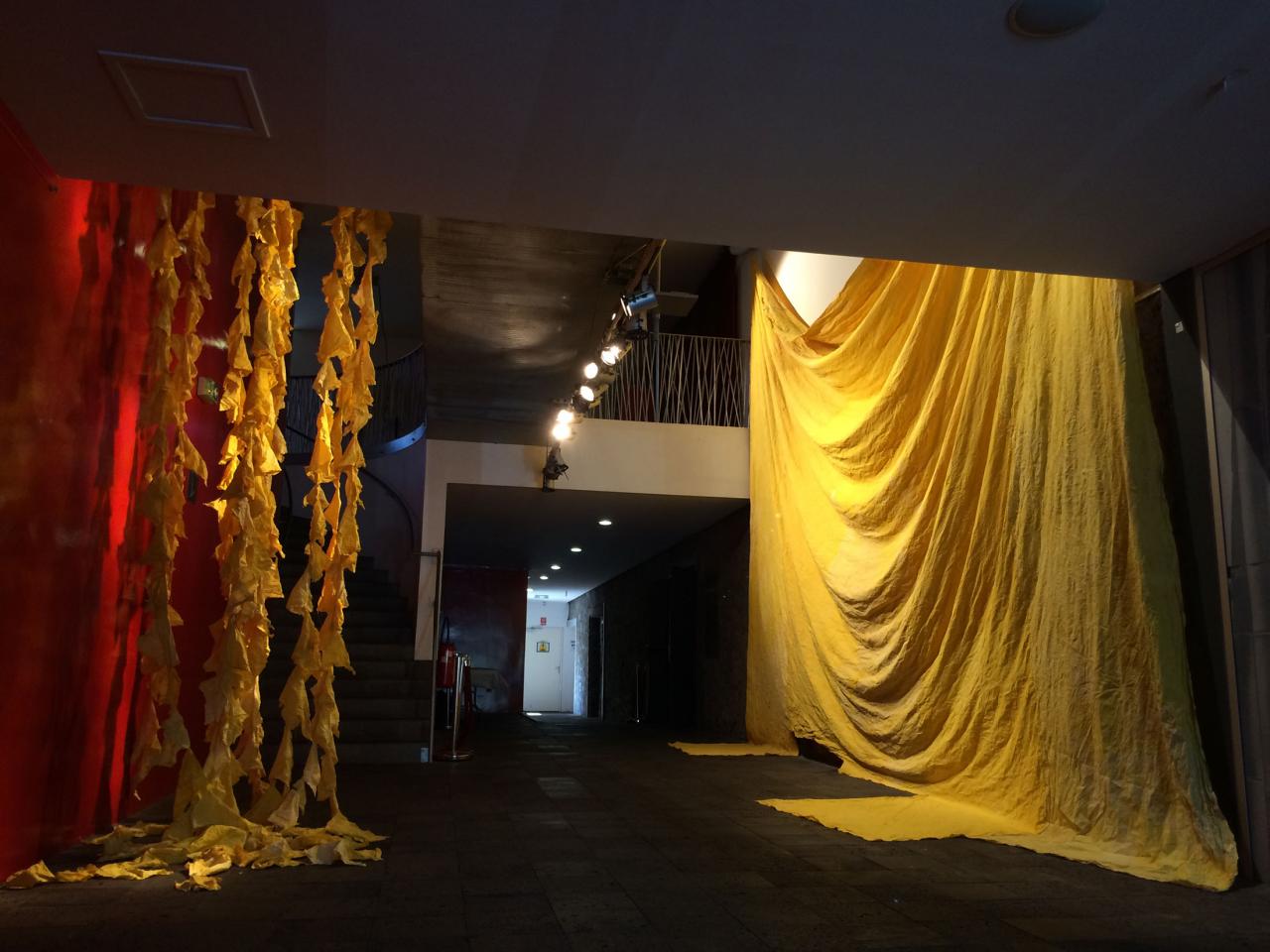 Installation, tissu teint (coton et polyester), molleton, tubes PVC, bois, 500 x 180 x 230 cm.
