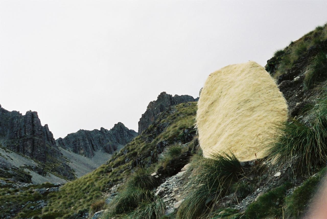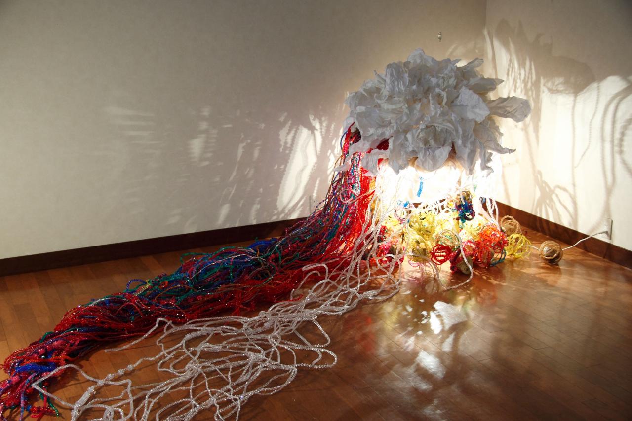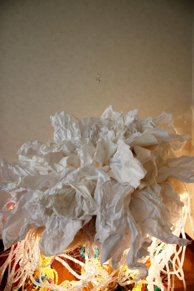 Installation, tissu en coton, pierres, verre fondu, perles d’acrylique,
