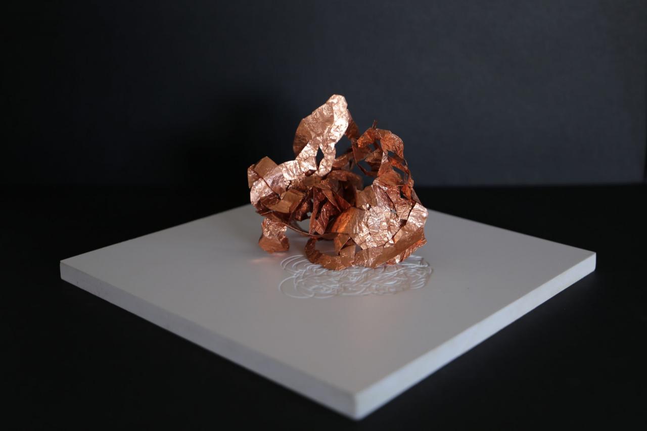 Sculpture, cuivre, résine estampée au fil de pêche (sans encre), hauteur 20 cm.