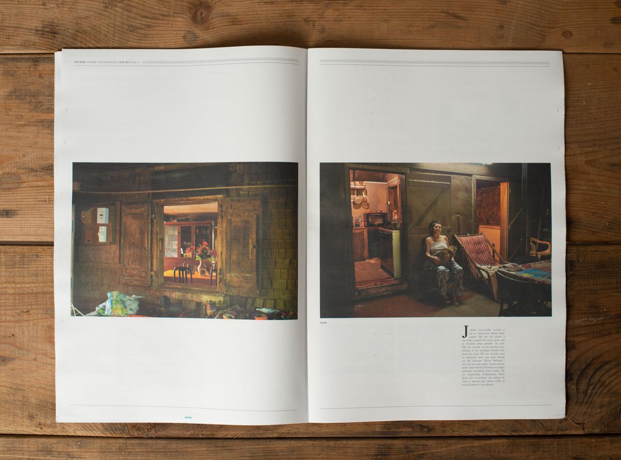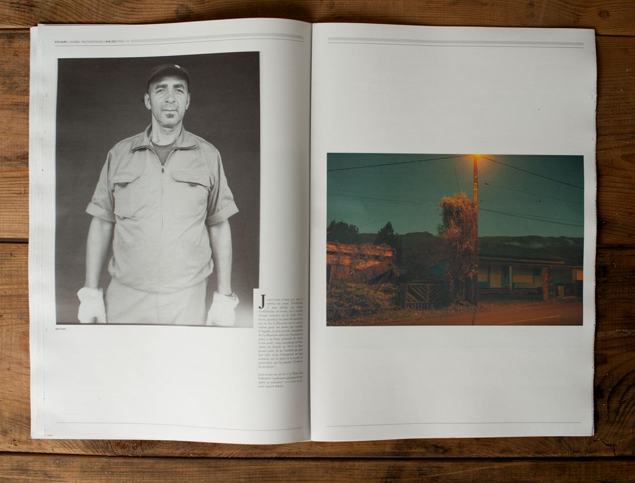 Romain Philippon : Absolument, c’est l’histoire de Tristan qui est en photo au tout début du premier numéro du journal. Il y a trois portraits en noir et blanc, il est l’un des trois. Il a une grosse barbe, un look de vagabond ; je l’avais croisé à un arrêt de bus et j’avais fait cette photo après avoir discuté avec lui. Cette image fait partie des premiers portraits que je prends à la volée sans connaître les gens. On retrouve un portrait de Tristan dans le dernier numéro de Fey Sonj, cette fois-ci il a une double page, il n’a plus de barbe et on découvre un autre homme… Mais pour en revenir à cette première photo que je lui avais donnée, j’ai appris bien plus tard qu’il la gardait comme un talisman et qu’il avait même confectionné un cadre dans l’atelier d’artisanat et d’art plastique de l’hôpital psychiatrique où il allait consulter régulièrement. Cette photo lui donnait une direction dans laquelle se projeter car il ne voulait plus ressembler à l’homme qui était dessus. En fait, on ne le connaissait pas bien, on savait juste qu’il y avait plein d’histoires qui se racontaient sur lui, il était considéré un peu comme le fou du village et même s’il n’avait pas l’air simplet ; avec nous, il avait toujours eu l’air très stable, il était cultivé et on avait des discussions riches. Un jour, lors d’une restitution autour d’un verre que l’on faisait pour chaque sortie de journal, comme à chaque fois on conviait tout le monde à passer. Un homme arrive en moto, on comprend assez rapidement qu’il n’est pas de la plaine et il nous dit : « je viens voir ce qui se passe ici, je voudrais comprendre ce que vous faites. » Il nous apprend qu’il est le psychiatre de Tristan et qu’il est intrigué parce qu’apparemment notre travail a influencé le comportement de son patient et depuis quelque temps Tristan va mieux. C’est lui qui nous révèle le lien que Tristan entretient avec cette image, Tristan, lui, ne nous en avait jamais parlé. C’est en présence de son psy qu’il va se confier pour la première fois et nous donner sa version complète. J’en profite pour lui demander son accord afin de raconter son histoire car tout le monde avait des versions différentes de sa vie, certaines personnes pensaient même qu’il avait brûlé sa maison et tué ses enfants. Il se disait des choses assez sordides sur lui. On racontera donc son histoire dans le dernier numéro du journal de manière poétique et détournée. C’est le seul texte que ni Thierry ni moi n’avons écrit ; on a demandé à une amie rédactrice de le rédiger et elle en a fait une histoire un peu fictionnelle qui lui convenait très bien. Tristan est un personnage important parce qu’il a été là depuis le début, il passait souvent prendre un café et il nous a accompagné jusqu’à la fin. »