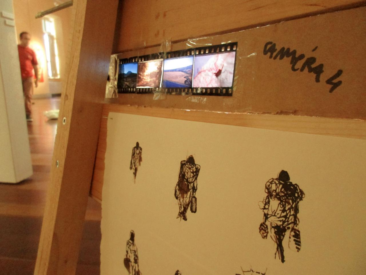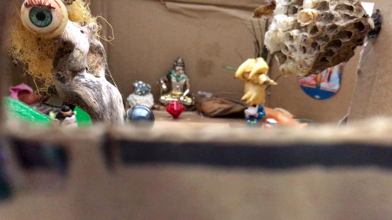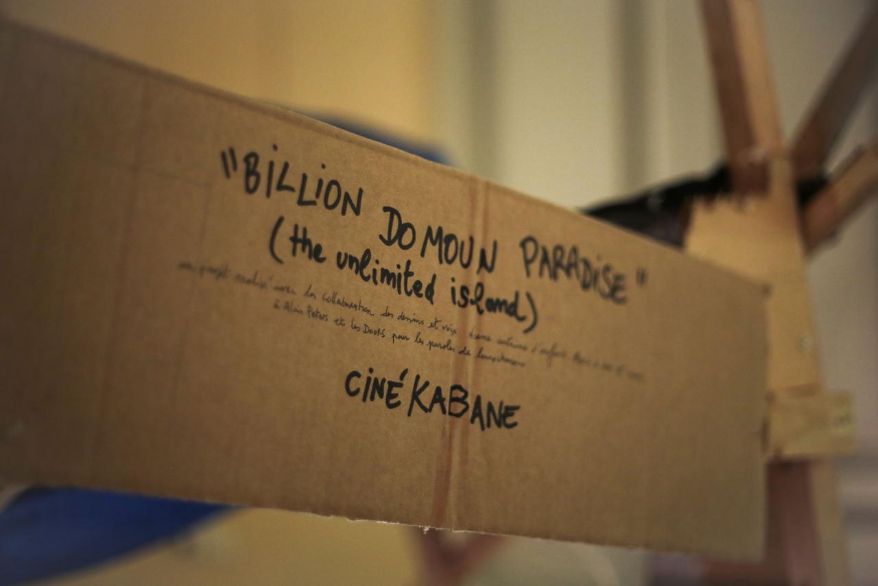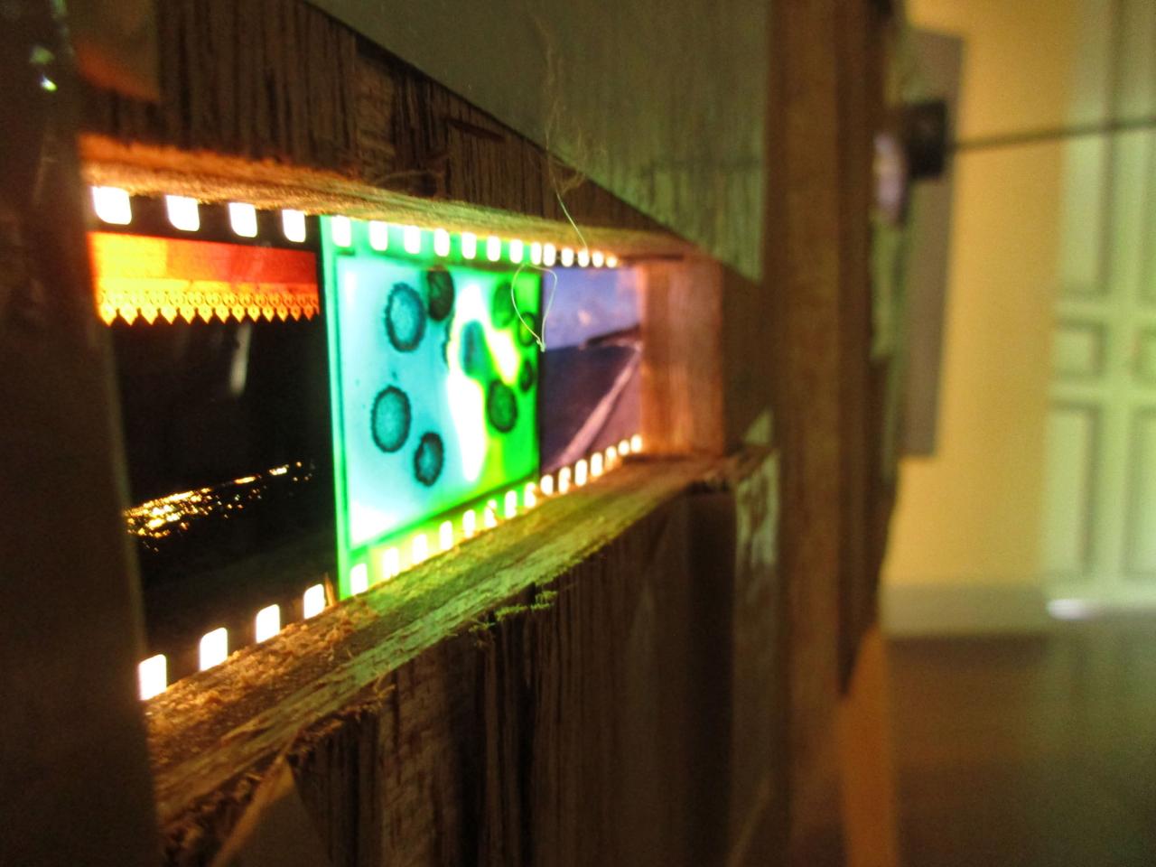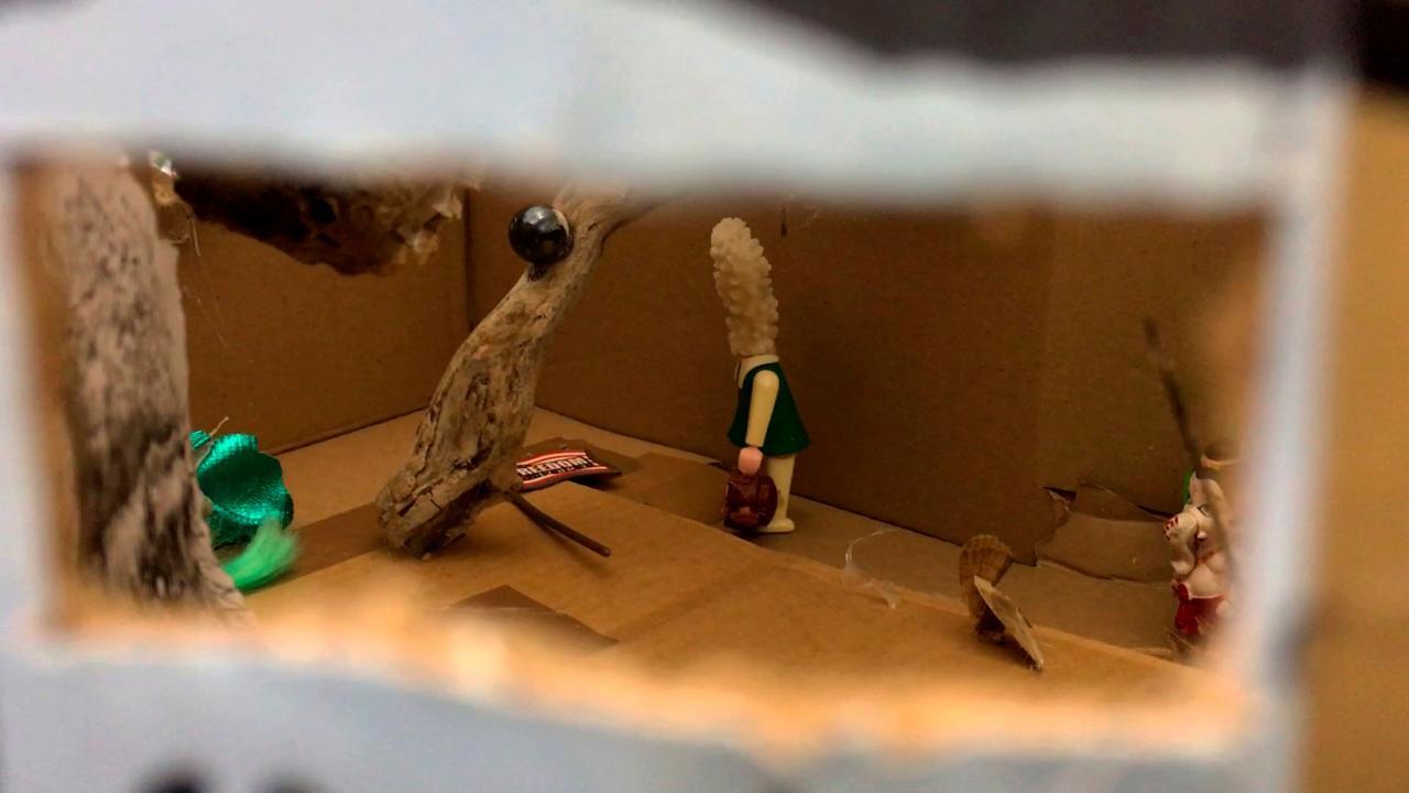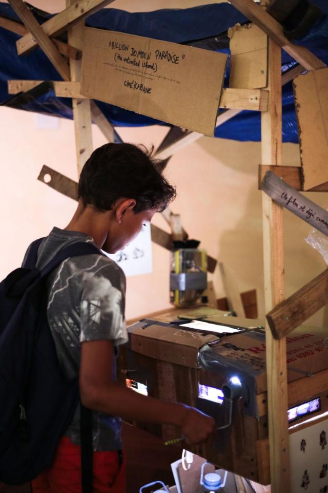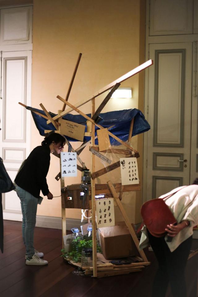 Installation interactive, matériaux de récupération (bois, cartons, bâche, objets divers), dispositif sonore (lecteur CD, amplificateur, enceinte, bande audio en boucle), dispositif visuel (diapositives, rouleau de dessins sur calque, boîte à manivelle), lumière,