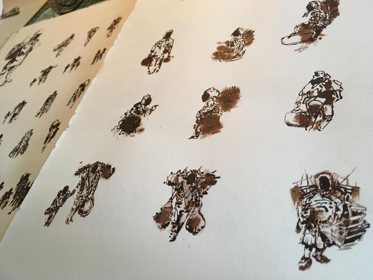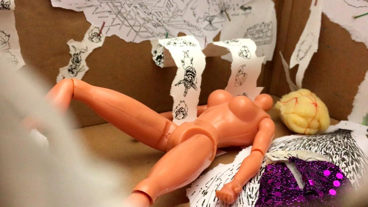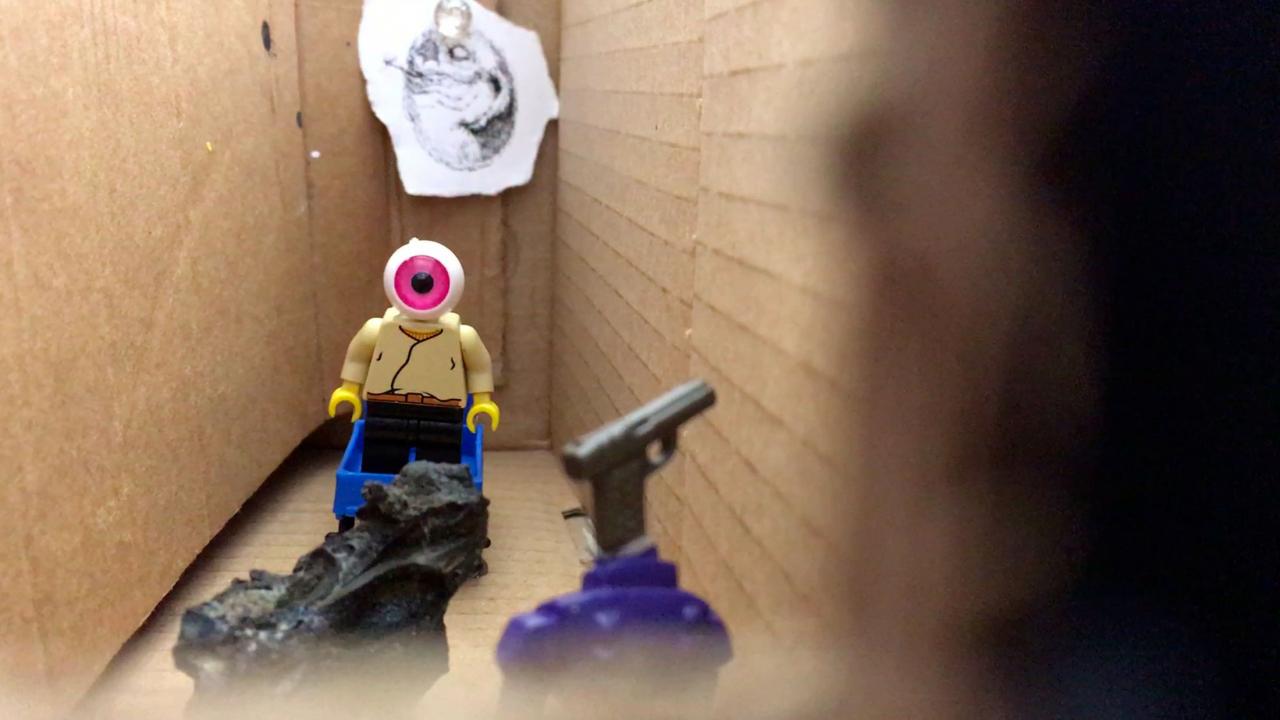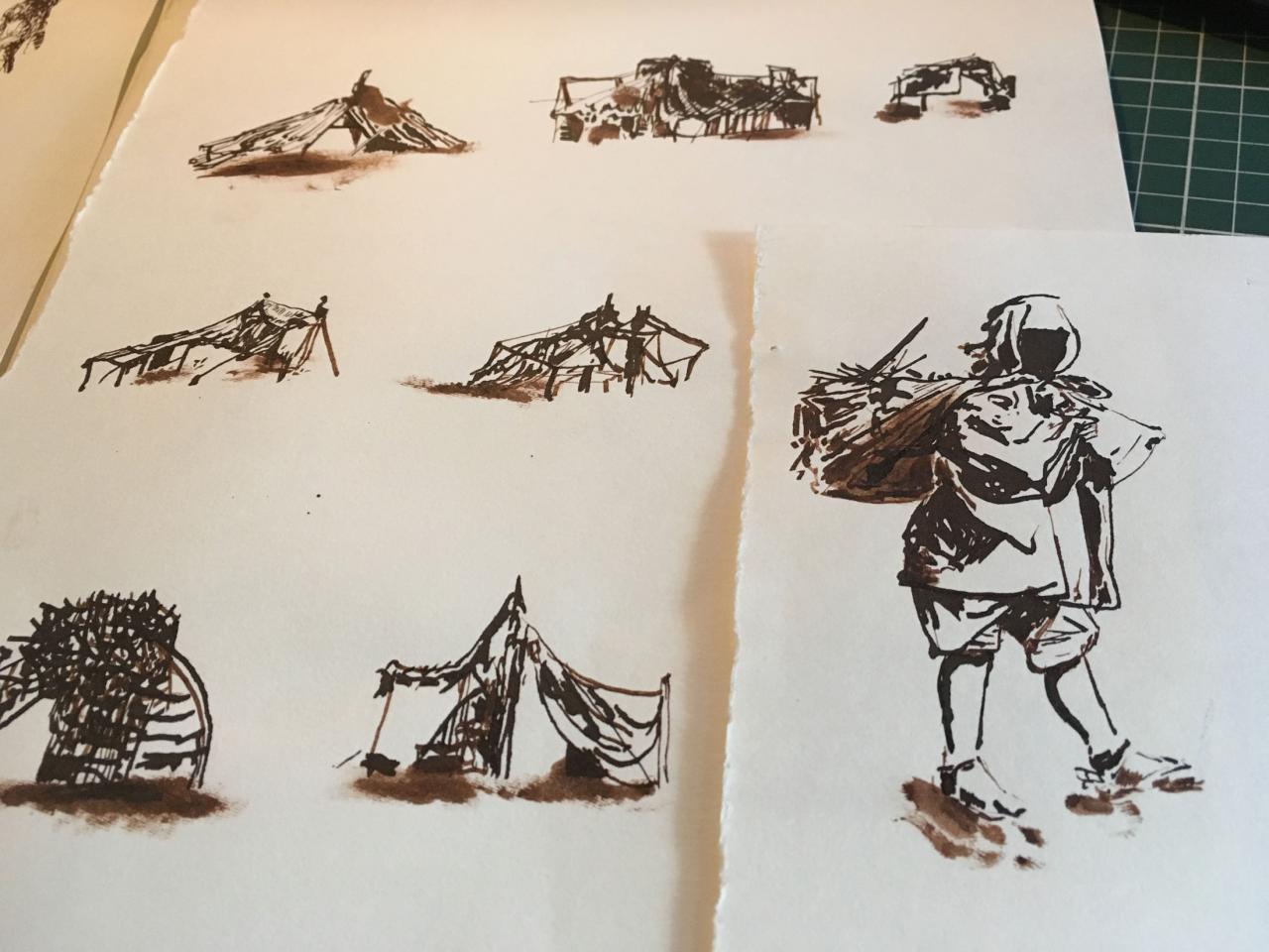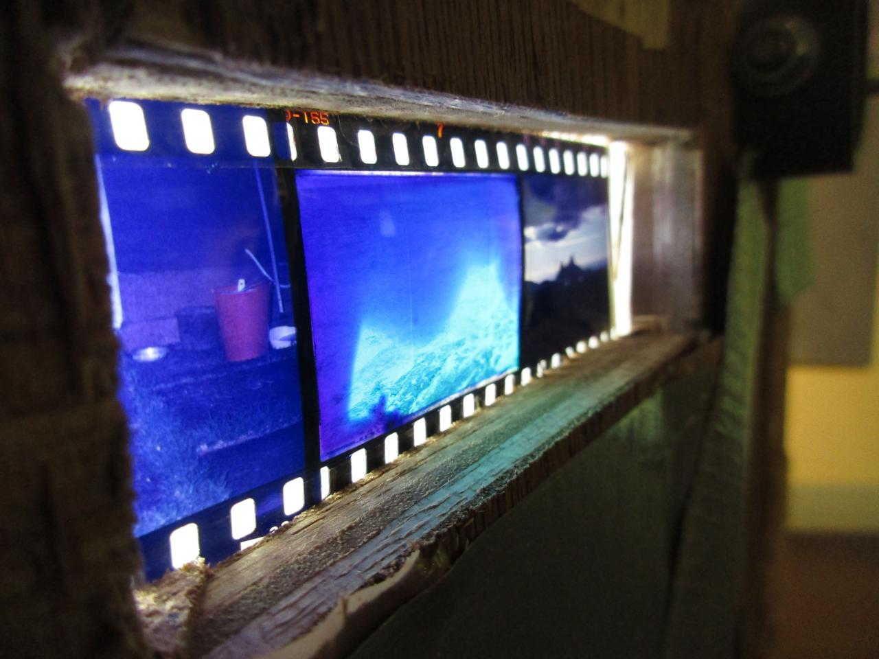 Installation interactive, matériaux de récupération (bois, cartons, bâche, objets divers), dispositif sonore (lecteur CD, amplificateur, enceinte, bande audio en boucle), dispositif visuel (diapositives, rouleau de dessins sur calque, boîte à manivelle), lumière,
