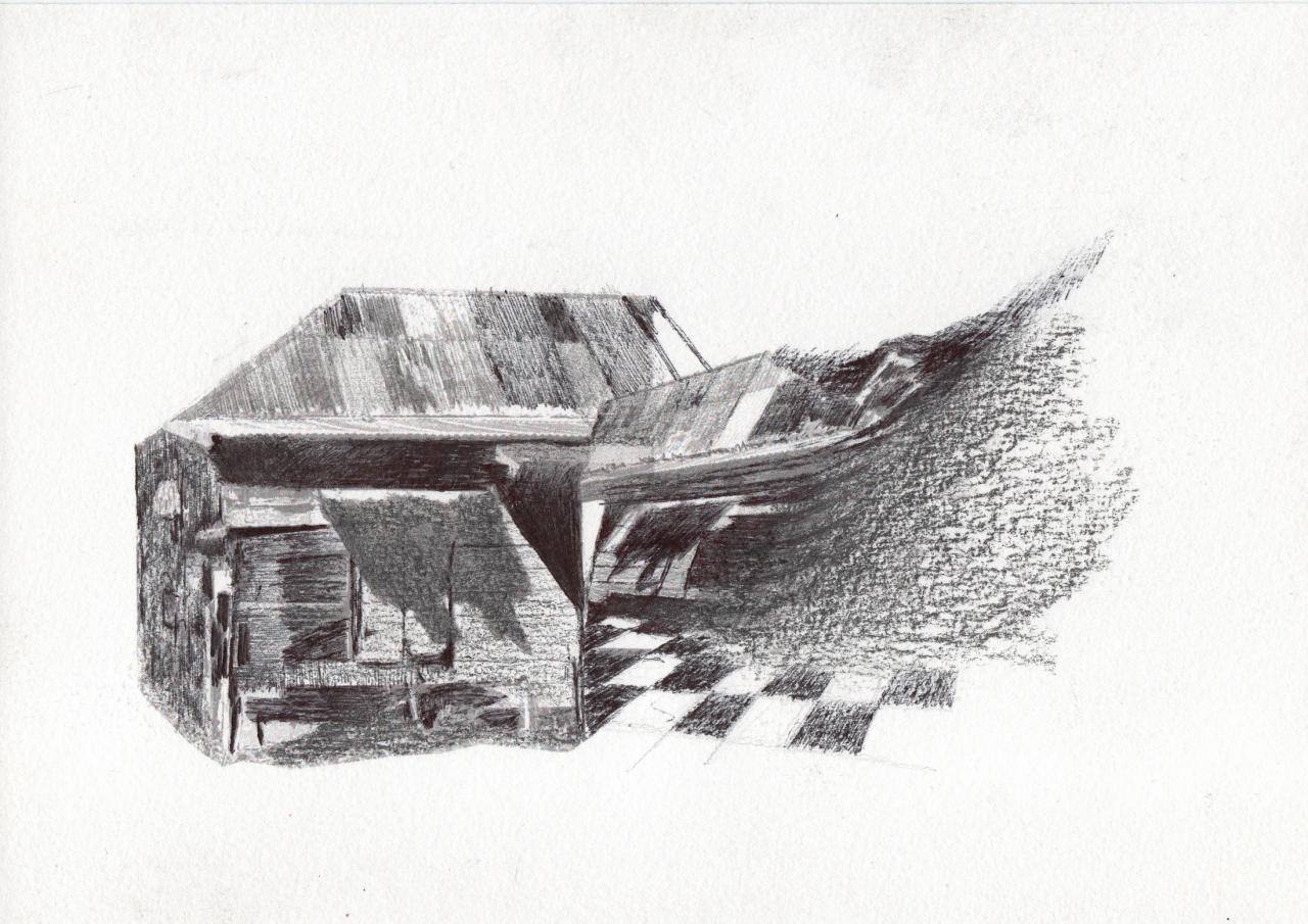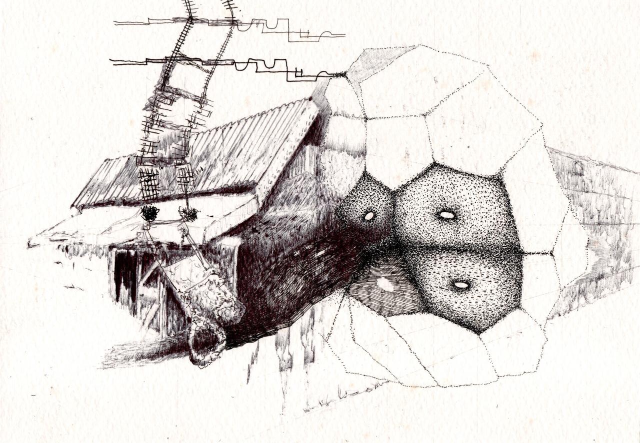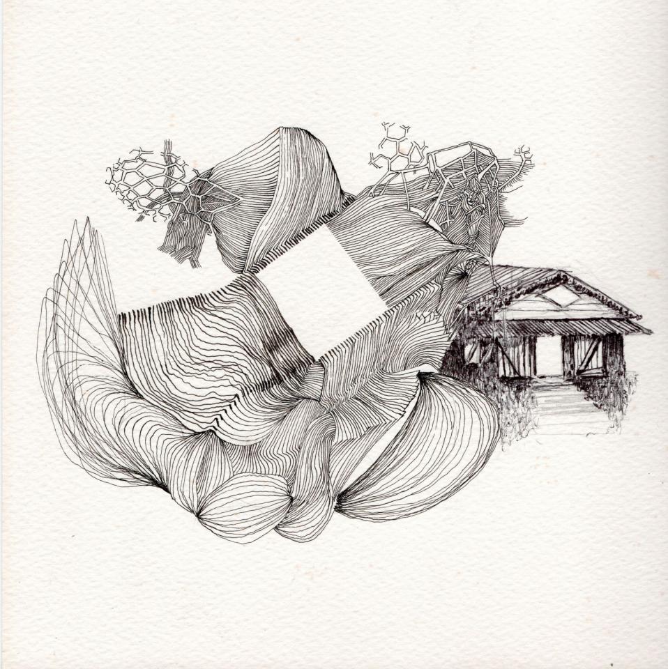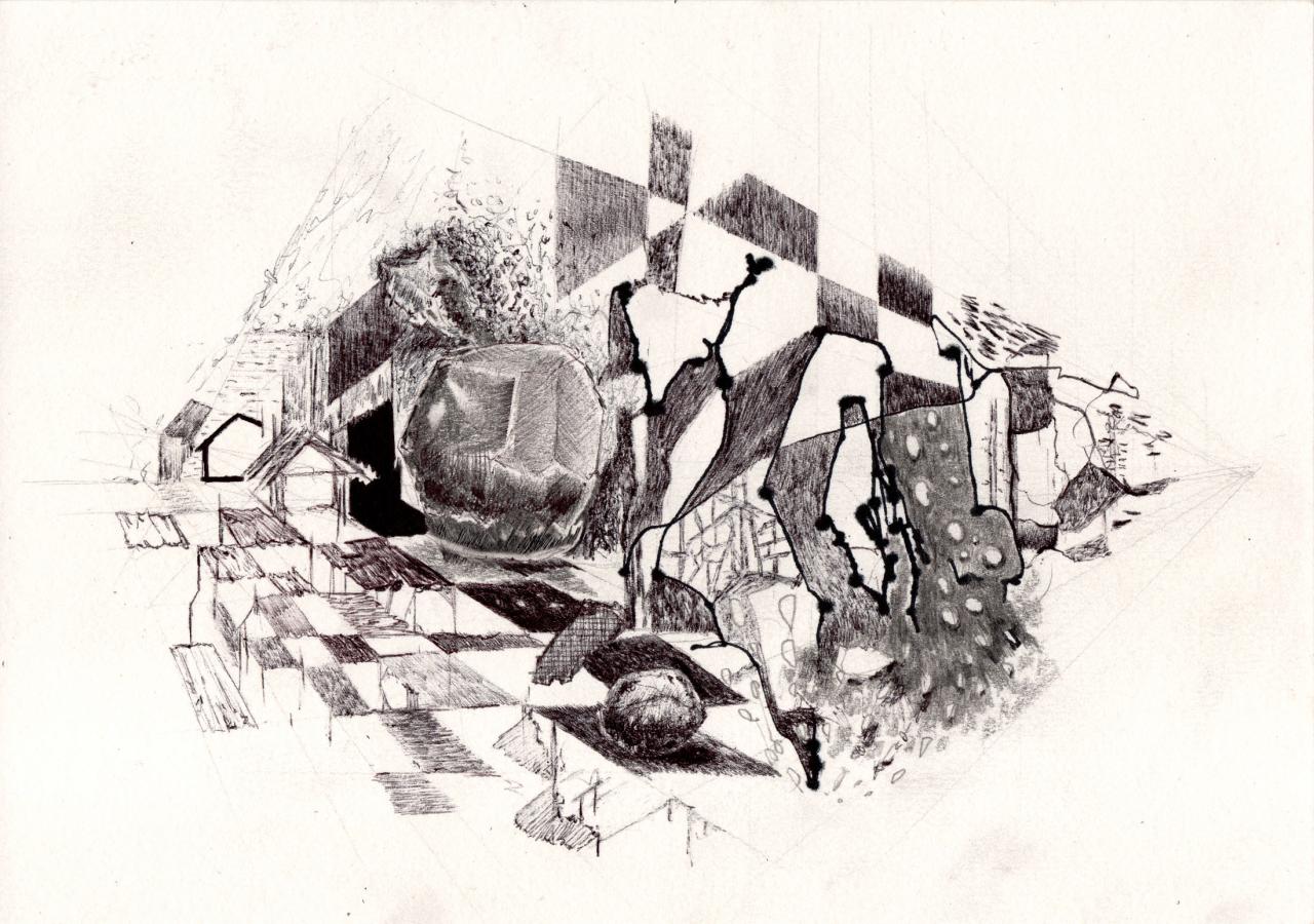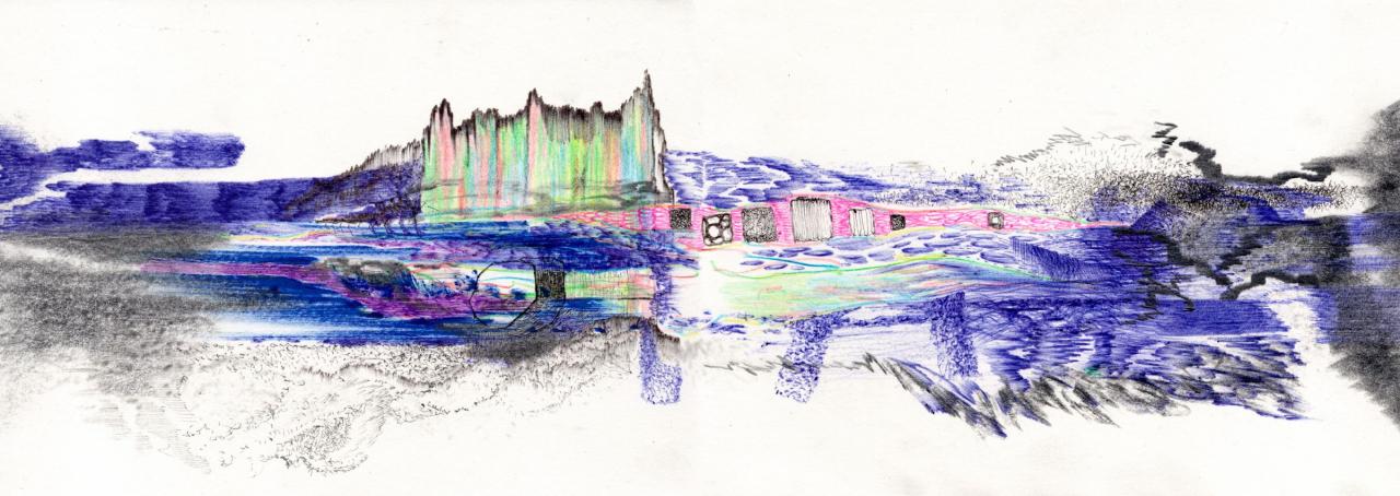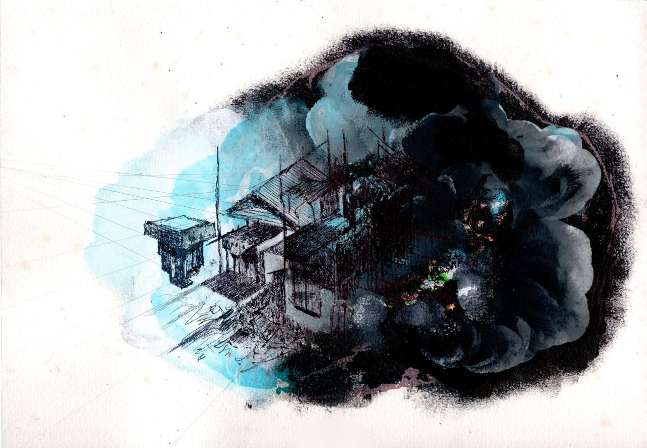 « (…) Pour C’EST UN GRAND TERRAIN DE NULLE PART, tout est parti de croquis de lieux imaginaires que j’ai combinés avec des croquis de détails de lieux réels que j’avais visités (usines, temples, cases créoles abandonnées…). Je les dessinais souvent sur place, rapidement, de façon nerveuse, puis j’en sélectionnais certaines parties pour les retravailler et les assembler à d’autres, comme si je travaillais avec des calques. Peu à peu, une nouvelle étape s’est imposée : une extension des dessins à travers la vidéo d’animation 2D et 3D. Je me suis demandé : qu’est-ce que ça ferait de voir ces lieux, ces architectures dessinées s’animer et prendre vie ? L’idée d’une architecture vivante — au sens d’animée ou habitée par un esprit — m’a toujours fasciné. Qu’il s’agisse du cinéma (Amityville, Poltergeist, Playtime, One Week, Mon Oncle, Shining) ou de l’écriture (Les Cités obscures de Schuiten, Ici de Richard McGuire, ou le roman La Maison des feuilles), je reste profondément attiré par le motif de la maison vivante.