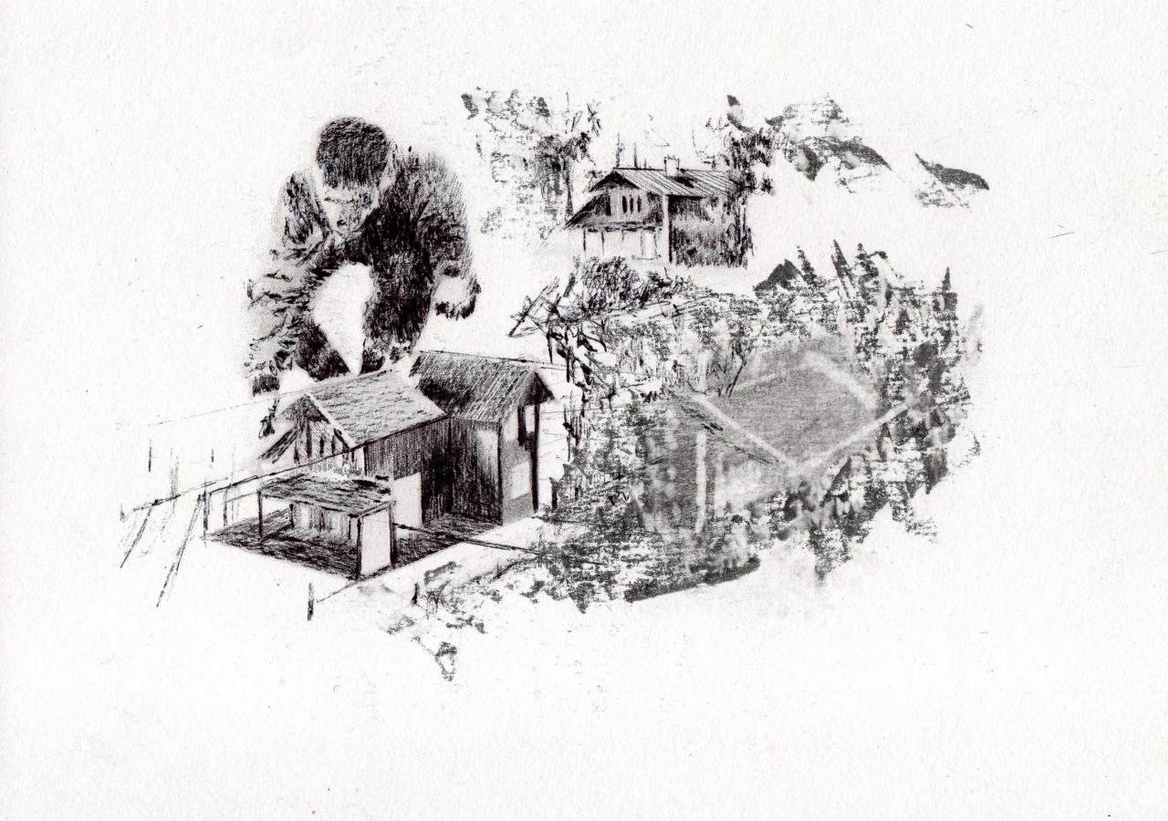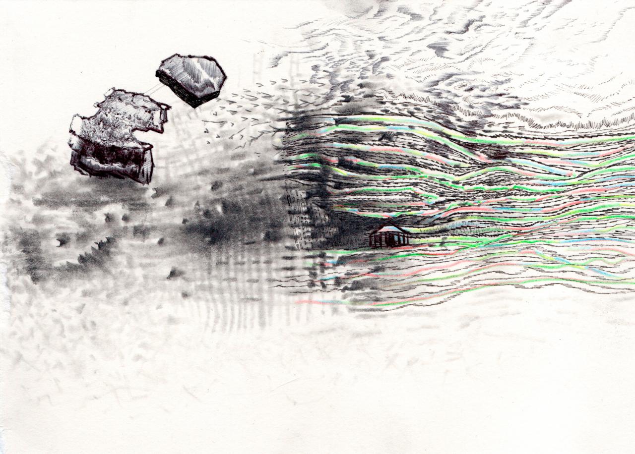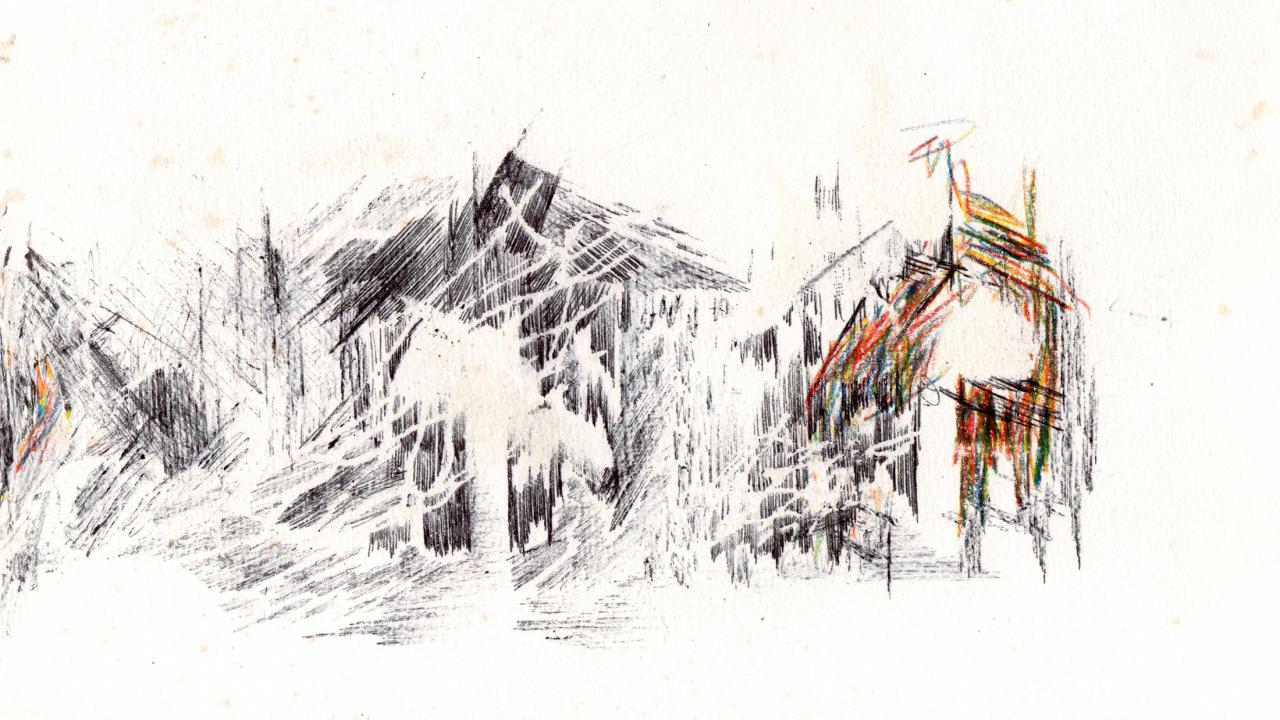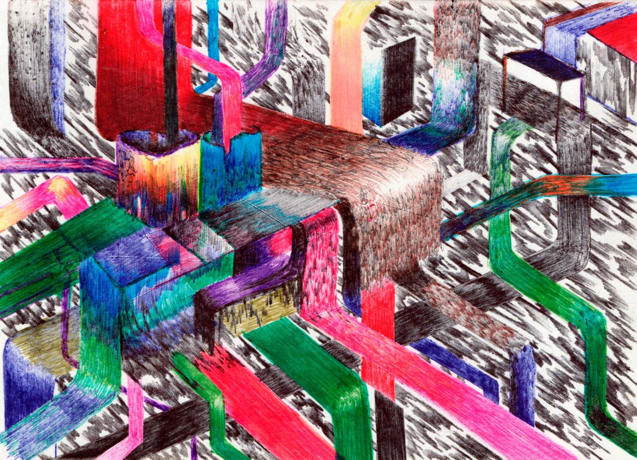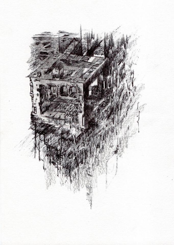 « (…) Pour C’EST UN GRAND TERRAIN DE NULLE PART, tout est parti de croquis de lieux imaginaires que j’ai combinés avec des croquis de détails de lieux réels que j’avais visités (usines, temples, cases créoles abandonnées…). Je les dessinais souvent sur place, rapidement, de façon nerveuse, puis j’en sélectionnais certaines parties pour les retravailler et les assembler à d’autres, comme si je travaillais avec des calques. Peu à peu, une nouvelle étape s’est imposée : une extension des dessins à travers la vidéo d’animation 2D et 3D. Je me suis demandé : qu’est-ce que ça ferait de voir ces lieux, ces architectures dessinées s’animer et prendre vie ? L’idée d’une architecture vivante — au sens d’animée ou habitée par un esprit — m’a toujours fasciné. Qu’il s’agisse du cinéma (Amityville, Poltergeist, Playtime, One Week, Mon Oncle, Shining) ou de l’écriture (Les Cités obscures de Schuiten, Ici de Richard McGuire, ou le roman La Maison des feuilles), je reste profondément attiré par le motif de la maison vivante.