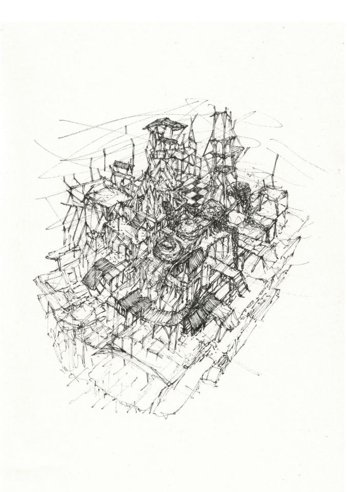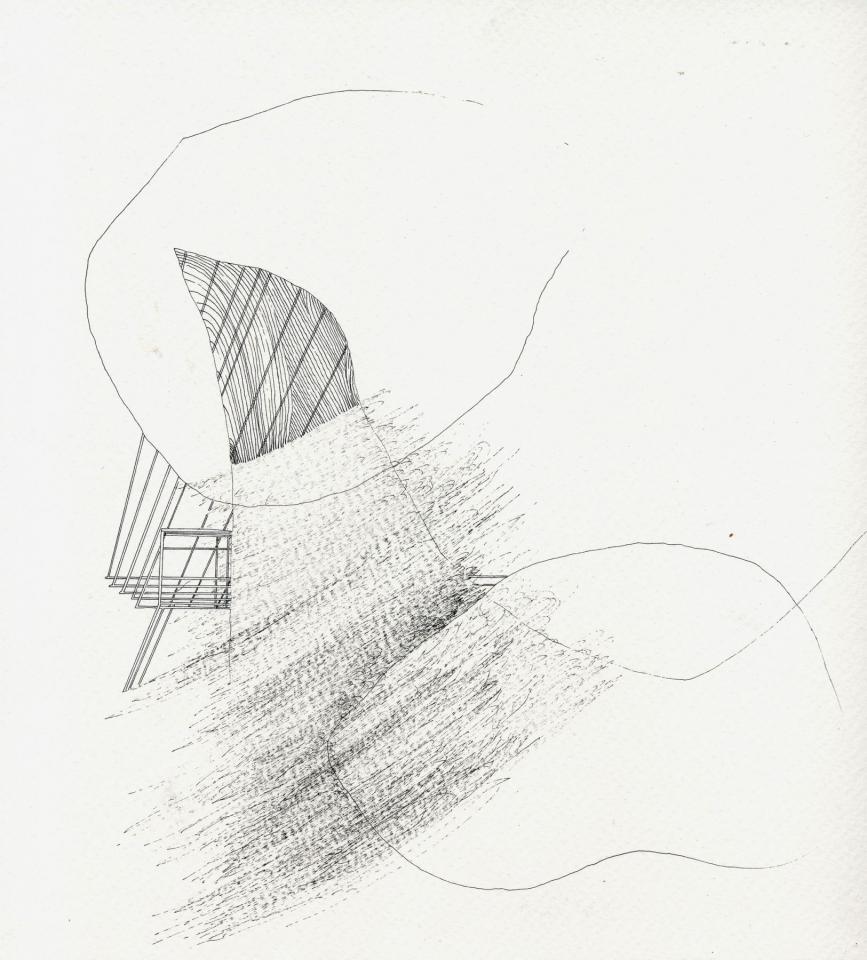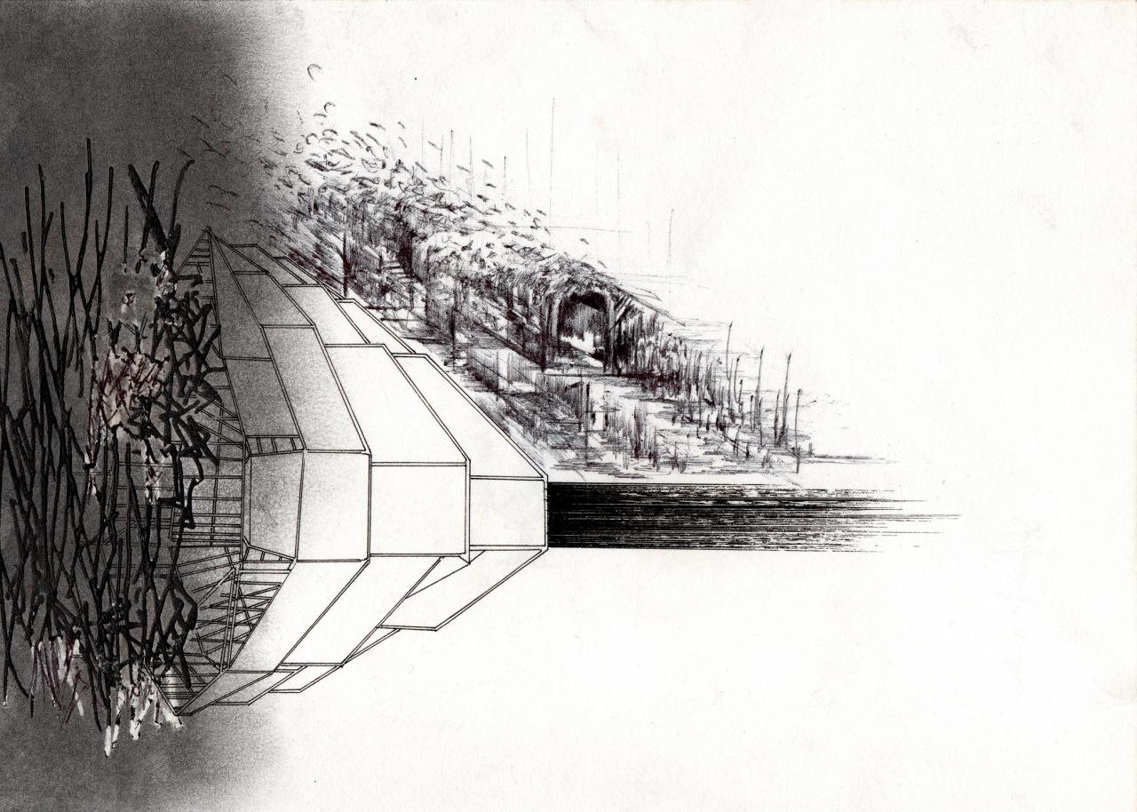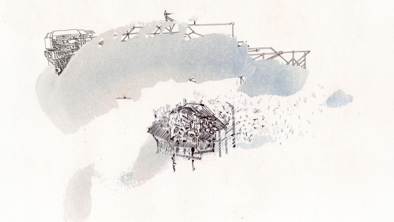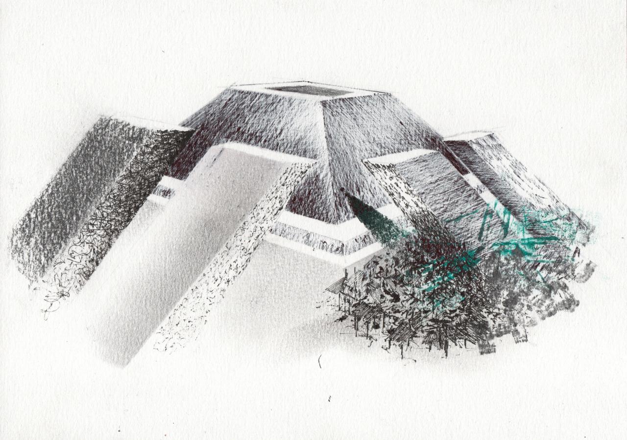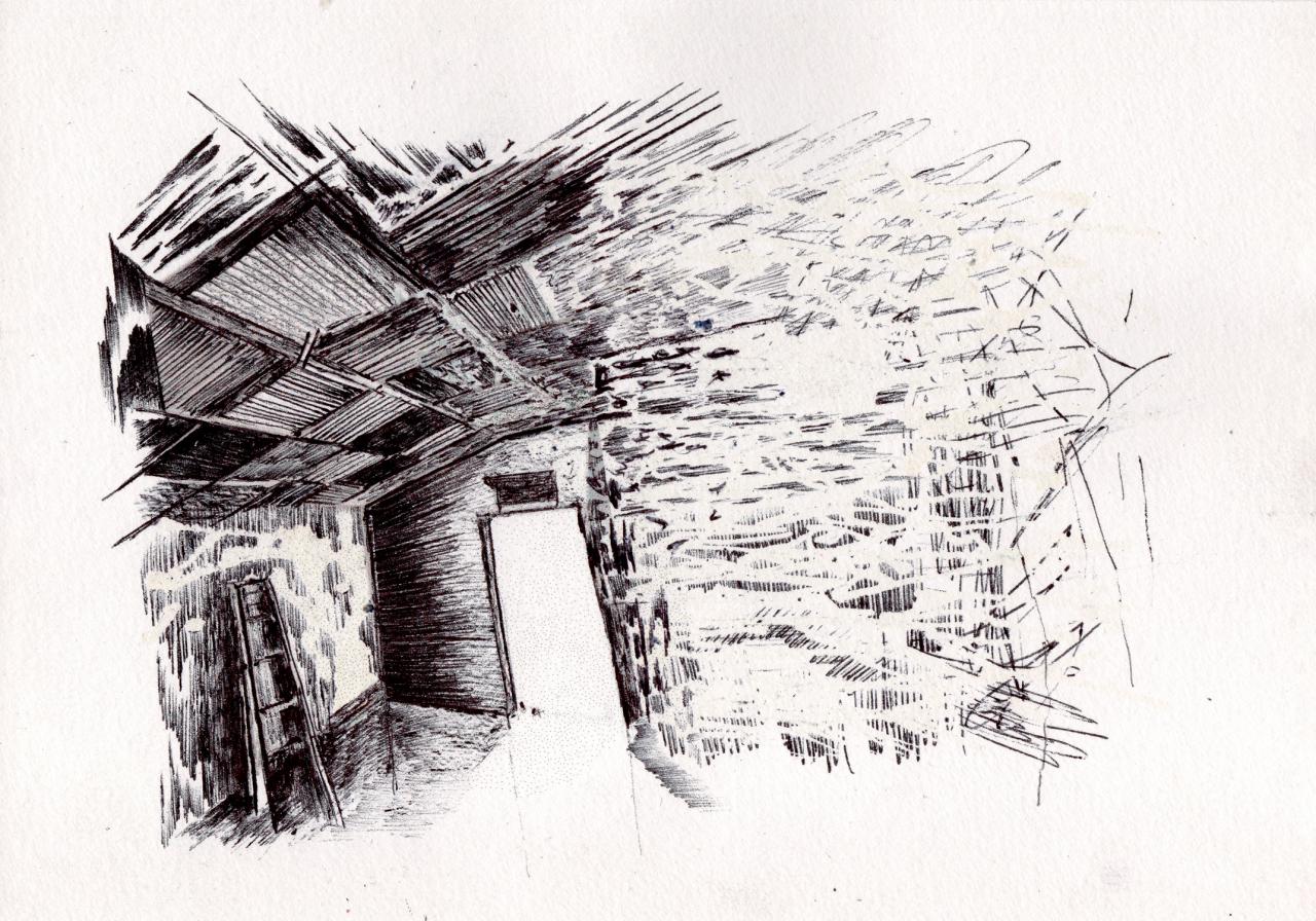 « (…) Pour C’EST UN GRAND TERRAIN DE NULLE PART, tout est parti de croquis de lieux imaginaires que j’ai combinés avec des croquis de détails de lieux réels que j’avais visités (usines, temples, cases créoles abandonnées…). Je les dessinais souvent sur place, rapidement, de façon nerveuse, puis j’en sélectionnais certaines parties pour les retravailler et les assembler à d’autres, comme si je travaillais avec des calques. Peu à peu, une nouvelle étape s’est imposée : une extension des dessins à travers la vidéo d’animation 2D et 3D. Je me suis demandé : qu’est-ce que ça ferait de voir ces lieux, ces architectures dessinées s’animer et prendre vie ? L’idée d’une architecture vivante — au sens d’animée ou habitée par un esprit — m’a toujours fasciné. Qu’il s’agisse du cinéma (Amityville, Poltergeist, Playtime, One Week, Mon Oncle, Shining) ou de l’écriture (Les Cités obscures de Schuiten, Ici de Richard McGuire, ou le roman La Maison des feuilles), je reste profondément attiré par le motif de la maison vivante.