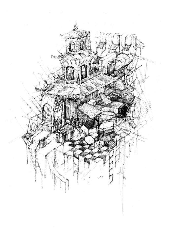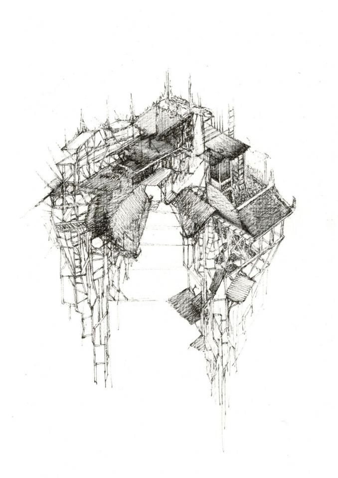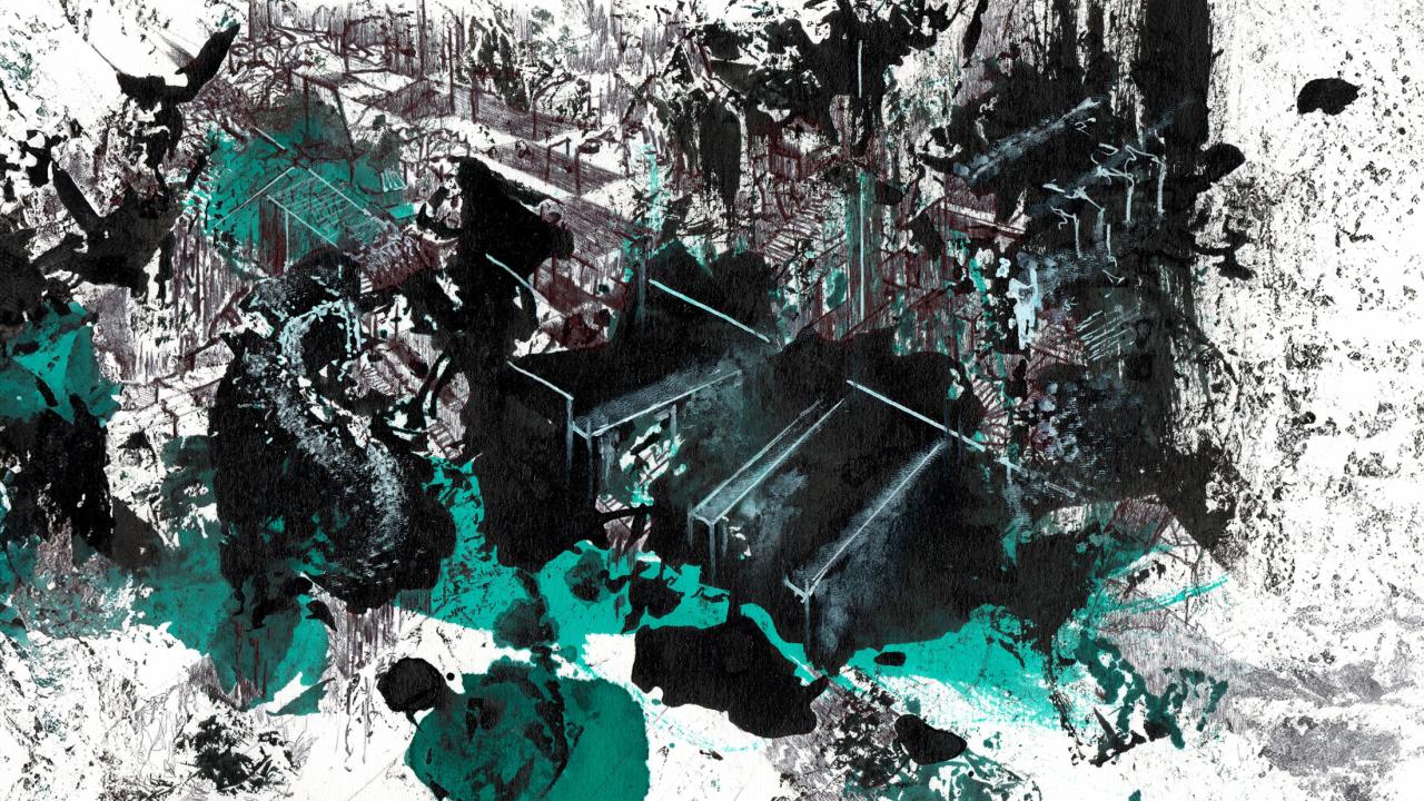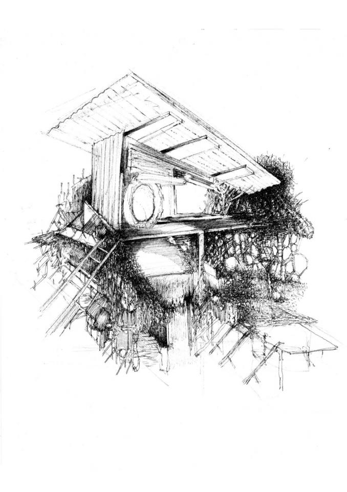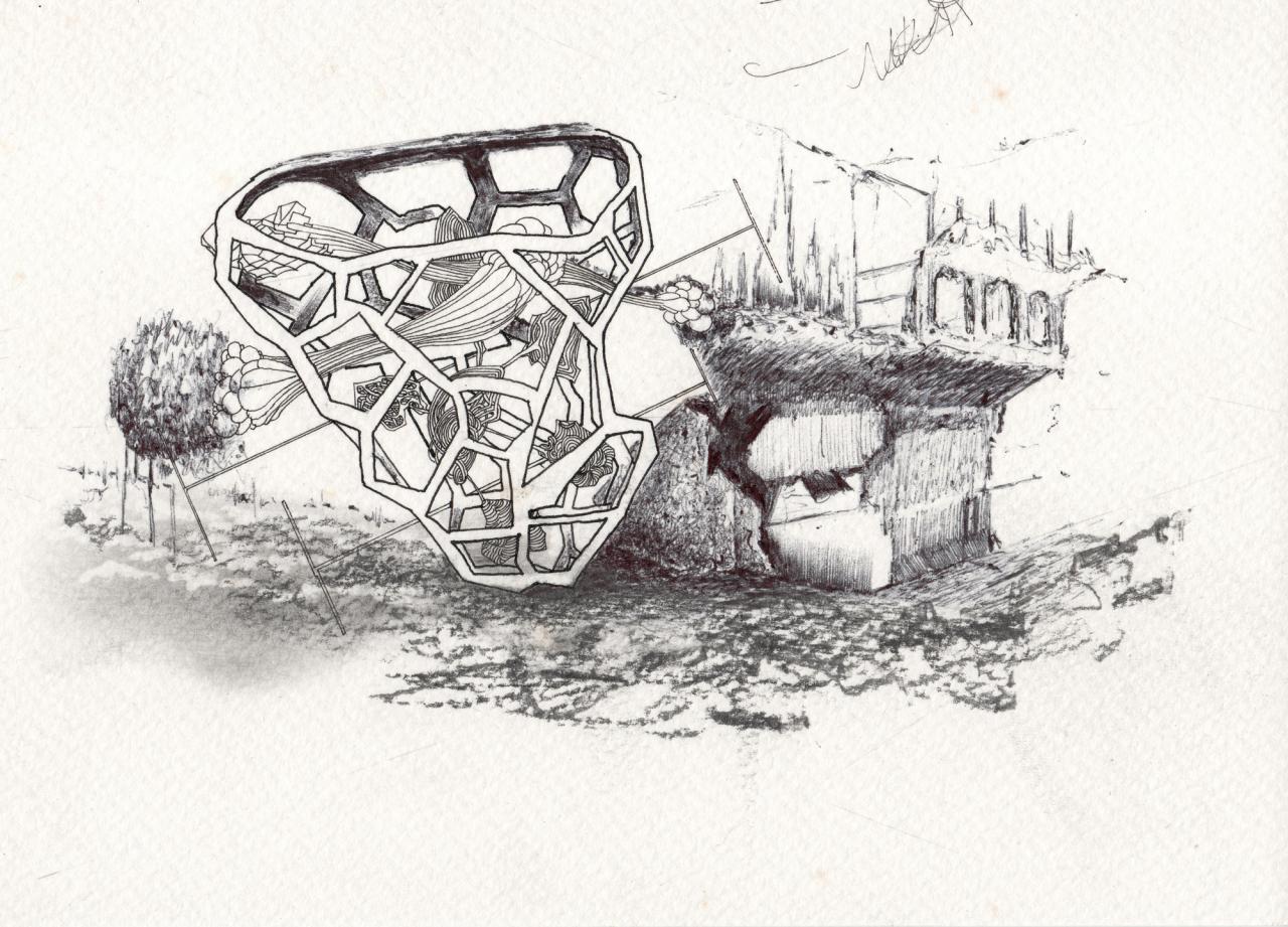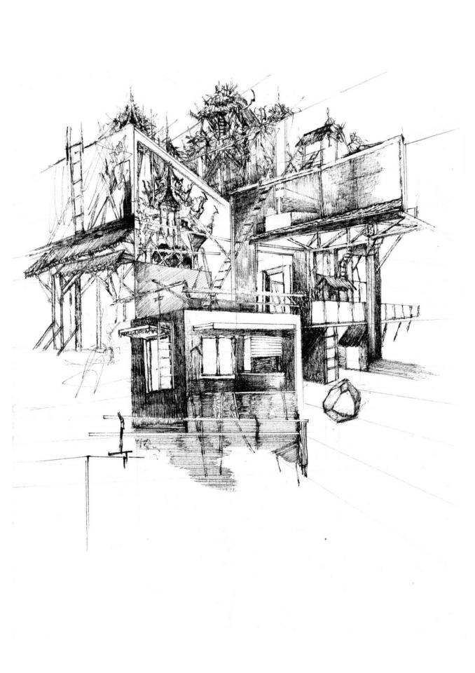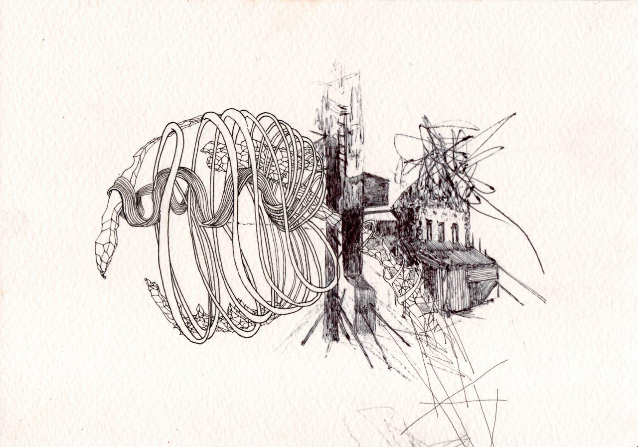 « (…) Pour C’EST UN GRAND TERRAIN DE NULLE PART, tout est parti de croquis de lieux imaginaires que j’ai combinés avec des croquis de détails de lieux réels que j’avais visités (usines, temples, cases créoles abandonnées…). Je les dessinais souvent sur place, rapidement, de façon nerveuse, puis j’en sélectionnais certaines parties pour les retravailler et les assembler à d’autres, comme si je travaillais avec des calques. Peu à peu, une nouvelle étape s’est imposée : une extension des dessins à travers la vidéo d’animation 2D et 3D. Je me suis demandé : qu’est-ce que ça ferait de voir ces lieux, ces architectures dessinées s’animer et prendre vie ? L’idée d’une architecture vivante — au sens d’animée ou habitée par un esprit — m’a toujours fasciné. Qu’il s’agisse du cinéma (Amityville, Poltergeist, Playtime, One Week, Mon Oncle, Shining) ou de l’écriture (Les Cités obscures de Schuiten, Ici de Richard McGuire, ou le roman La Maison des feuilles), je reste profondément attiré par le motif de la maison vivante.